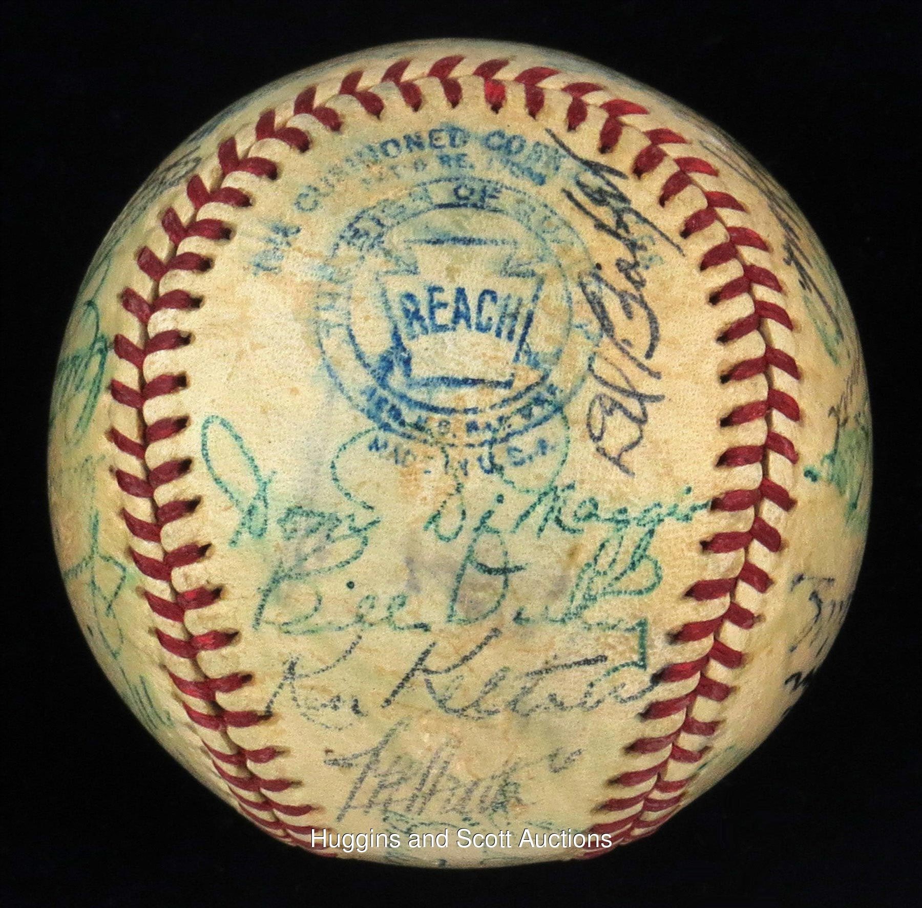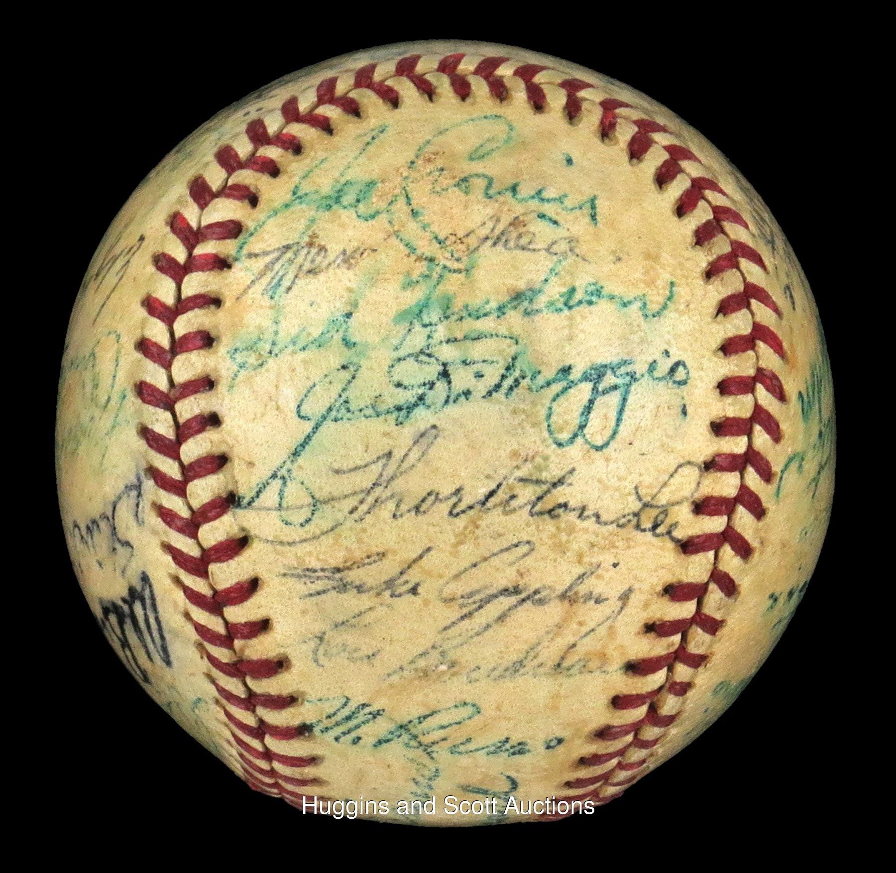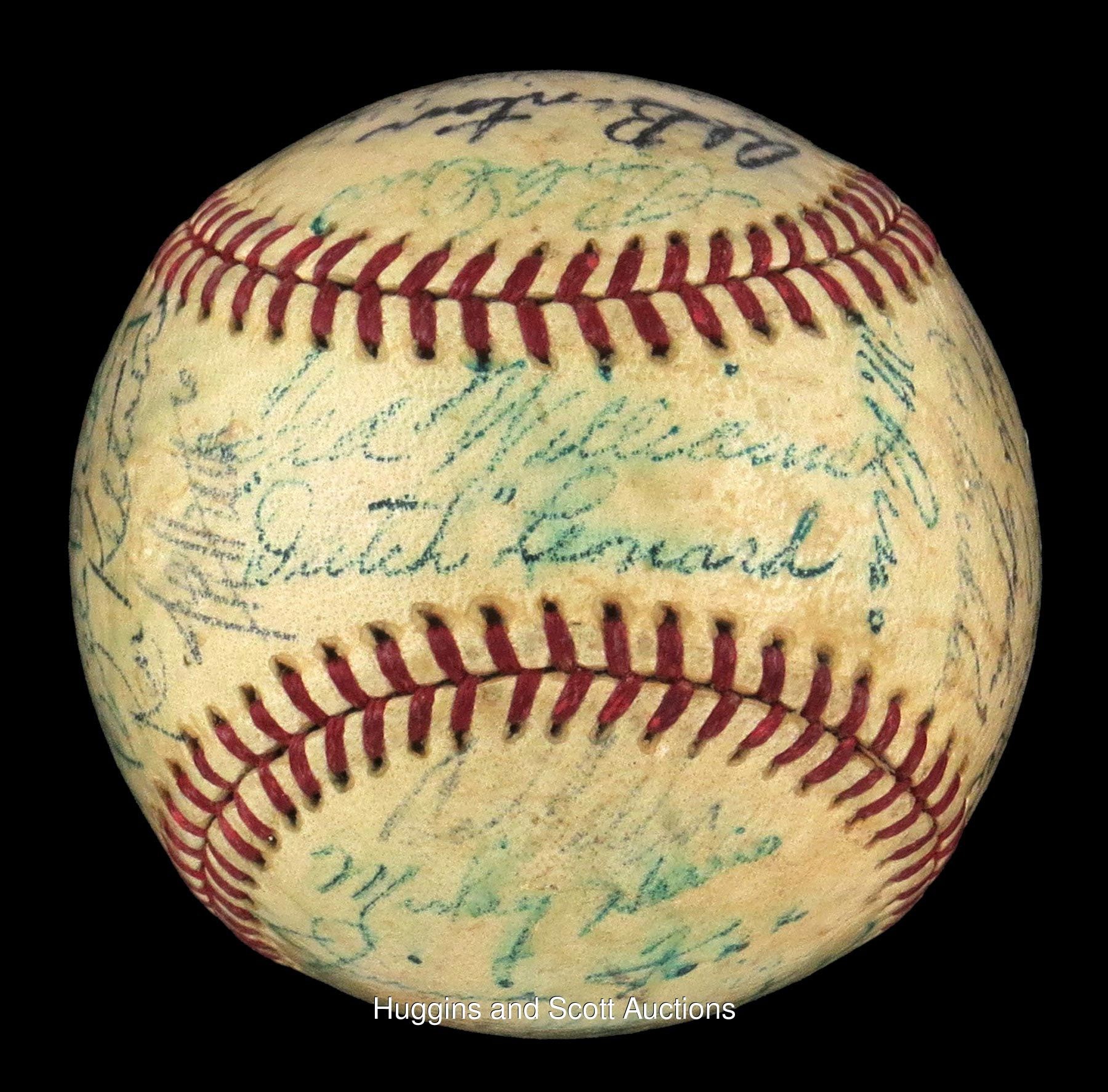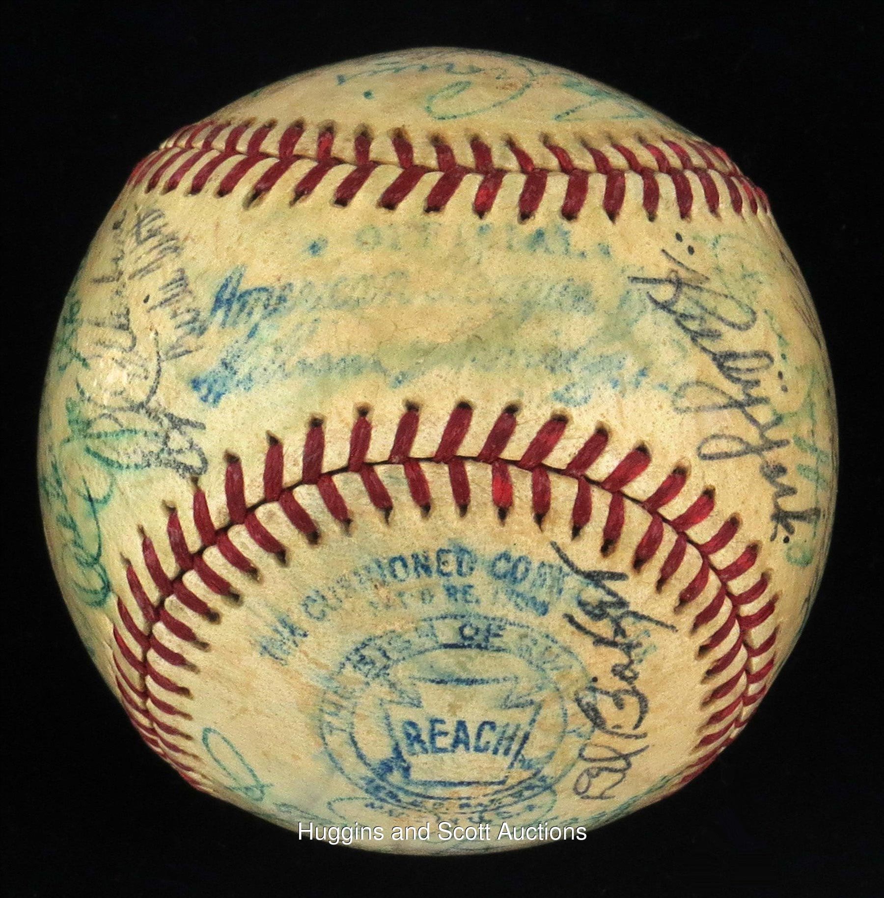 Teddy Ballgame drove in 4 of the junior circuit"s 7 runs in their win at Briggs Stadium. This shellacked, medium-toned OAL (Harridge) features "5-7" signatures. Sweet Spot: Williams ("6"), Dutch Leonard North Panel: Doerr, Al Benton, Steve O"Neill, Frank Hayes, Charlie Keller, Eddie Smith, Ruffing, Rudy York South Panel: Mickey Harris, Foxx ("7-8"), Cecil Travis, Art Fletcher, Gordon, Roy Cullenbine, Birdie Tebbetts West Panel: Del Baker, Dom DiMaggio, Dickey, Ken Keltner, Rudy York East Panel: Cronin, M. Shea (d.1953), Sid Hudson, DiMaggio ("7-8"), Thornton Lee, Appling, Boudreau, Russo Full LOA from JSA.