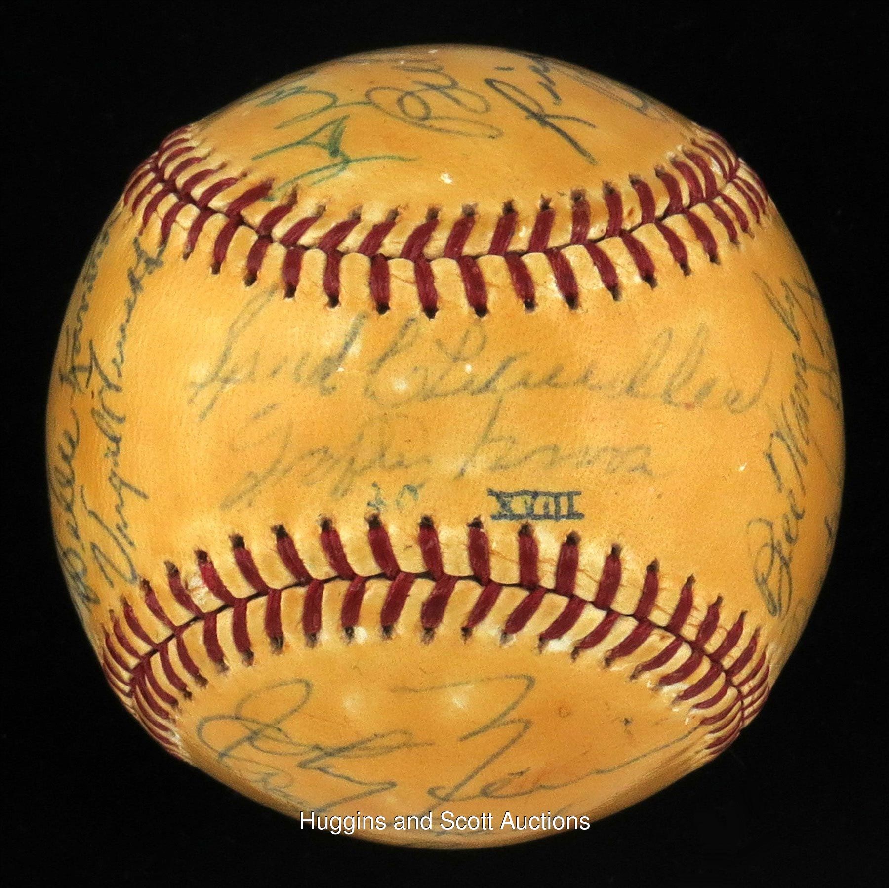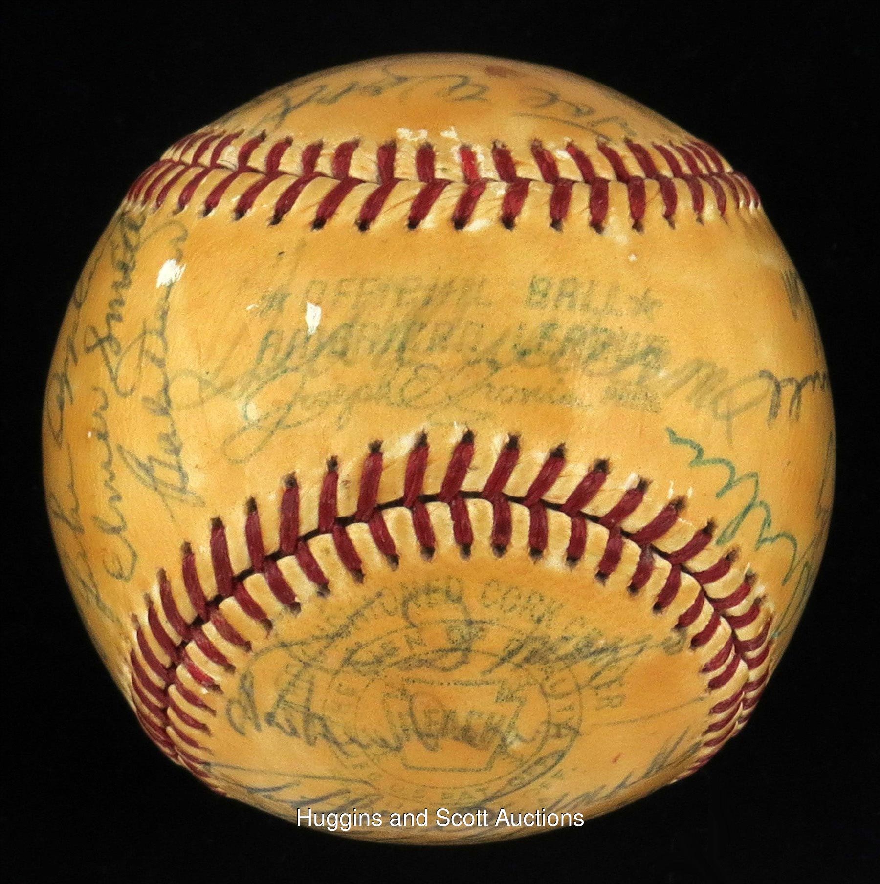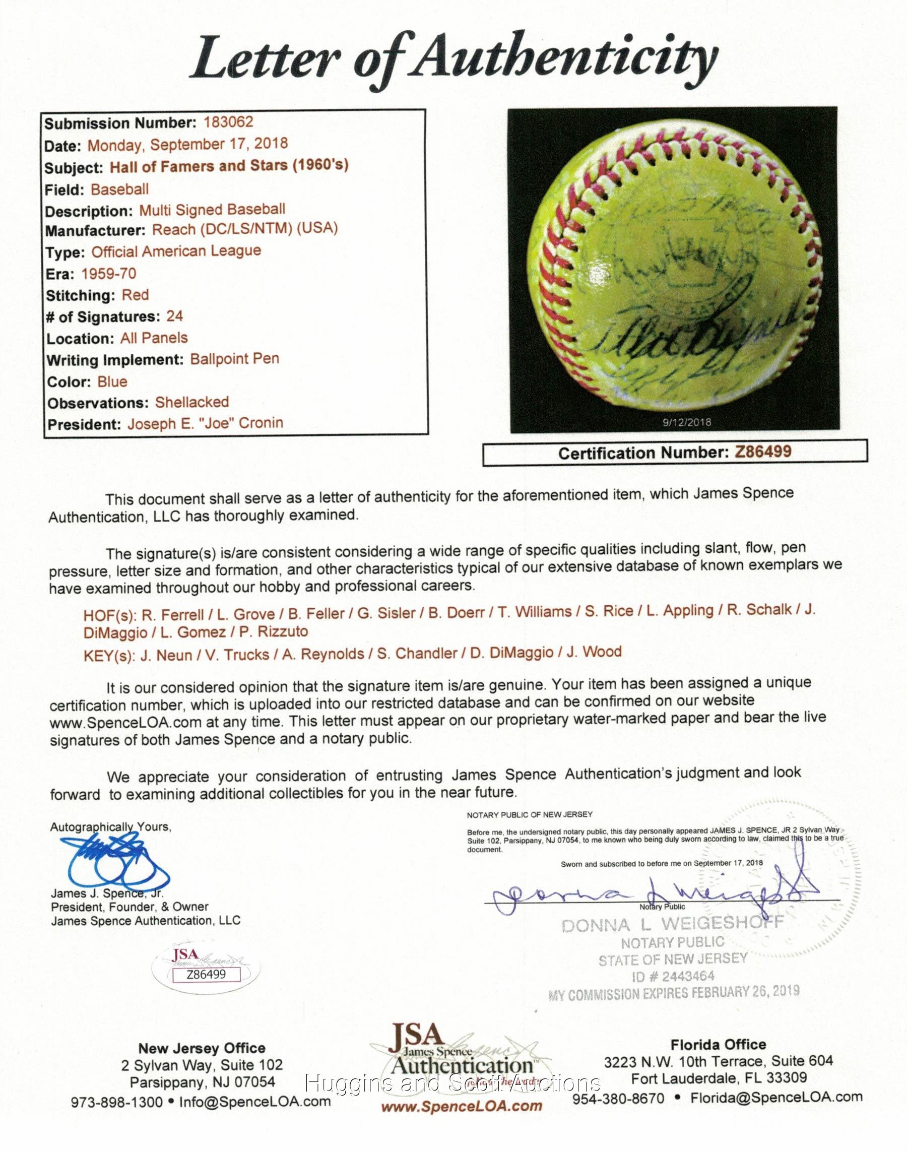 A shellacked, medium-to-darkly toned OAL (Cronin) ball with "6-8" signatures. Sweet Spot: Spud Chandler, Grove North Panel: Sisler, Bill Wambsganss, Ferrell, Feller South Panel: Johnny Neun, Schalk, Rice, Appling, Elmer Smith, Doerr West Panel: DiMaggio ("5"), Newhouser, Allie Reynolds, Gomez, Willie Kamm, Virgil Trucks East Panel: Bill Wambsganss, Hoyt, Rizzuto, Joe Wood, Dom DiMaggio Opposite Sweet Spot: T. Williams ("3") Full LOA from JSA.