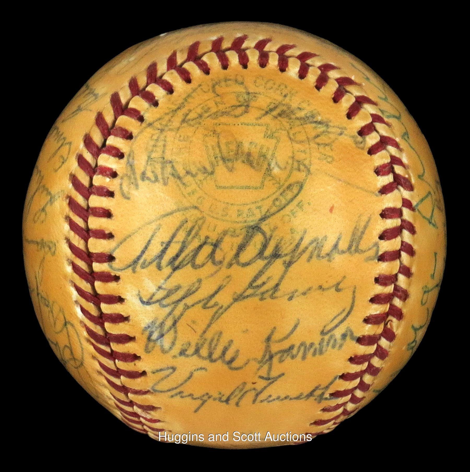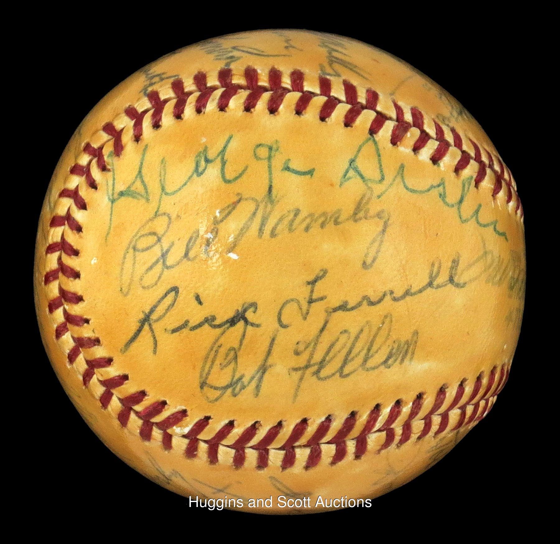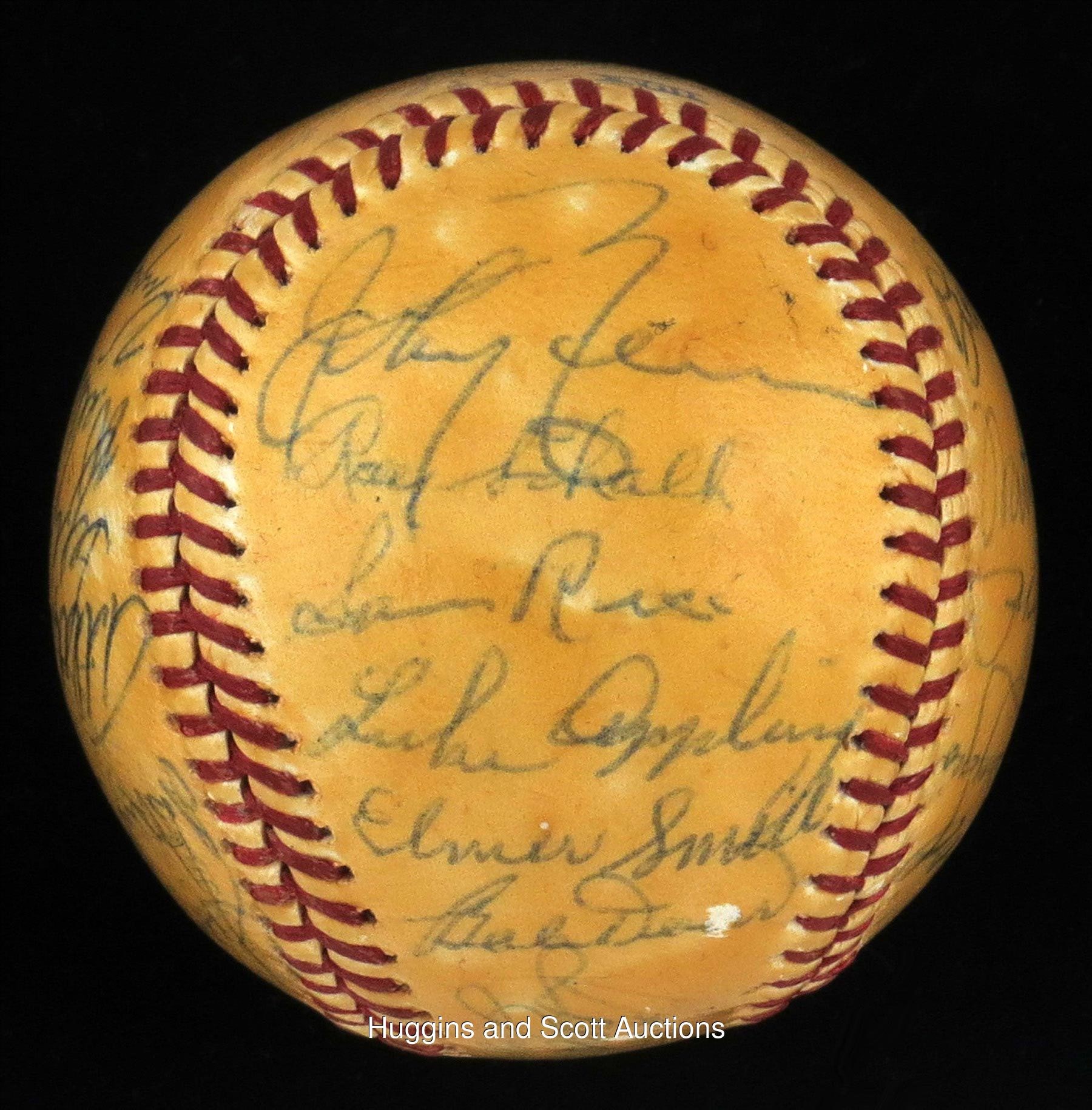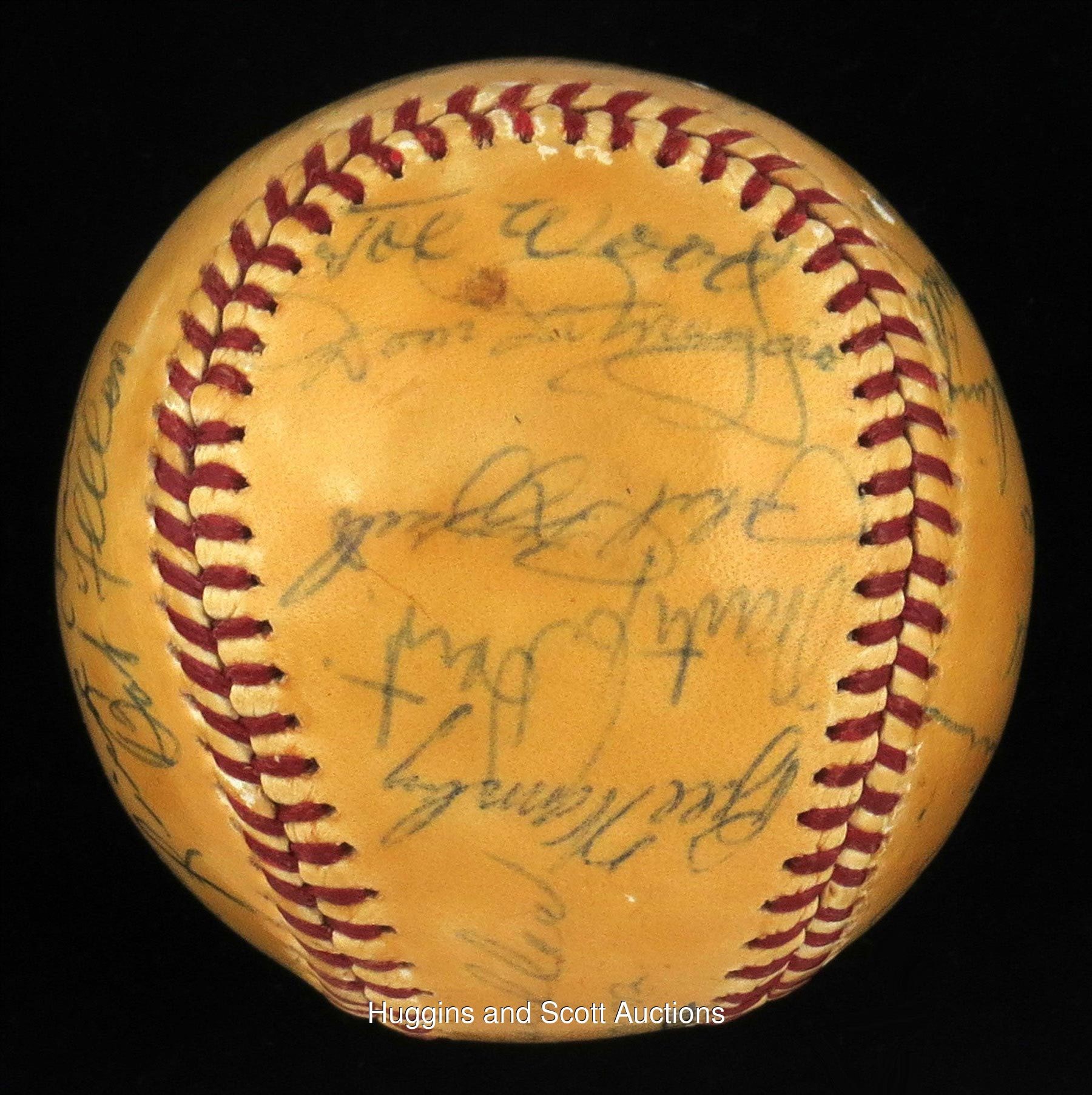 A shellacked, medium-to-darkly toned OAL (Cronin) ball with "6-8" signatures. Sweet Spot: Spud Chandler, Grove North Panel: Sisler, Bill Wambsganss, Ferrell, Feller South Panel: Johnny Neun, Schalk, Rice, Appling, Elmer Smith, Doerr West Panel: DiMaggio ("5"), Newhouser, Allie Reynolds, Gomez, Willie Kamm, Virgil Trucks East Panel: Bill Wambsganss, Hoyt, Rizzuto, Joe Wood, Dom DiMaggio Opposite Sweet Spot: T. Williams ("3") Full LOA from JSA.