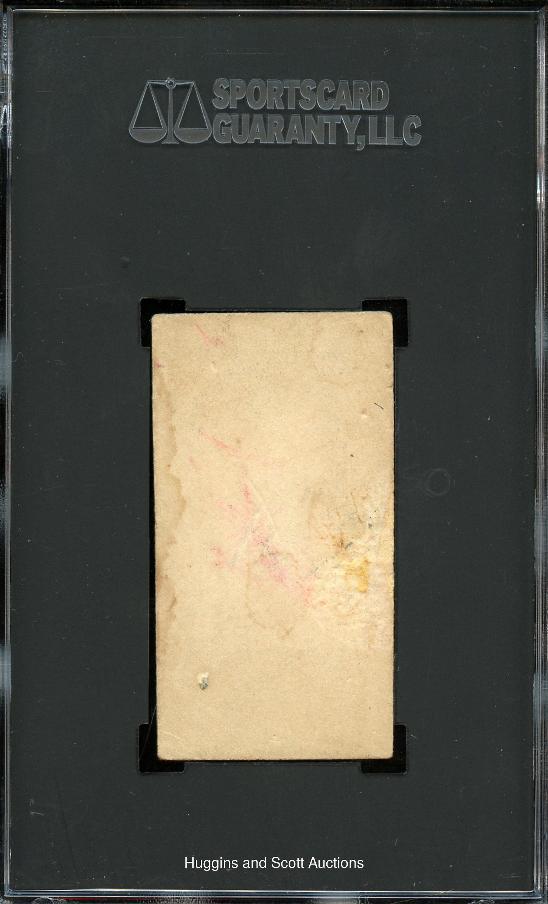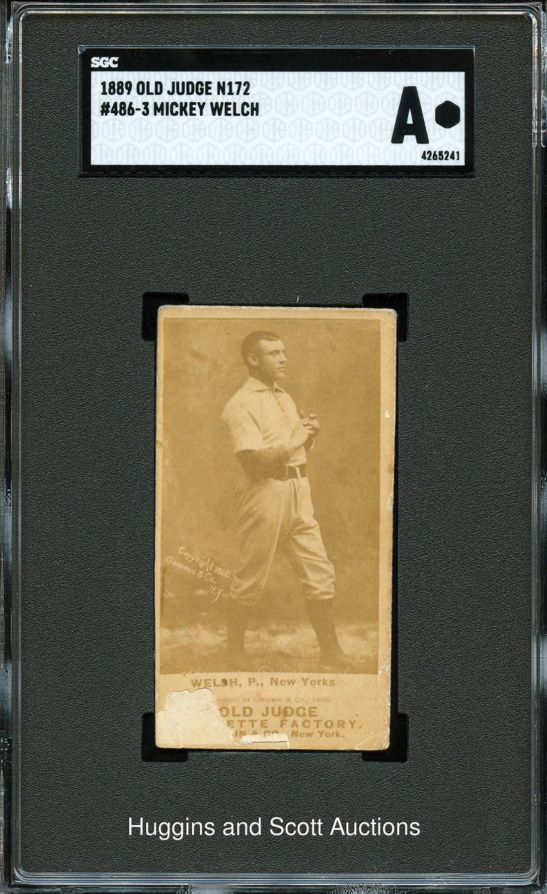 (Smiling) Mickey Welch is all business on his 1889 N172 Old Judge tobacco card. Graded Authentic by SGC and confirmed as pose #486-3. The prolific Hall of Famer is captured holding a baseball just prior to starting his windup. Despite significant paper loss near the bottom left corner and additional reverse paper loss/residue and writing, the all-important imagery is not compromised in the least.