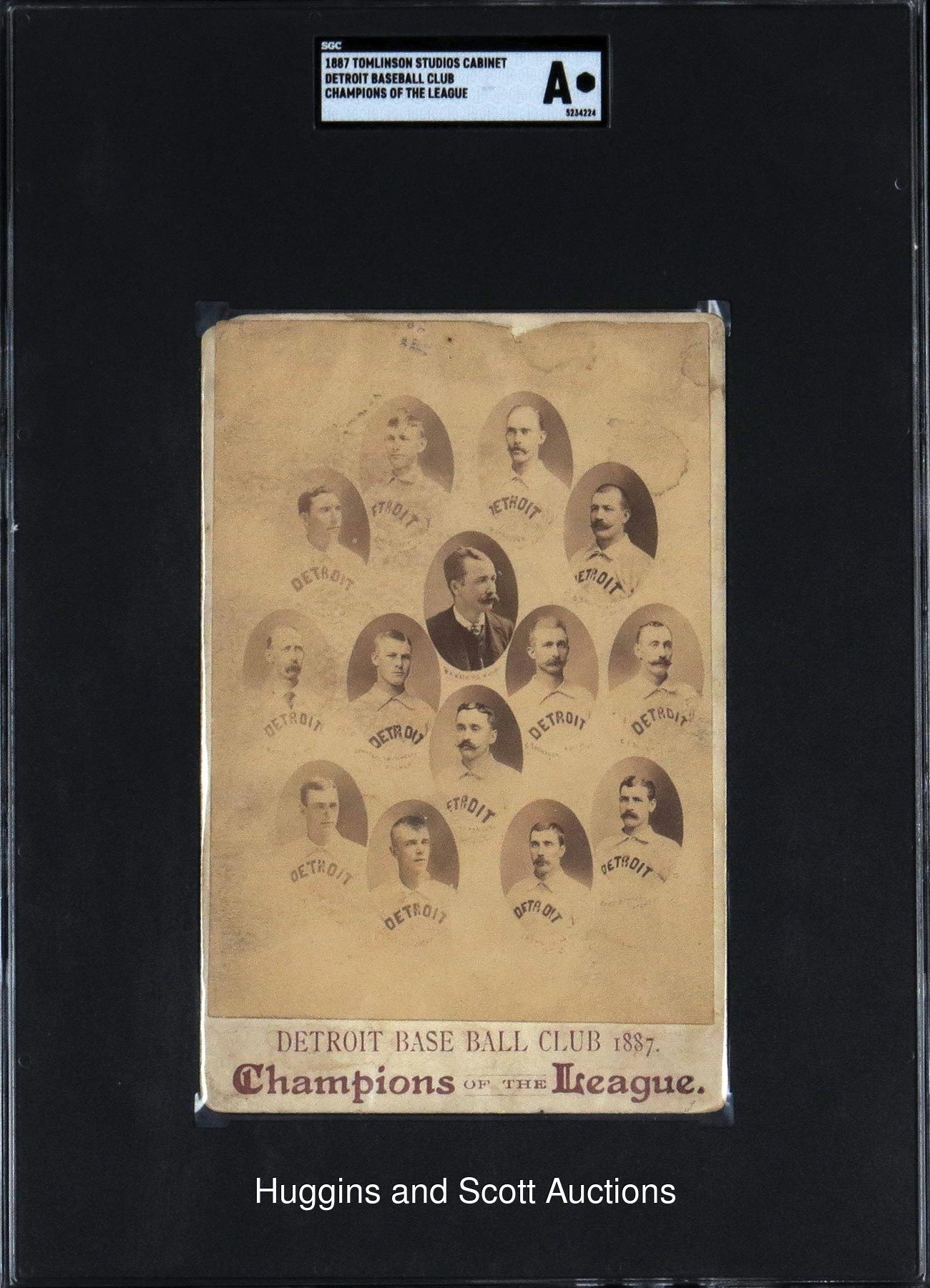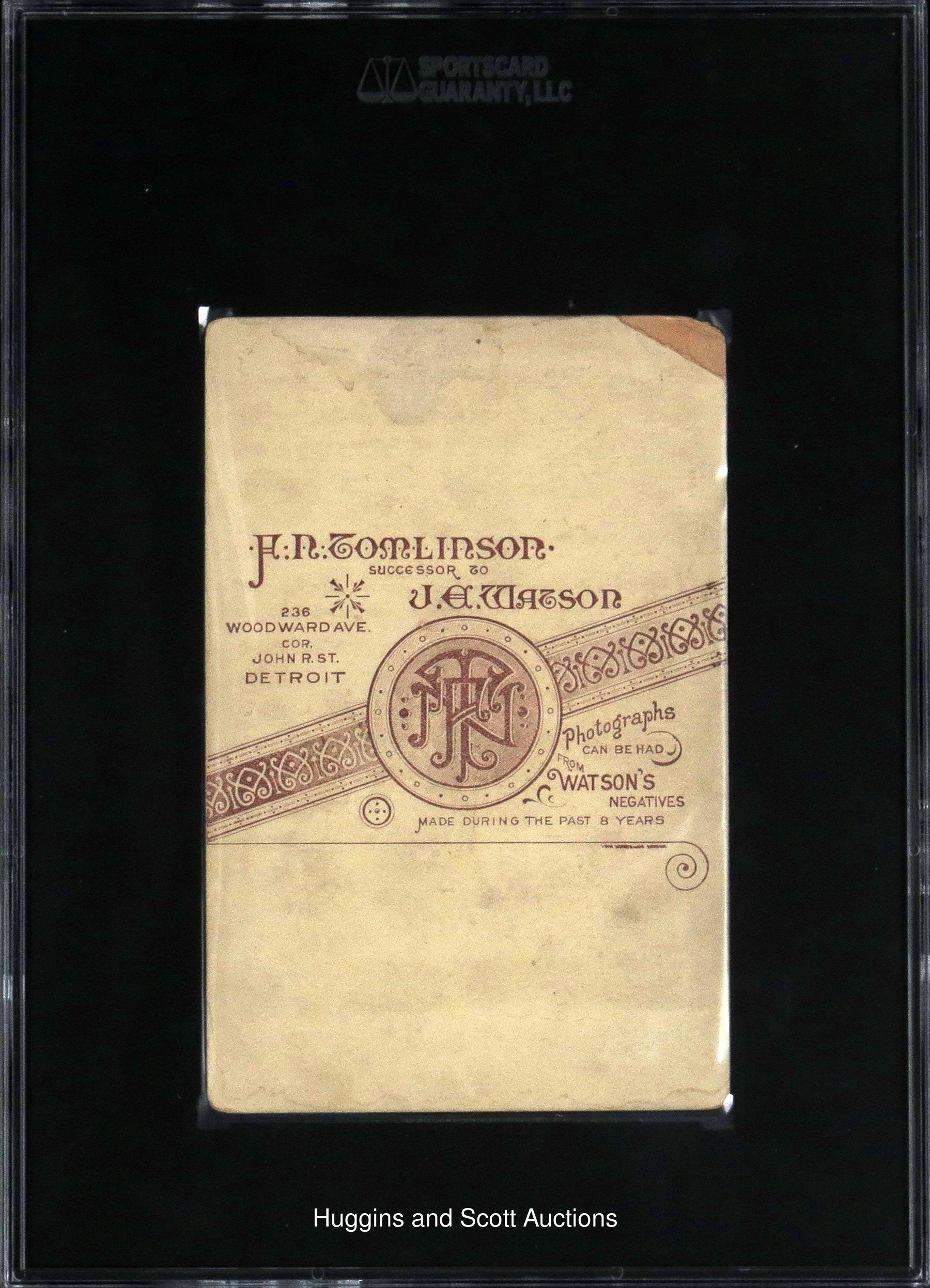 While the Ty Cobb-led Tigers – an American League juggernaut through the first decade of the 20th Century – were denied a World Series crown in three straight appearances, the city of Detroit had long-since laid claim to baseball supremacy. Powered by Hall of Famers Dan Brouthers, Deacon White, Ned Hanlon and Sam Thompson (the former two subsequently of legendary status with the Baltimore Orioles dynasty), the National League’s Detroit Wolverines were lauded as champions in 1887. From the era predating tobacco cards, this 1887 cabinet photo pays homage to that first-ever Motor City titlist. Encapsulated and assessed “Authentic” by SGC, the 4-1/4 x 6-1/2” heirloom features rounded corners and cameo composite likenesses of (14) Wolverines principals. Produced locally by the J.R. Tomlinson studio, the rare survivor portrays symmetrically arranged players in collared uniforms (with Canadian-born skipper Bill Watkins clad in a suit and necktie). Pictured are: Lady Baldwin, Charlie Bennett, Dan Brouthers, Pete Conway, Fred Dunlap, Charlie Ganzel, Charlie Getzien, Ned Hanlon, Hardy Richardson, Jack Rowe, Sam Thompson, Larry Twitchell and Deacon White. For an encore to their National League pennant, the Wolverines bested the American Association’s St. Louis Browns in a best of 15 World Series played in 10 different cities. Detroit actually clinched the title in 11 games over Charles Comiskey’s Browns, but completed the remaining four games for the sake of fans and gate receipts, winning 10 games to five. We report a small chip at the upper left corner, as well as faded printed player identifiers on this sepia-toned treasure whose scare population makes it a desirable artifact in any condition.
