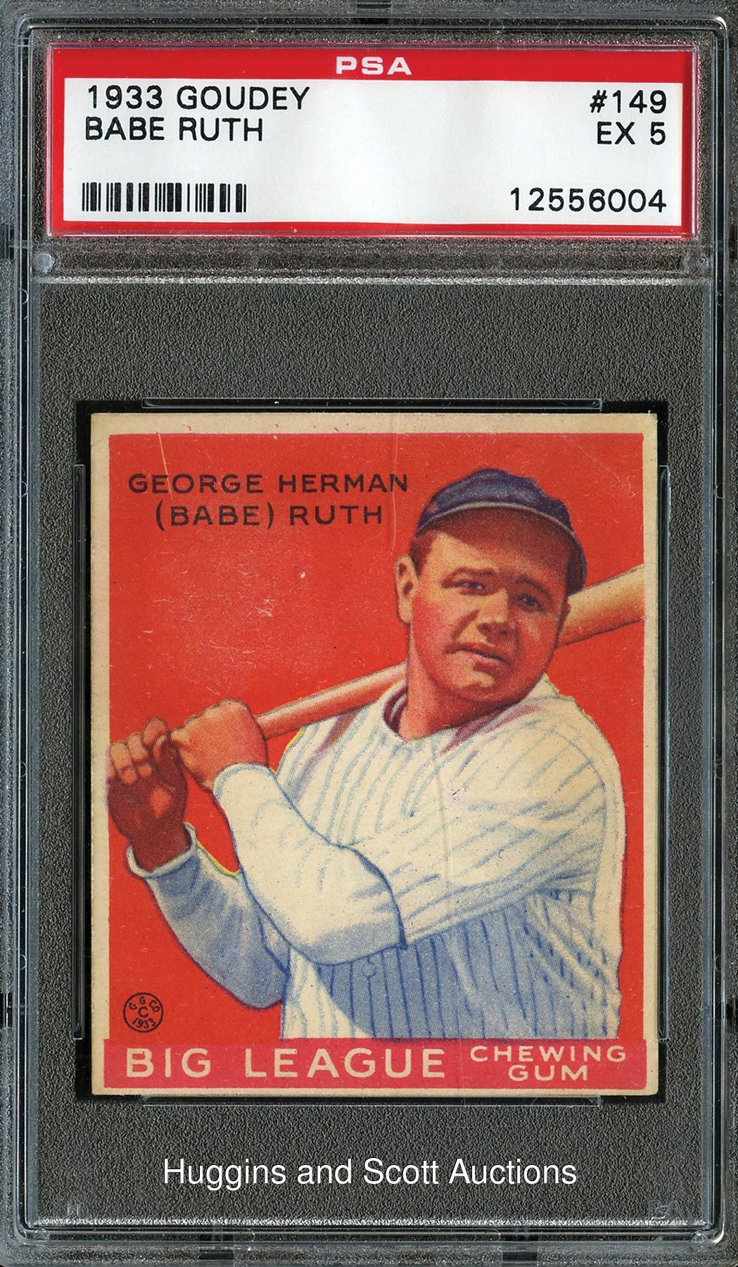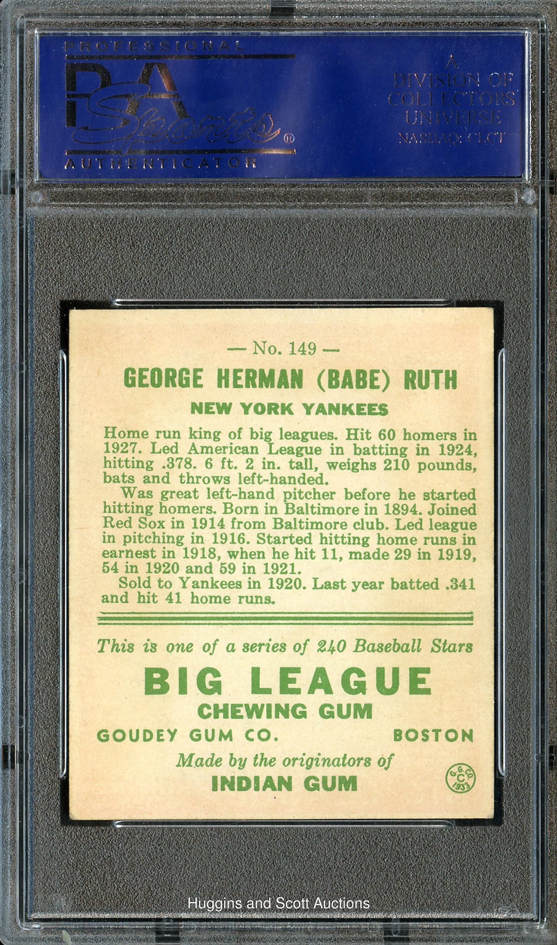 What"s better than one Babe Ruth card in a set? How about an even four! In their inaugural "Big League Chewing Gum" series, the Goudey Gum Co. of Boston capitalized on "The Bambino"s" popularity by picturing the slugger several times. Graded EX 5 by PSA. This #149 batting pose of the behemoth has largely escaped significant handling. The surface is crease-free and the Hall of Fame rendering is crisp with bold surface colors. Additionally, the green text reverse confirming Ruth as the "Home run king of the big leagues" is problem-free.