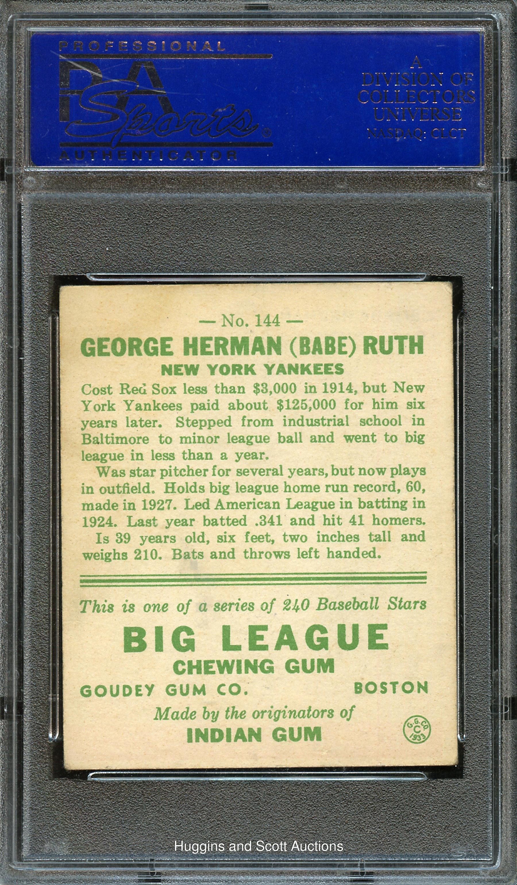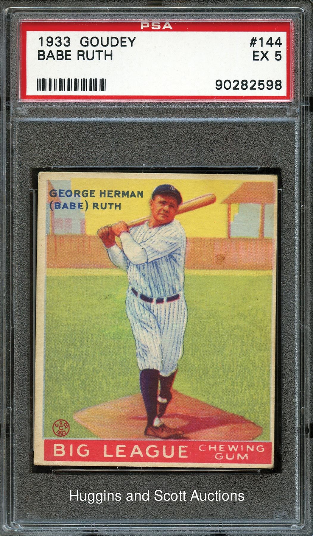 Which of the four 1933 Goudey Baseball Babe Ruth cards is your favorite? Regardless of the answer, the offered #144 batting pose is "one to get" for pre-war hobbyists. Graded EX 5 by PSA. This lightly handled cornerstone displays only slightly worn corners, off-white edges and perfectly contrasted player/setting registration. Despite limited soiling, the reverse detailing Ruth"s 1914 sale and early life/career is clean. Pull your bidding trigger on this "Sultan of Swat!"