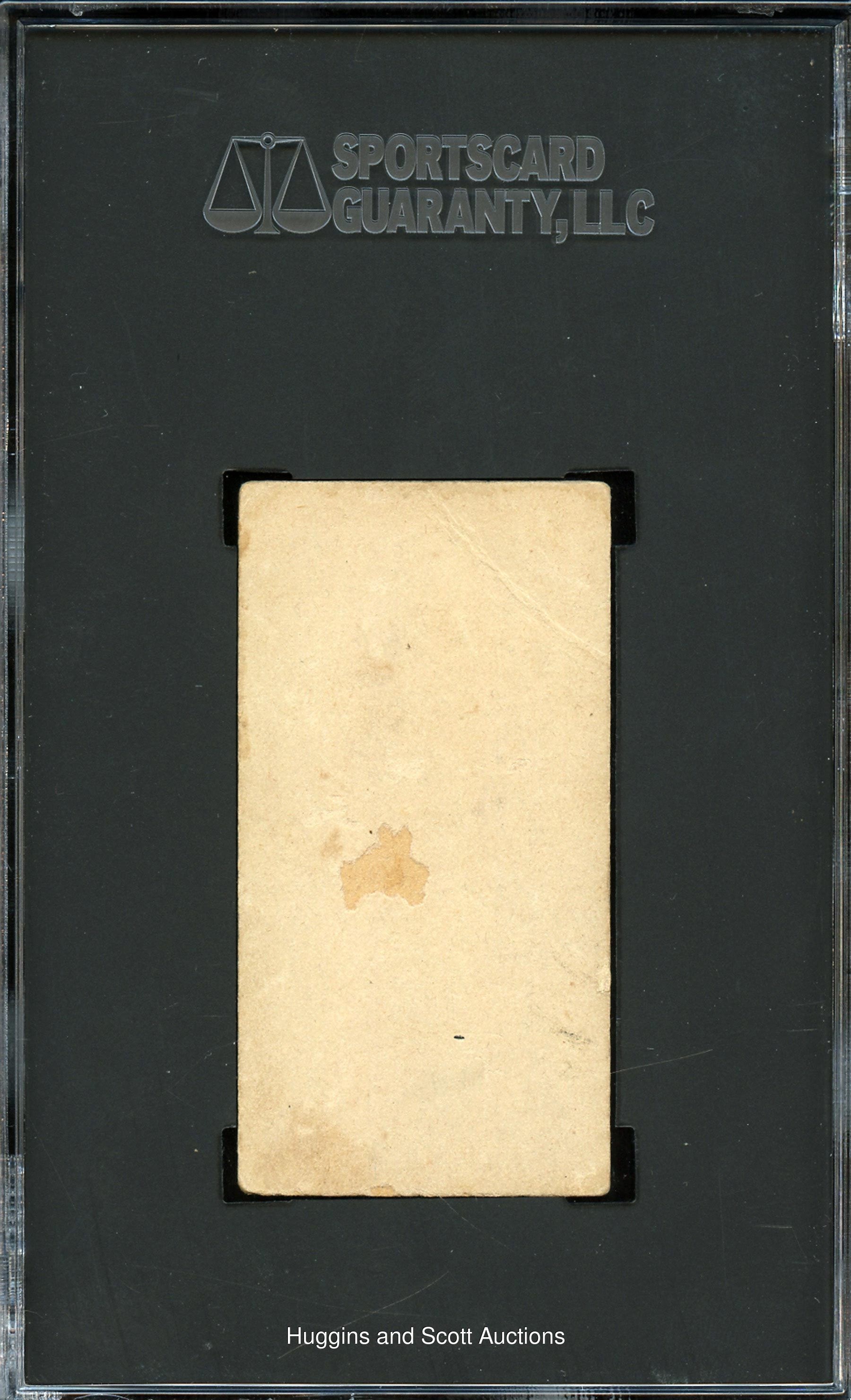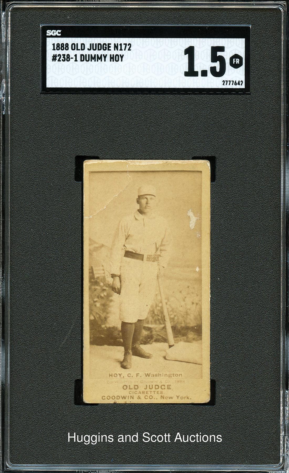 The unconquerable William (Dummy) Hoy stands tall on this 1888 N172 Old Judge tobacco card. Standing only 5" 4" tall and deaf, the Ohio native certainly had several obstacles to overcome. As stated in The Photographic Baseball Cards of Goodwin & Company (1886-1890) book, "Hoy was dealt lemons, but he made some great lemonade!" Graded 1.5 Fair by SGC. The star ball player is pictured as pose #238-1 and displays mild creasing near the upper left corner along with paper loss/residue on both the front and reverse. The 131 year-old sepia image is clean and the subject is instantly recognizable.