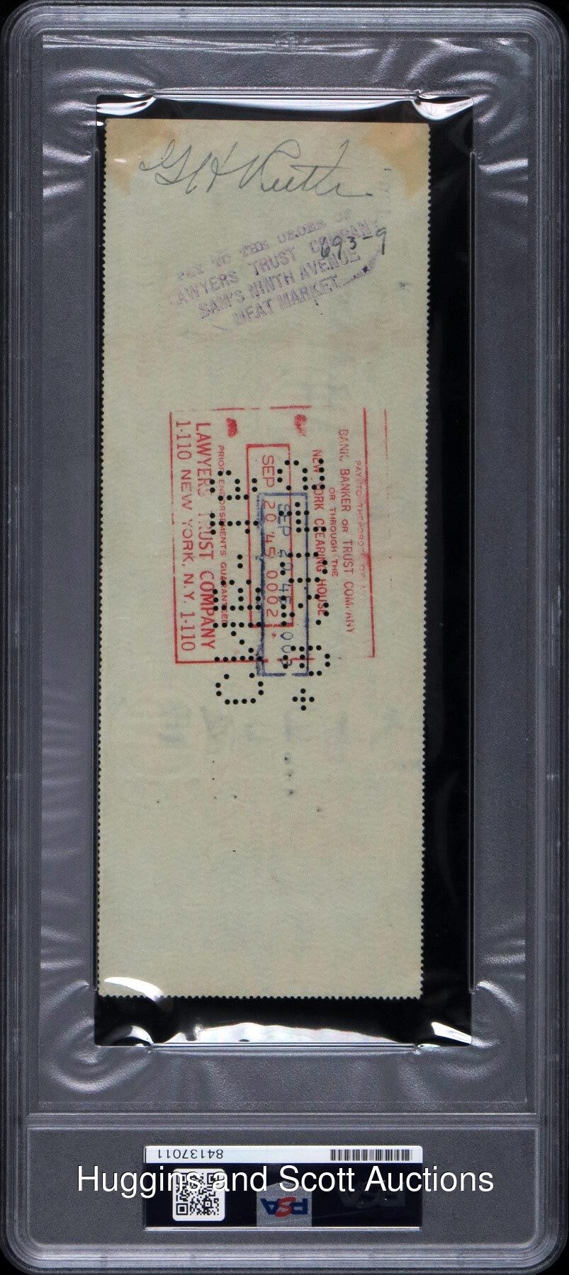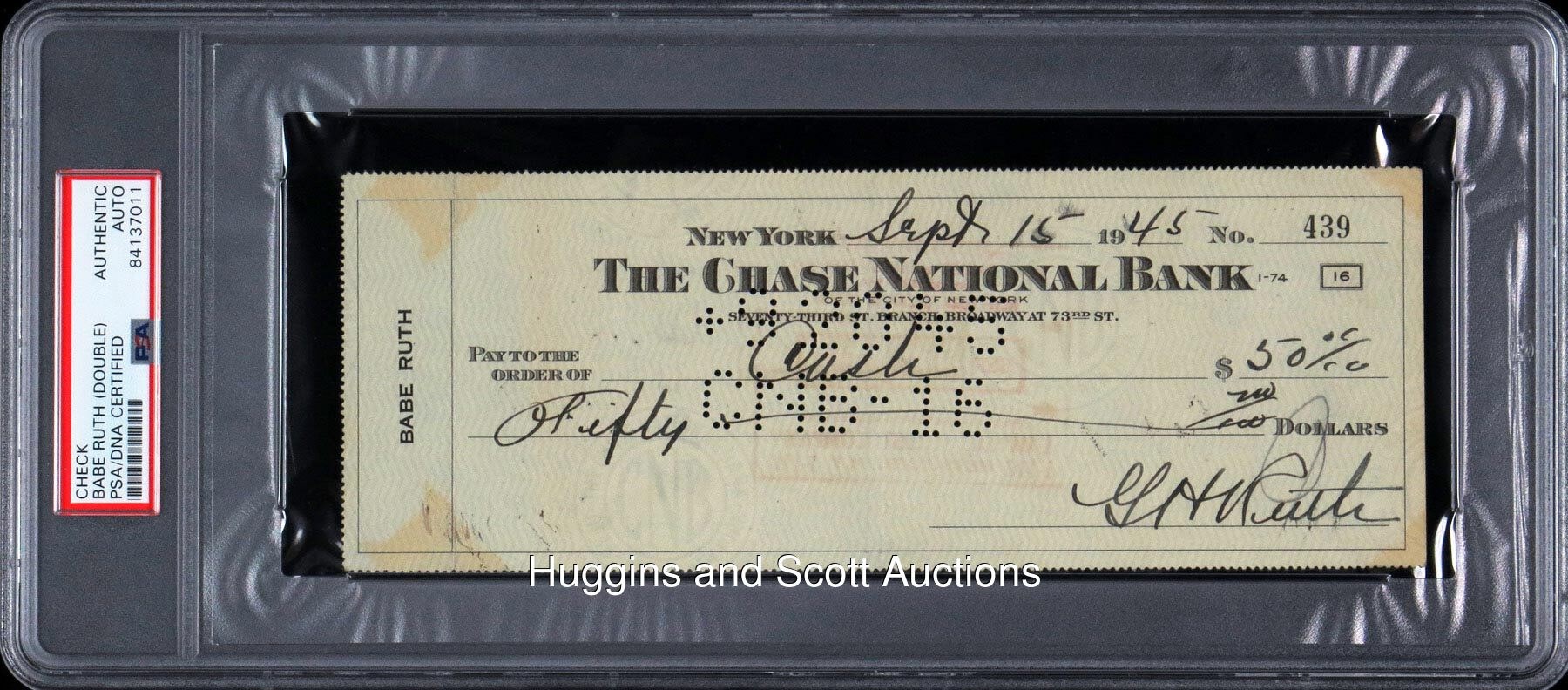 Defined by tape-measure home runs throughout an era during which only he hit them with any regularity, Babe Ruth was the antithesis of moderation in his every last endeavor. His flair for drama never waned in the least, nor did his desire to manage and his penchant for reckless spending. Representing these readily identifiable traits, this check was composed by Ruth in 1945 and showcases one of the most glorious and bold endorsements you’ll ever behold. Long-since retired from his role as an active player, his on-field performances were limited to exhibitions benefiting the war effort. In a 1942 old-timers game at Yankee Stadium, Ruth made his first appearance at his eponymously nicknamed stadium since his 1934 Yankee swan song. Facing Walter Johnson, Ruth watched seven deliveries before launching one high and deep to right field. While the clout ultimately sailed foul, Ruth accepted it as a home run and trotted the bases, anyway. Succumbing to Ruth’s interpretation, the crowd cheered wildly. Content with limited “playing” appearances, Ruth still clung to hopes of taking the helm somewhere, anywhere. Having finally accepted the possibility of starting small, Ruth asked new Yankee General Manager Larry MacPhail for an opportunity managing the club’s Newark affiliate. MacPhail responded (by mail), asking Ruth to consider involvement in the New York City-sponsored sandlot league. Sight unseen, Ruth recognized the correspondence as the final humiliation. “That’s bad news,” Ruth said of the letter. “When it’s good news, they telephone.” And so he went back to golf, hunting, bowling and nights on the town. Hence, the likely purpose of this personal check. Drawn from Ruth’s personal account at New York’s Chase National Bank, the voucher is dated (entirely in Ruth’s hand) “Sept 15 45” and made out to “Cash” in the amount of “50.00.” Encapsulated by PSA/DNA with autograph assessed “Authentic,” the document is signed “G H Ruth” on the appropriate line in black-ink steel tip fountain pen. The magnificent scripting trumpets “perfect 10” strength and clarity, with slight pencil overlapping visible in the last name. On the reverse, Ruth has signed “G H Ruth” (“8-9” strength) in black-ink steel tip fountain pen. The voucher features normal cancelation stampings and hole punchings, none of which affect either of Ruth’s bold pennings.