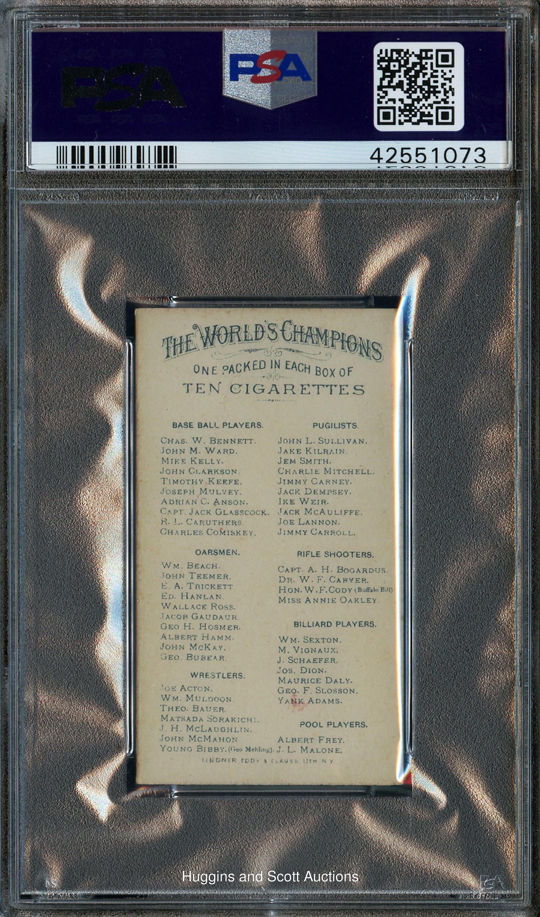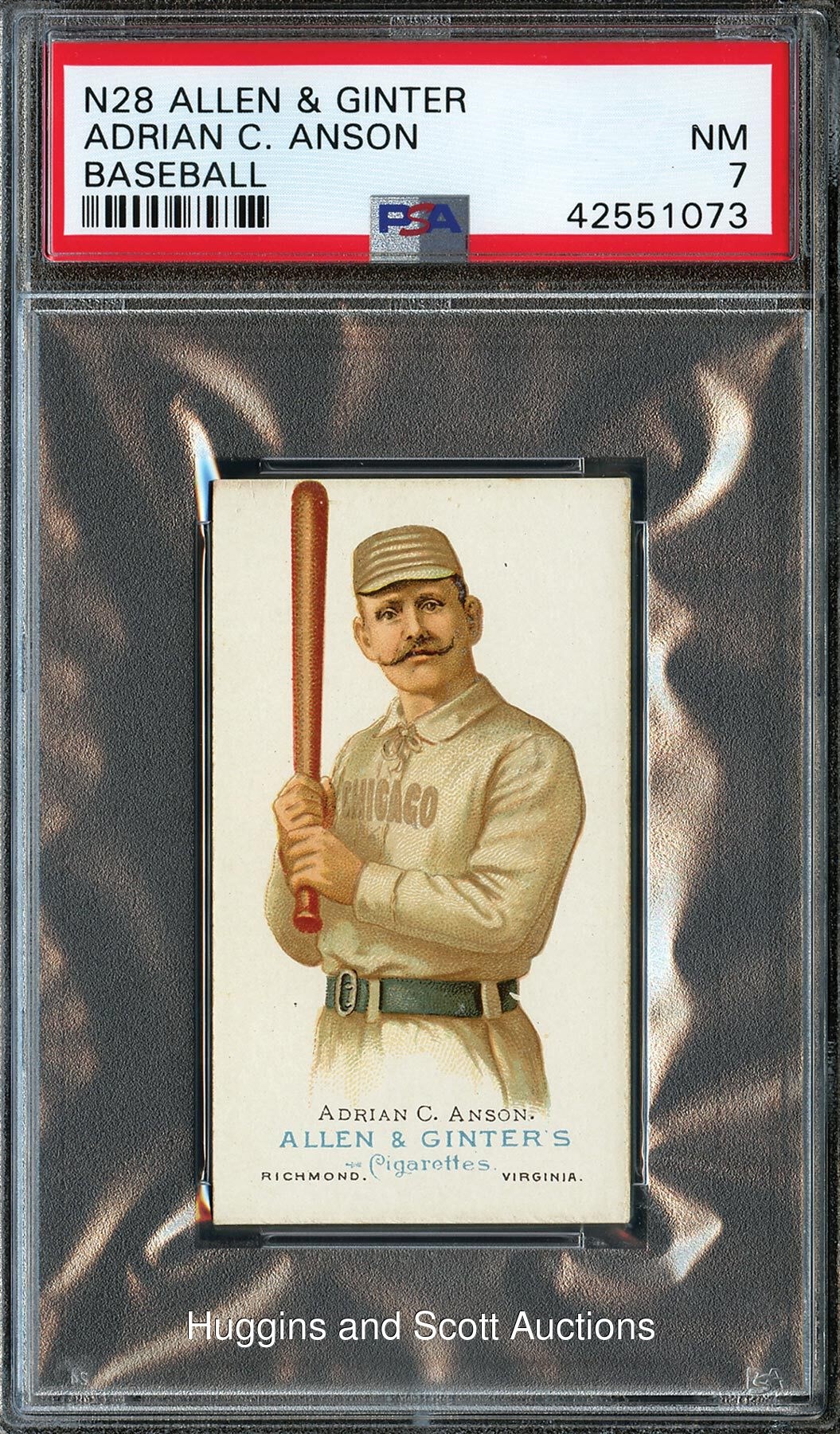 Graded NM 7 by PSA. Stunning 1888 N28 Allen & Ginter Cap Anson. This centered blazer is hallmarked by razor-sharp corners, creamy edges and lush surface colors. Additionally, the blue text reverse in unmarked and amplified by bold typeface. The controversial Hall of Famer survives in the upper 15% of all similar copies evaluated by the authenticator. A premier proposition for 19th century hobbyists who are seeking only the very best.