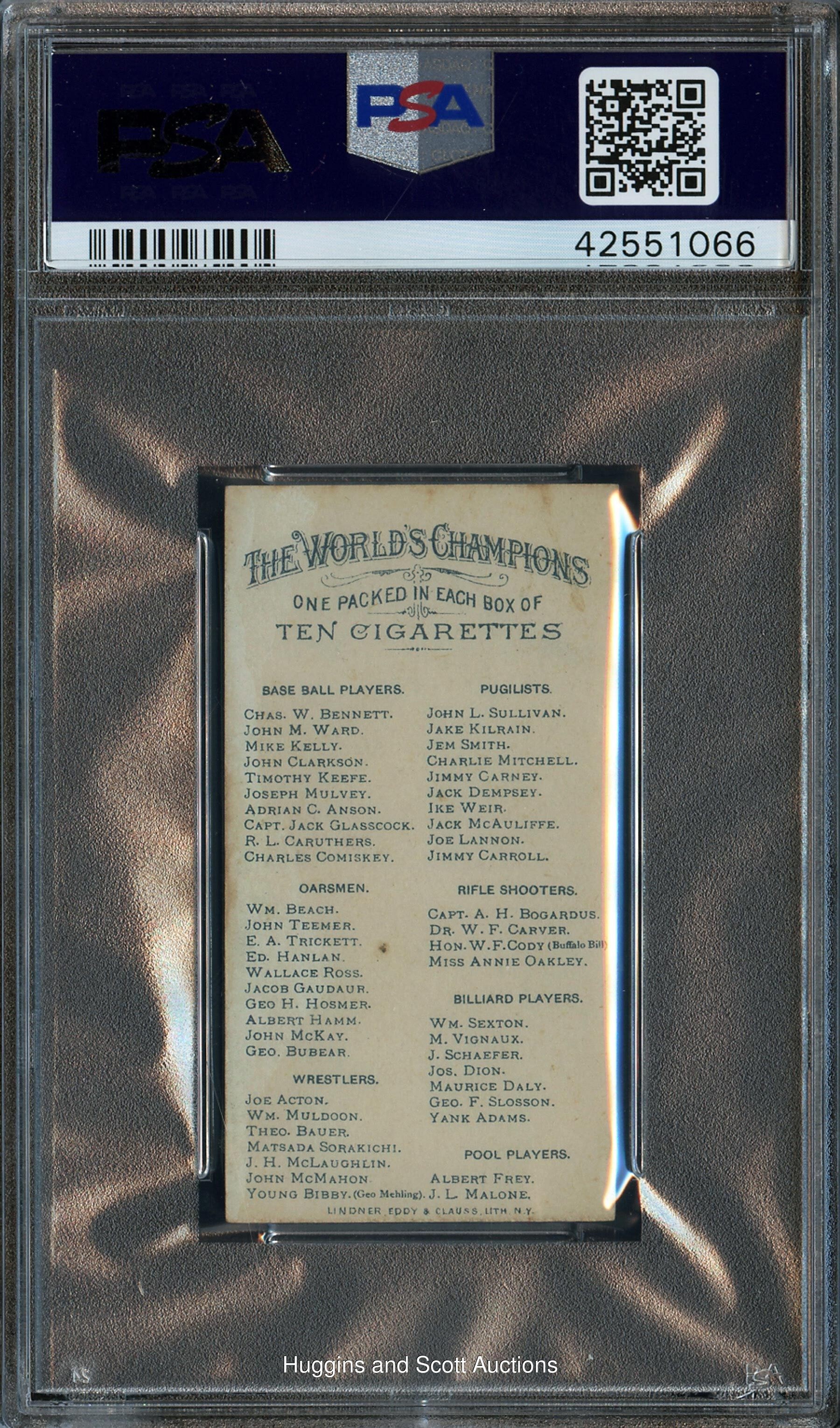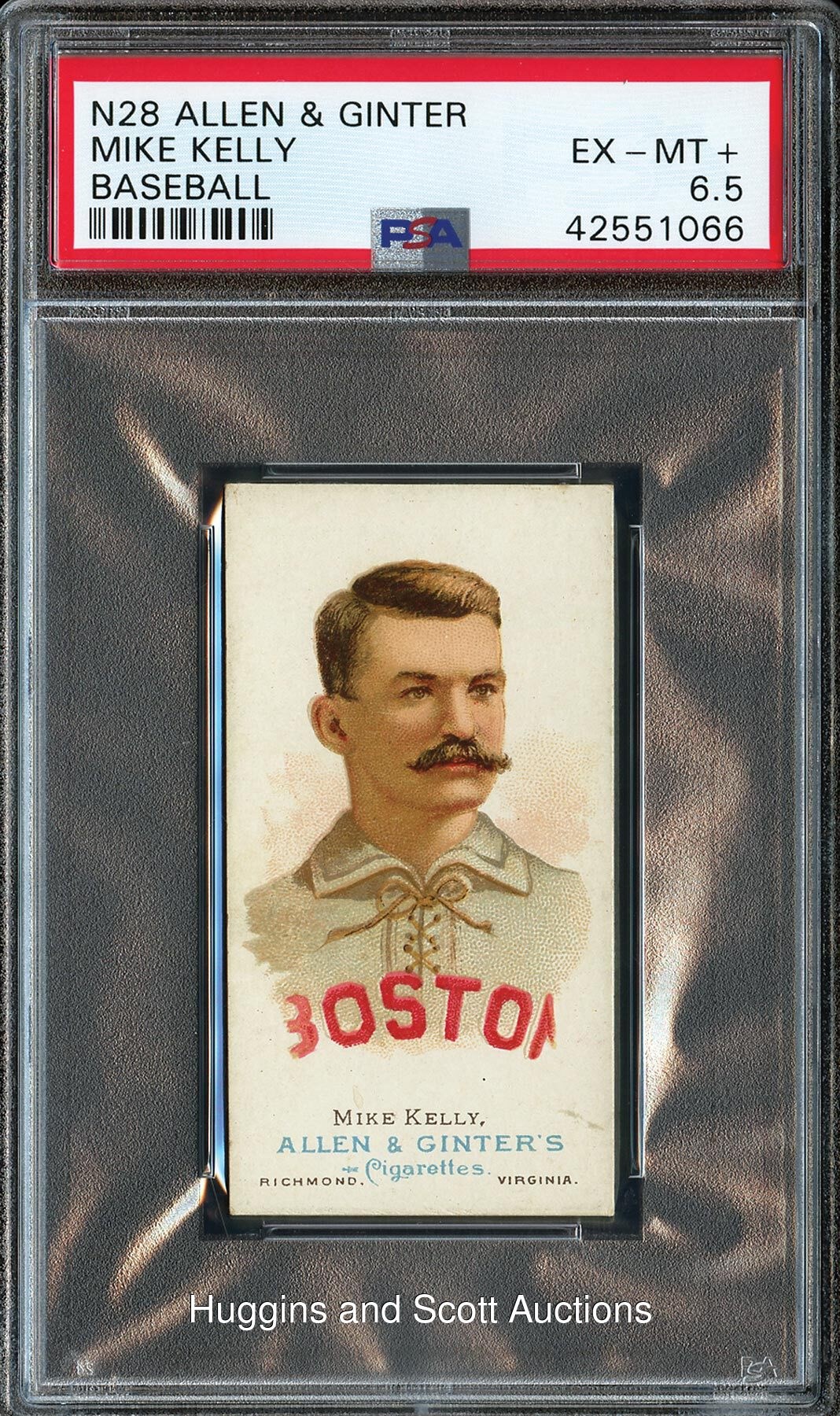 Graded EX-MT+ 6.5 by PSA. Mike “King” Kelly commands the offered 1888 N28 Allen & Ginter tobacco card. The mustachioed Bostonian features well constructed corners/edges and proper centering along with bright surface registration. The back is clean and the front is crease-free. A highly ranked 131 year-old relic of this "$10,000" legend.