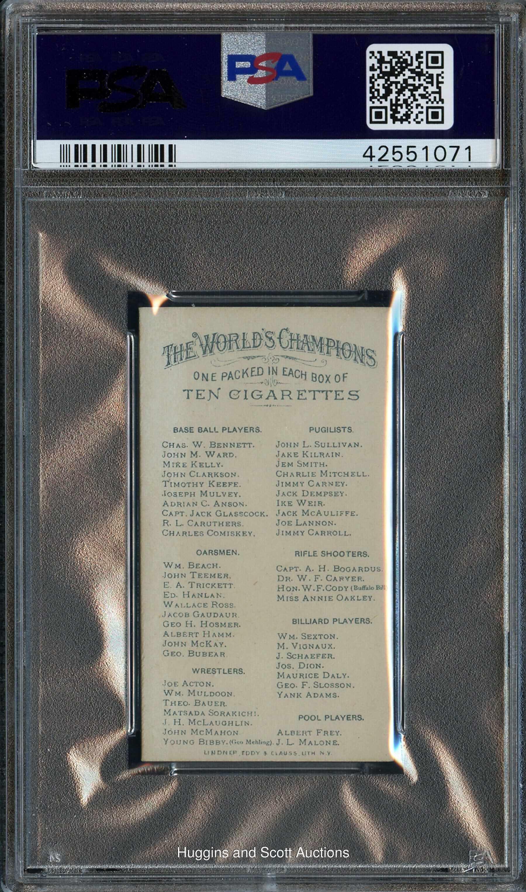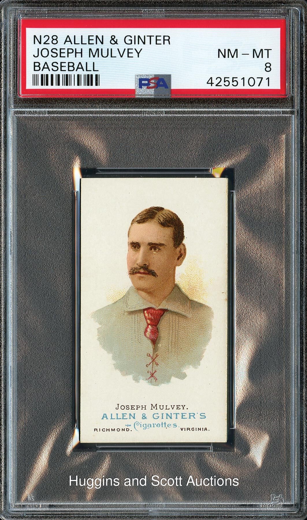 PSA Registry Collectors! Do what it takes to score the offered 1888 N28 Allen & Ginter Joseph Mulvey single. Graded NM-MT 8 by PSA. This near perfect specimen is precisely centered with four razor-sharp corners, crisp factory edges and glistening surface accents. The reverse is entirely unmarked. Survives as 1 of 8 at the grading level with none better!