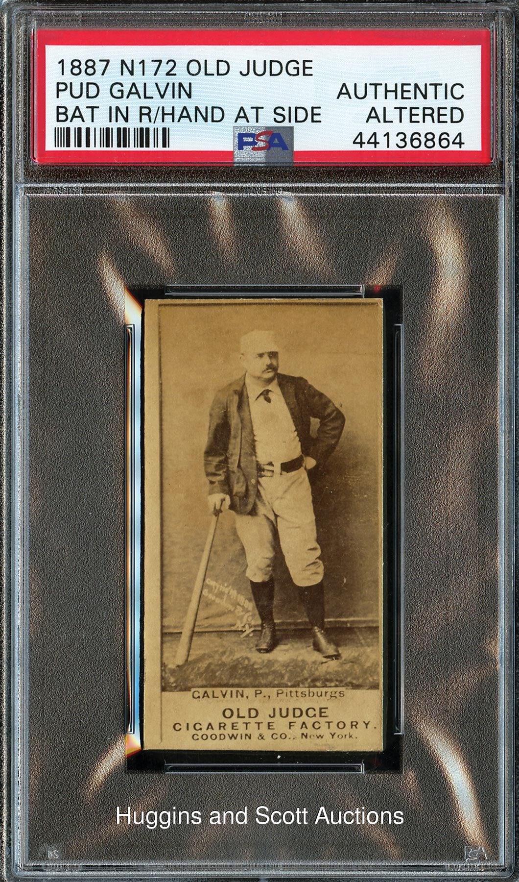Gone but not forgotten. It"s been 117 years since 1965 Hall of Famer Pud Galvin passed away, but the big leagues first 300-game winner is memorialized on the offered 1887 N172 Old Judge tobacco card. Graded Authentic by PSA due to being re-backed and confirmed as pose #177-4. This relic displays a crystal clear sepia image with bold identifying text.