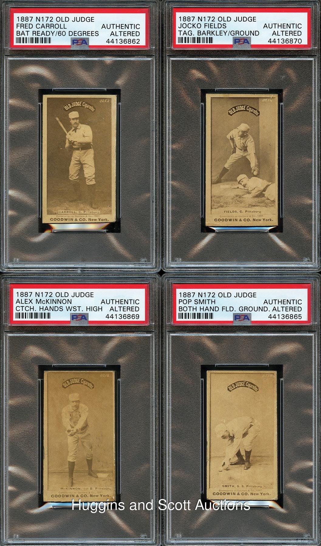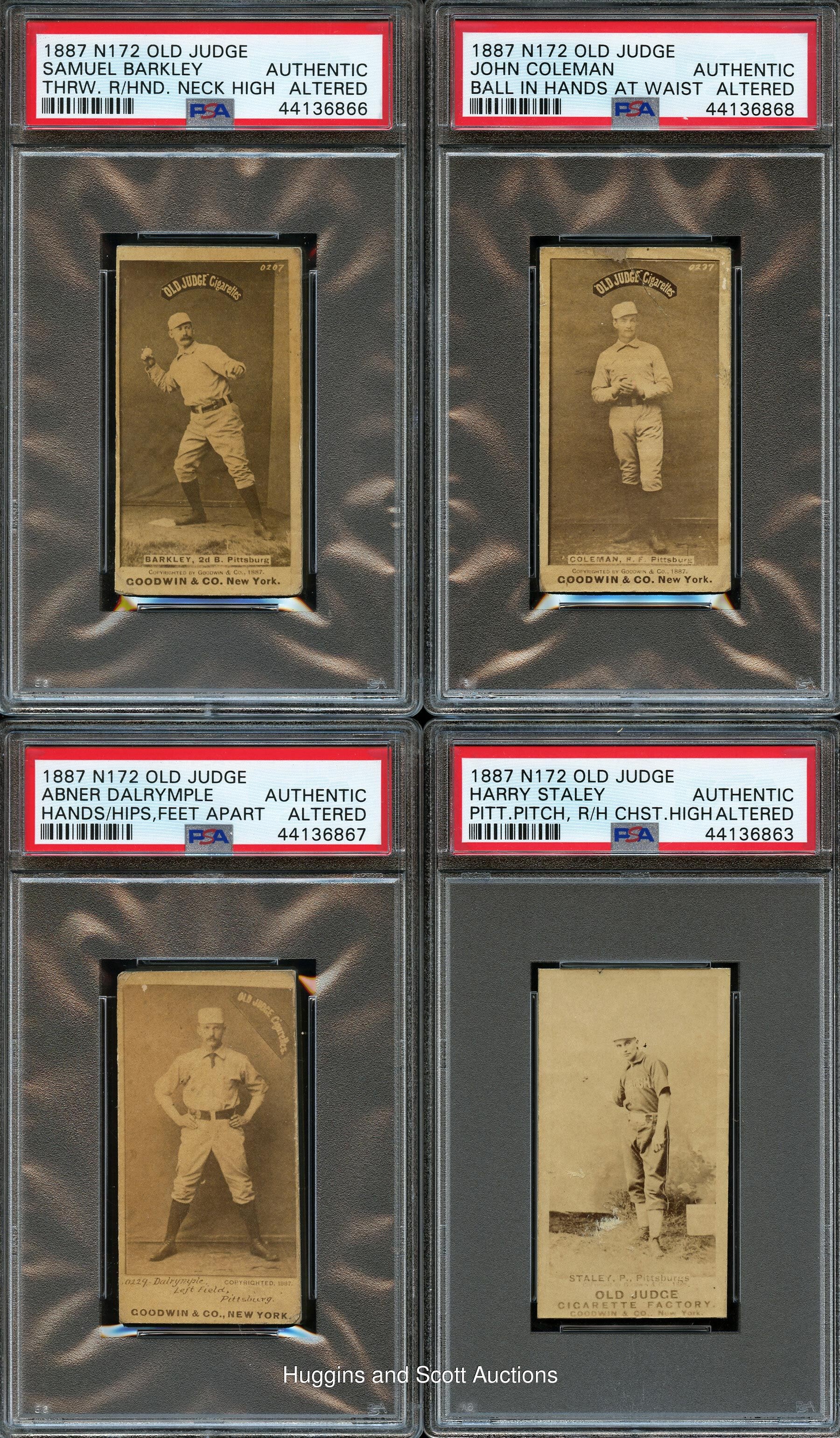 Each graded Authentic by PSA due to being re-backed. Seldom offered grouping of (8) 1887 N172 Old Judge tobacco cards picturing players from the Pittsburgh Alleghenys. Despite only mild perimeter wear, the front surfaces are largely crease-free. Subjects include: Barkley (pose #19-3), F. Carroll (pose #69-2), Coleman (pose #83-2), Dalrymple (pose #113-1), Fields (pose #160-4), McKinnon (pose #315-2), Po. Smith (pose #426-4) and Staley (pose #435-3, slight front paper loss).