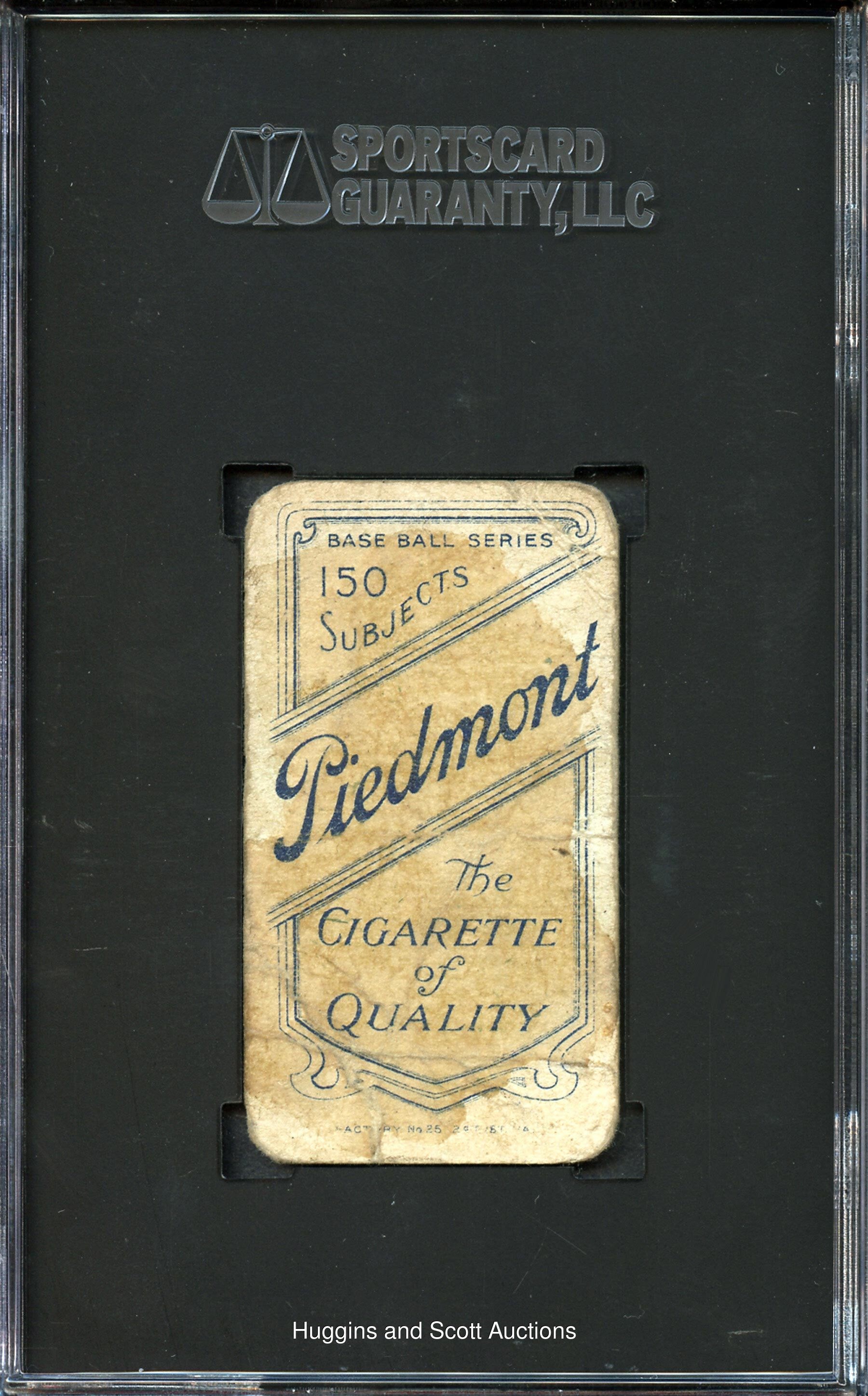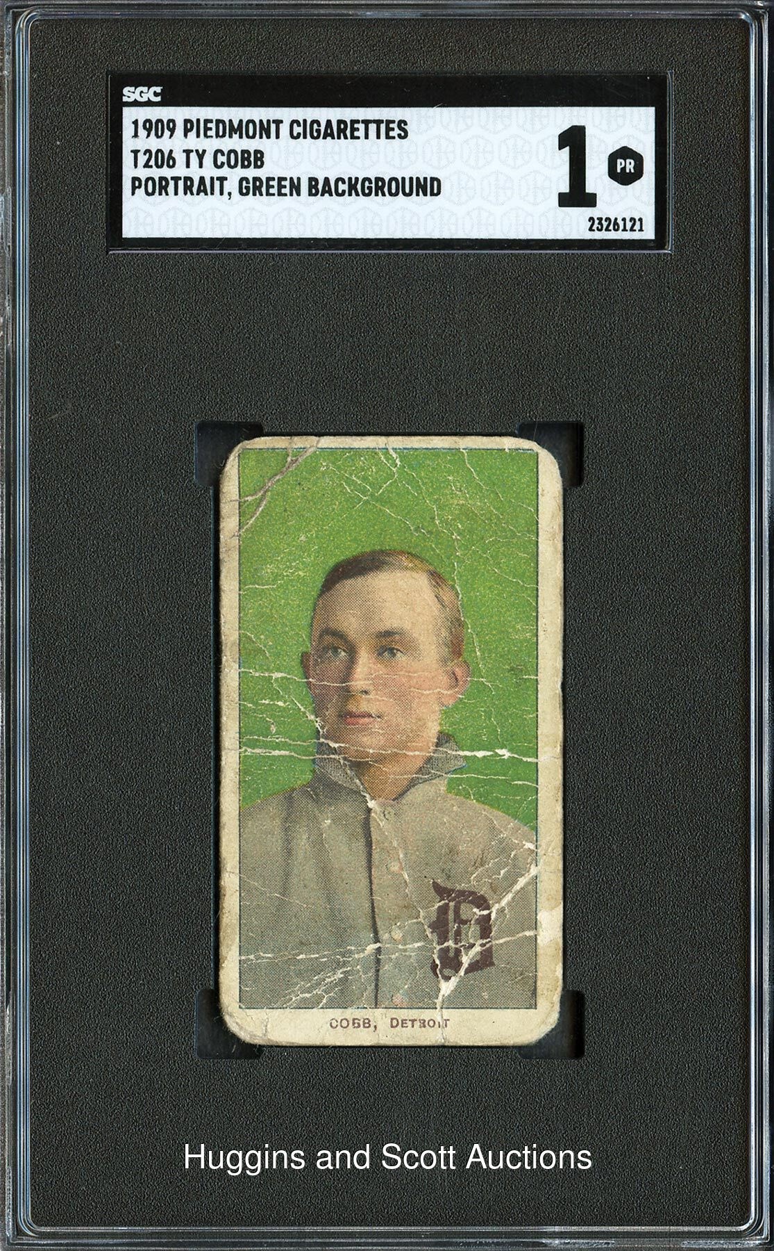 Graded 1 Poor by SGC. The offered 1909-11 T206 White Borders Ty Cobb (Green Portrait) was obviously well loved by a previous owner. Despite a combination of acute wear including significant creasing and reverse residue to the Piedmont 150 Subjects advertising back, this coveted Hall of Fame subject is still immediately recognizable.