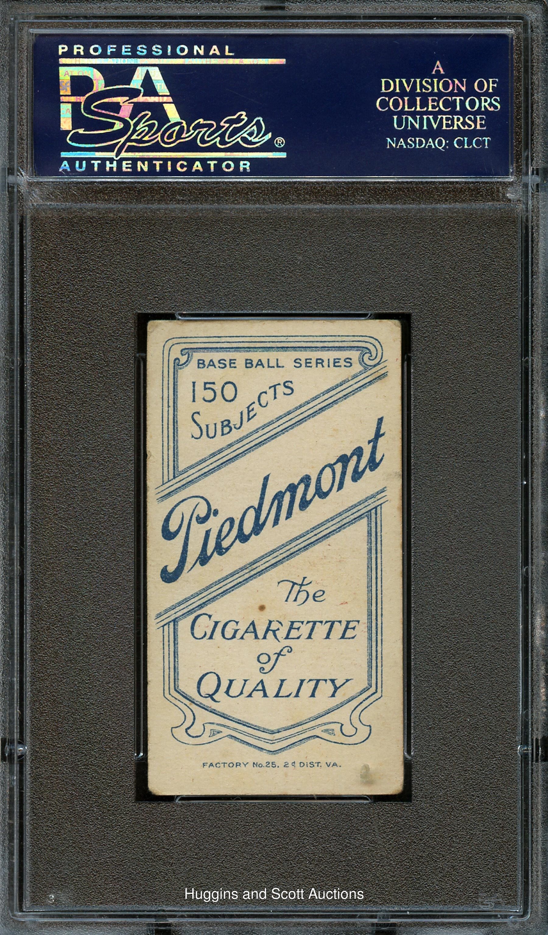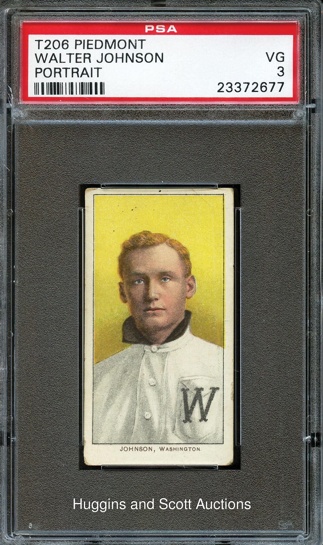 Graded VG 3 by PSA. Handsome 1909-11 T206 White Borders Walter Johnson (Portrait) flanked by a clean Piedmont 150 Subjects advertising back. This capless flamethrower for the Washington Senators emerges from a bright yellow setting with neatly crafted player/uniform details. Moderate corner/edge wear along with a discreet crease near the upper right corner warrants its overall evaluation.