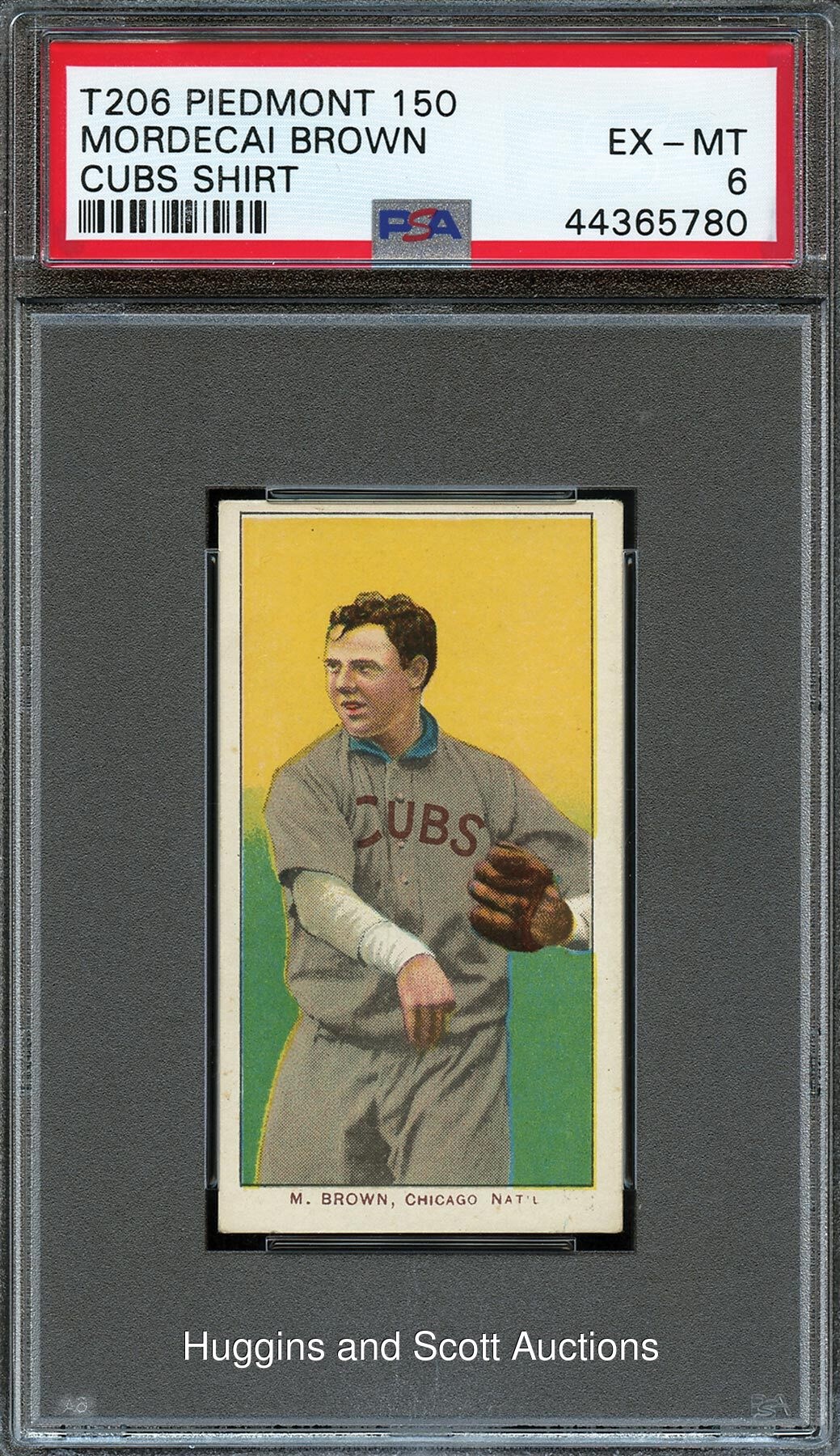 Graded EX-MT 6 by PSA with a Piedmont 150 Subjects advertising back. The offered 1909-11 T206 White Borders Mordecai Brown (Cubs Shirt) pose ranks in the upper 8% of the player/pose combination judged by the authenticator.