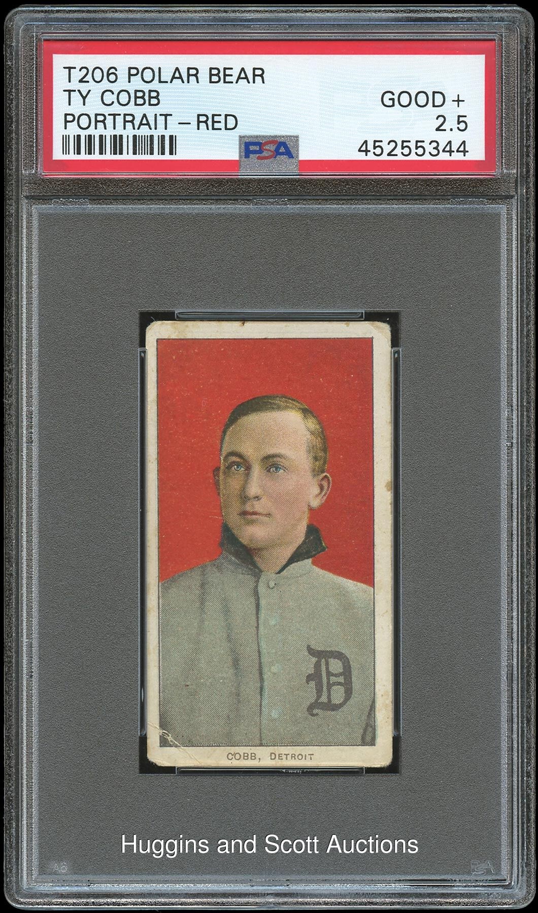 Graded Good+ 2.5 by PSA. Presented is a 1909-11 T206 White Borders Ty Cobb (Red Portrait) with a Polar Bear advertising back. Playing era Cobbs are among the hottest cards in the pre-war industry and desirable in any condition. With exception to a moderate crease along the bottom left corner, this relic otherwise presents mid-grade with corner/edge wear and expected tobacco pouch staining consistent with its overall evaluation. The Class of 1936 Hall of Famer"s portrait is crystal clear and is a prime value pick at its grading level.