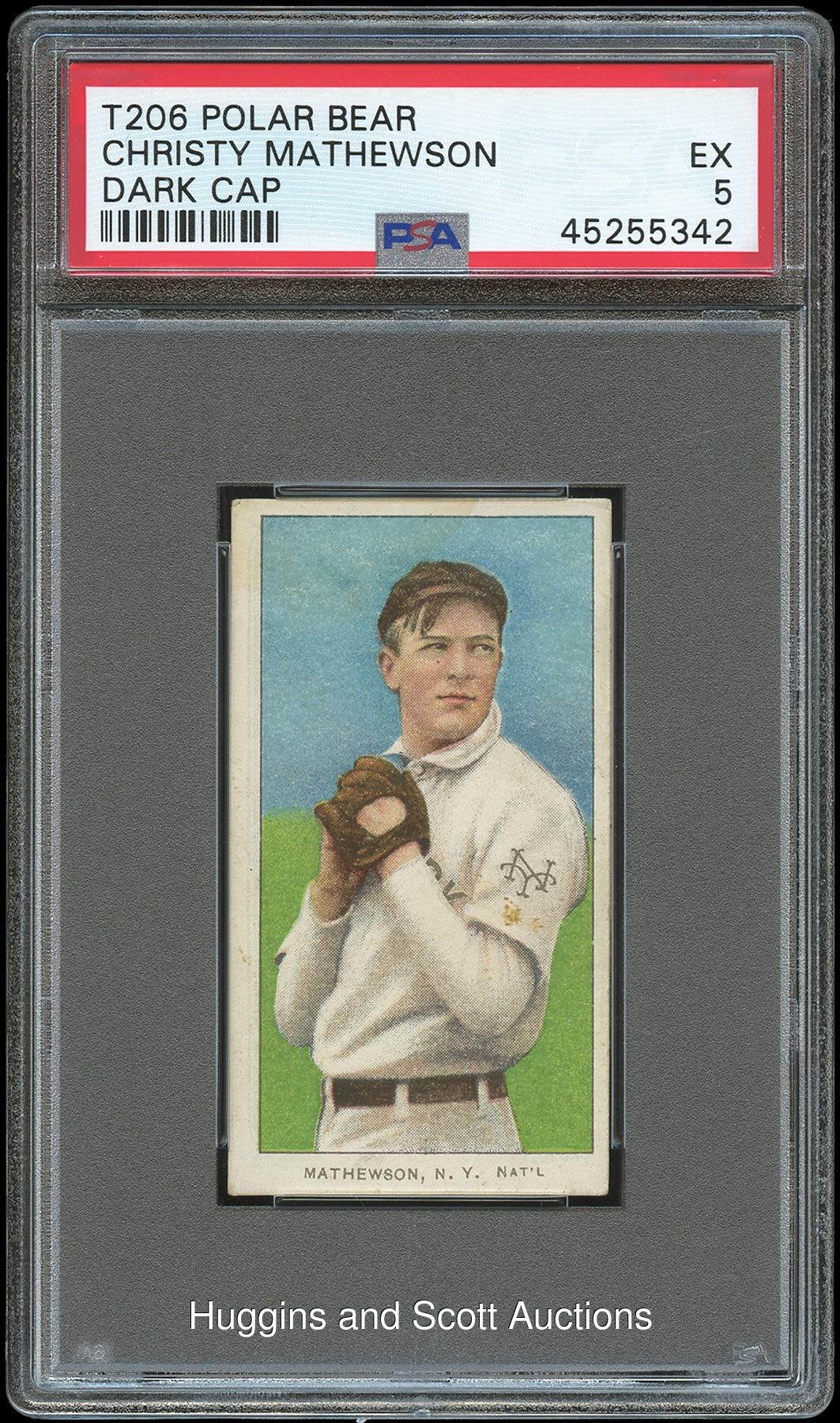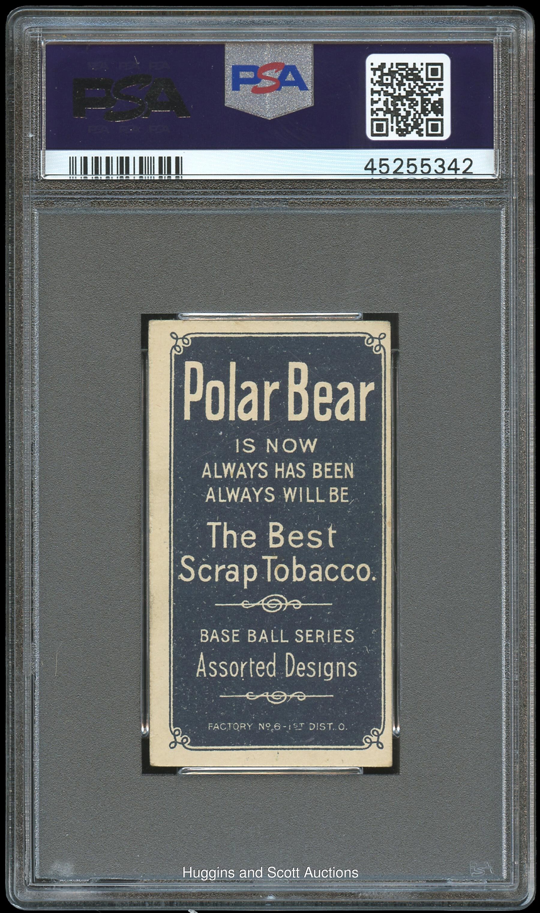 Graded EX 5 by PSA with a slightly tougher Polar Bear advertising back. The "Big Six" emerges victorious on the offered 1909-11 T206 White Borders (Dark Cap) pose. This crease-free tobacco card of the beloved Giant exhibits relatively strong corners and creamy edges. The illustration set against a soft pastel backdrop is attractive.