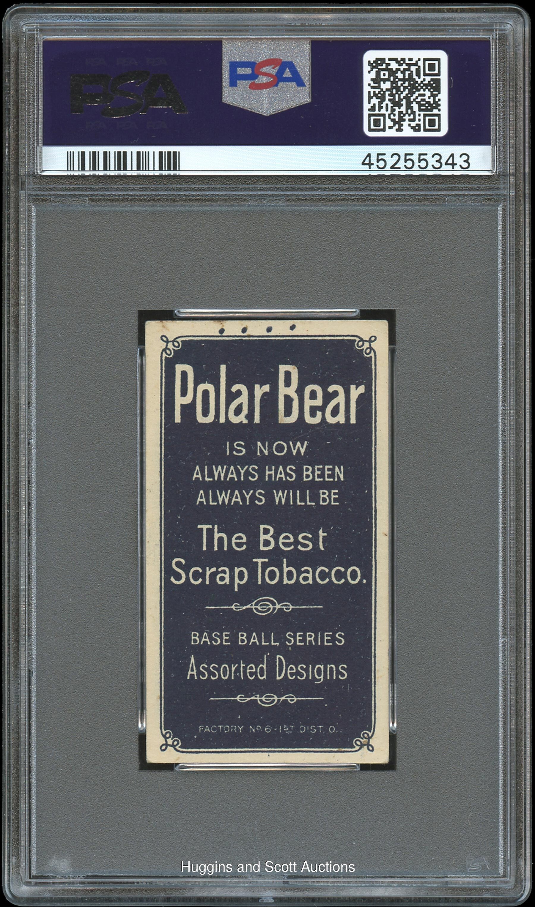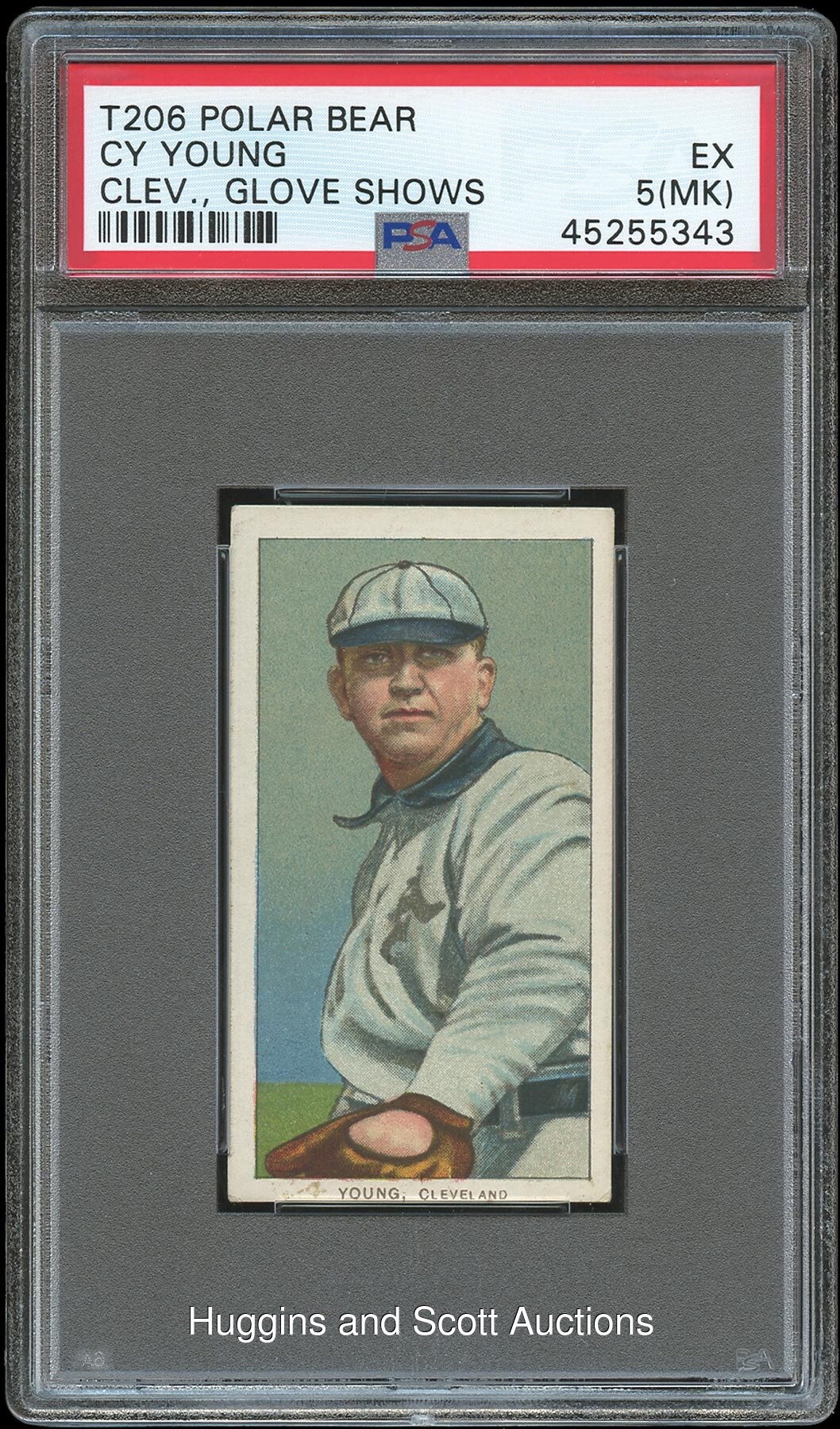 Graded EX 5 by PSA with an (mk) qualifier due to reverse pen marks along the top edge. Presented is a key 1909-11 T206 White Borders Cy Young (Cleveland, Glove Shows) pose with a tougher Polar Bear advertising back. With deference to the extraneous reverse writing, the front is still quite attractive with a crease-free surface and only mild corner layering. The surface registration is crystal clear with intense player/uniform details.