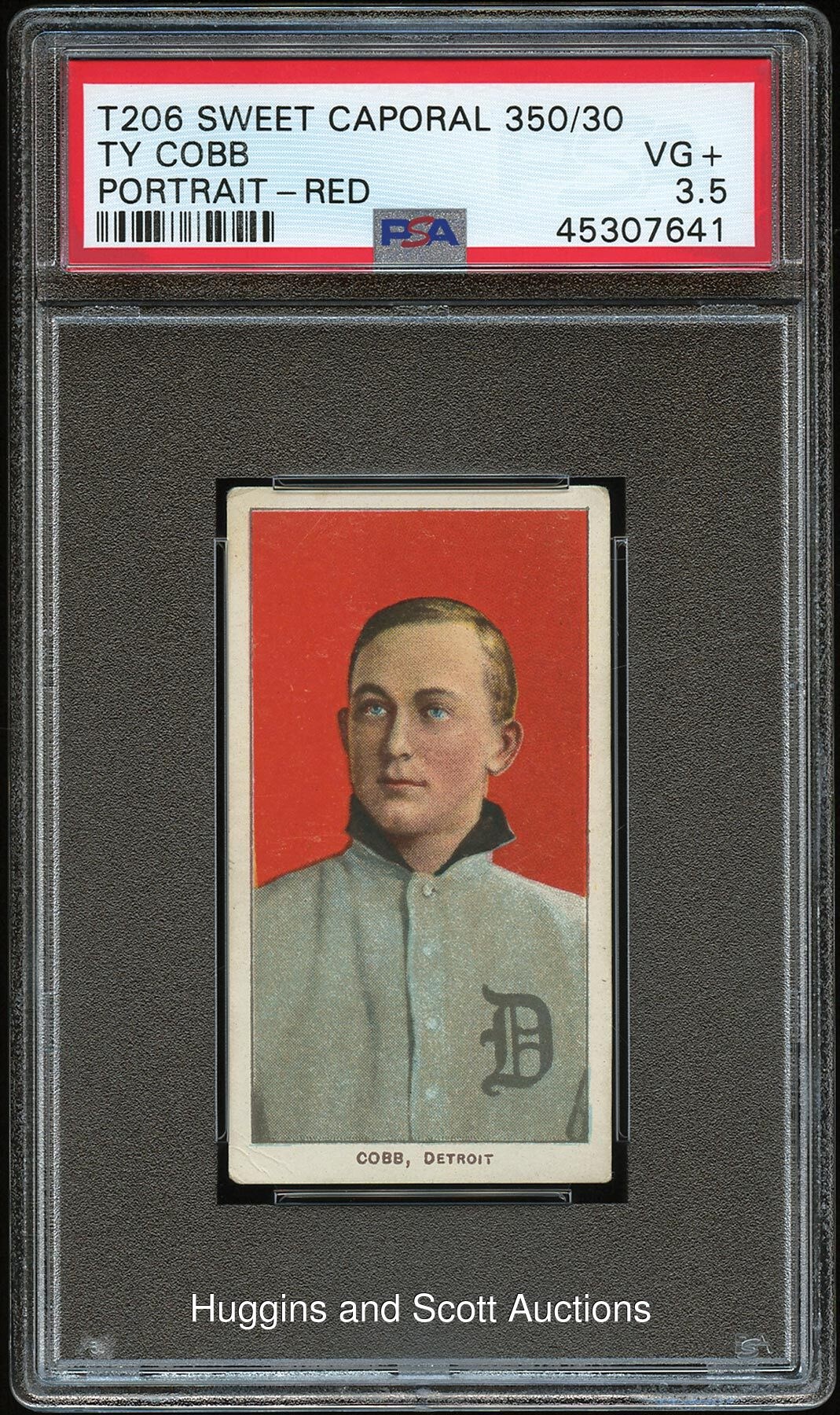 Graded VG+ 3.5 by PSA. Focus your bidding efforts on the offered 1909-11 T206 White Borders Ty Cobb (Red Portrait) pose with a vibrant Sweet Caporal 350 Subjects advertising back. This centered "Georgia Peach" is exceptionally bright with perfect contrast and radiant surface colors. Despite moderate perimeter wear, including a pair of slight wrinkles on the bottom left corner, this Class of 1936 stalwart is still a prime value pick for those pursuing the issue.