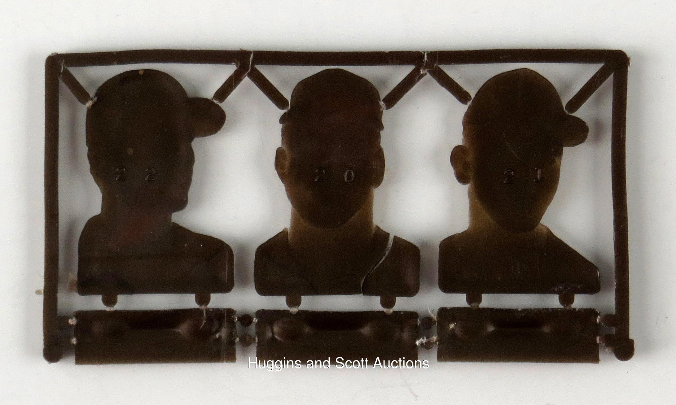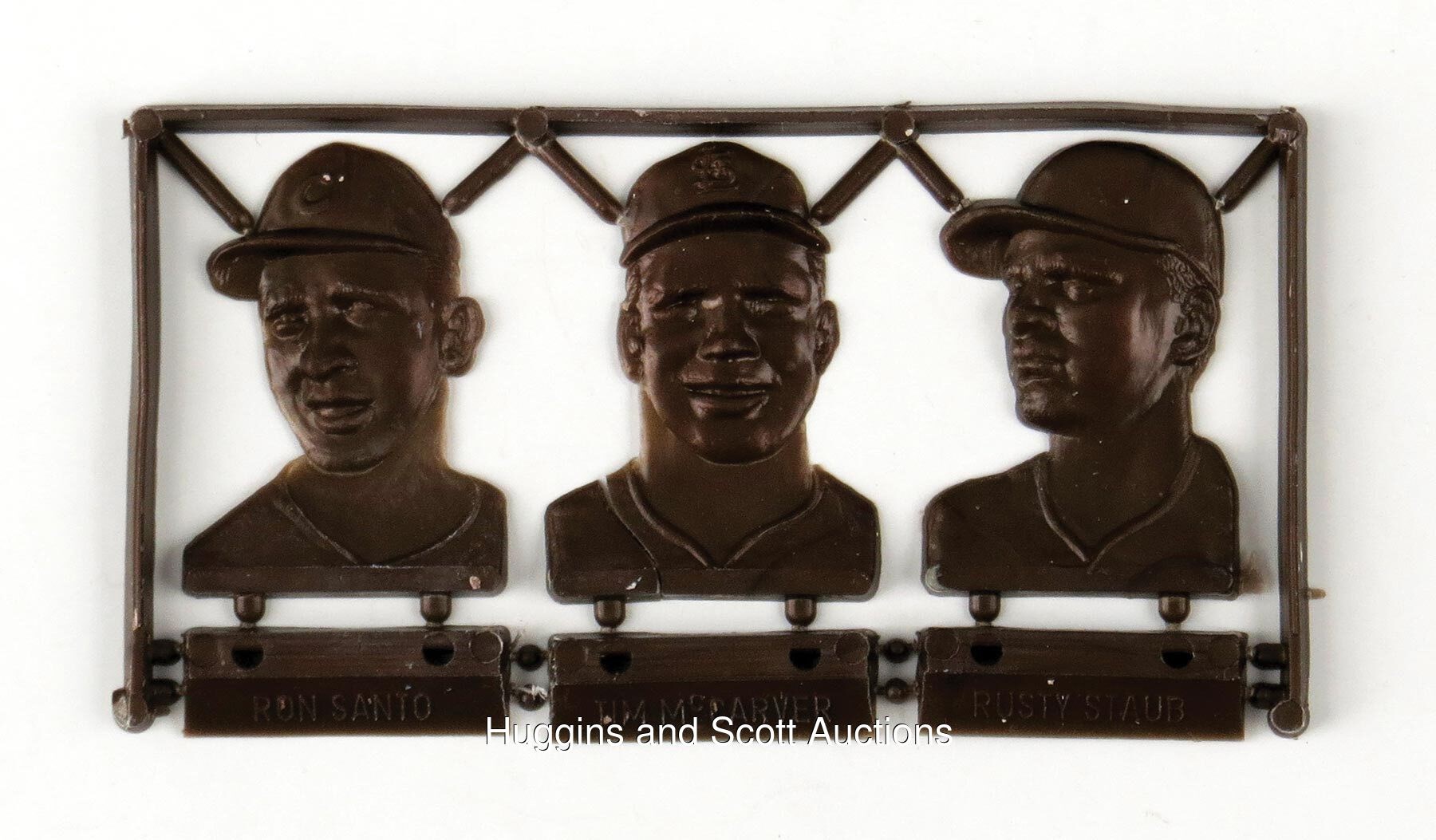 National League stalwarts Ron Santo, Tim McCarver and Rusty Staub are captured on the offered 1968 Topps Baseball Plaks complete sprue. This extremely scarce test issue has survived the past half century in impressive condition! While Santo is separated from McCarver"s base and other minor imperfections are slightly noticeable on the plastic foundation, this near impossible piece still survives in outstanding condition.
