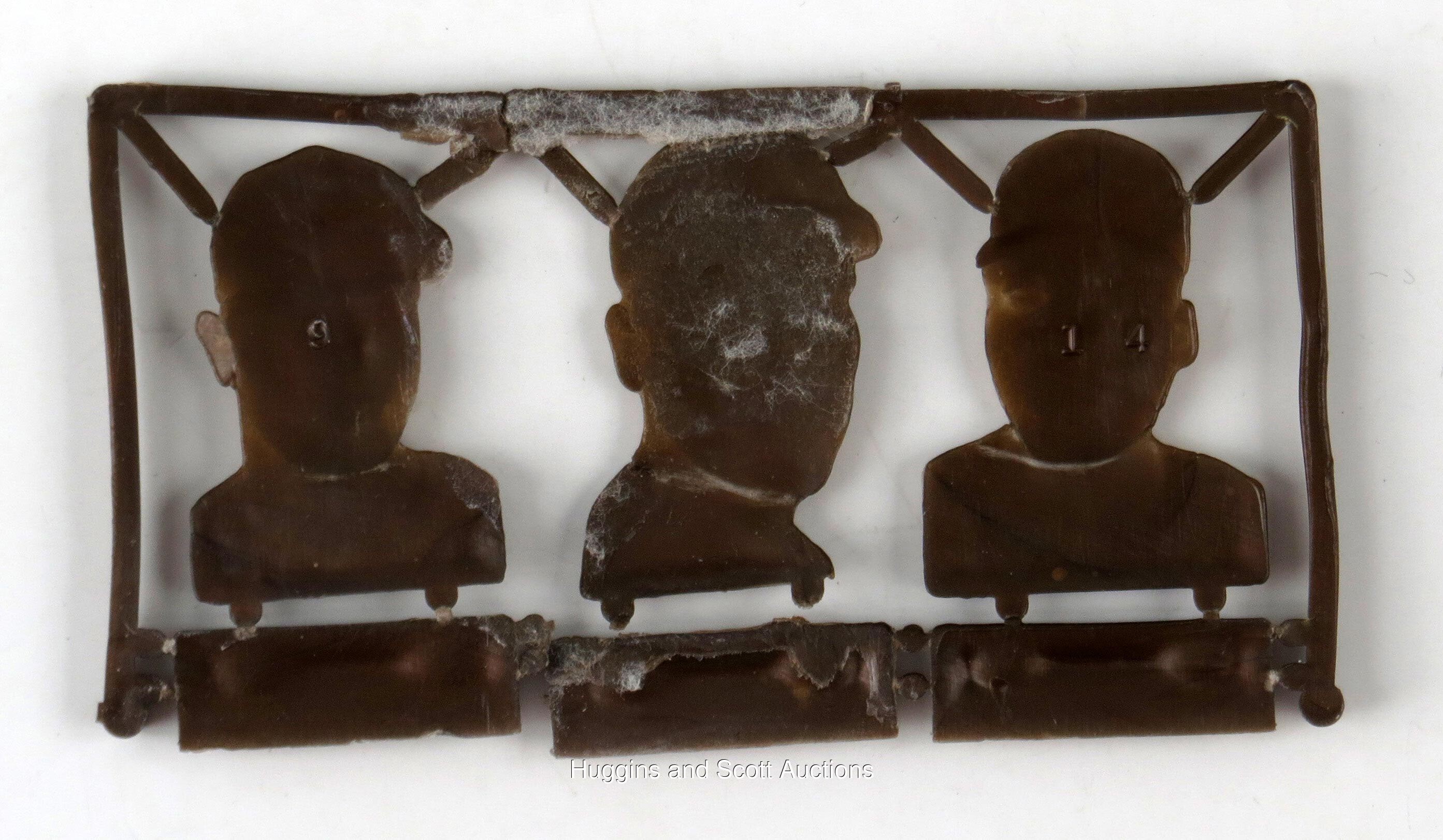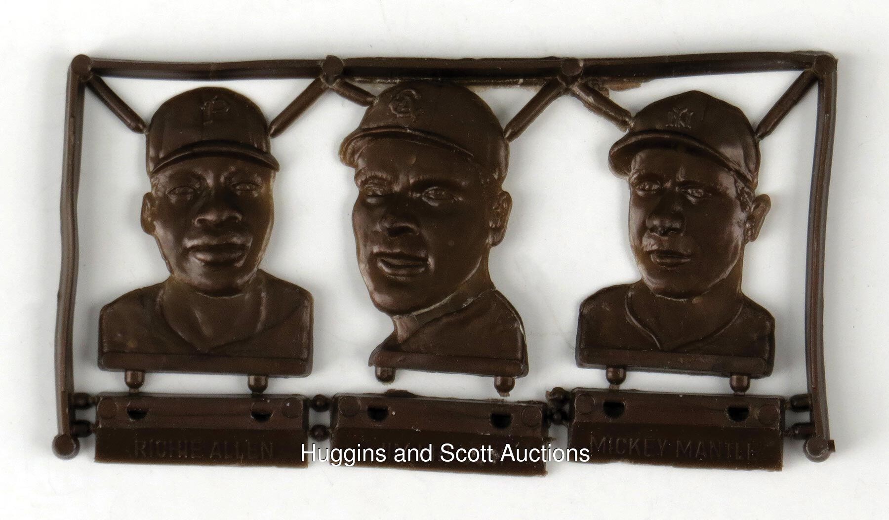 Mickey Mantle Oddball Collectors! One of the most desirable and truly rare of 1960s Mickey Mantle collectibles is available with this near impossible 1968 Topps Baseball Plaks complete sprue. Along with the Mantle ("Big Nose" variation) are extremely scarce portraits of Richie Allen and Jim Fregosi. This "test issue" trio is extremely challenging to find in any condition and is the first Huggins & Scott Auctions has offered. The bronze plastic nameplate between Fregosi and Mantle is detached while Fregosi"s pegs are separated from the base. The portraits are otherwise high-grade and represent a monumental prize for any advanced 1960s Topps collector!