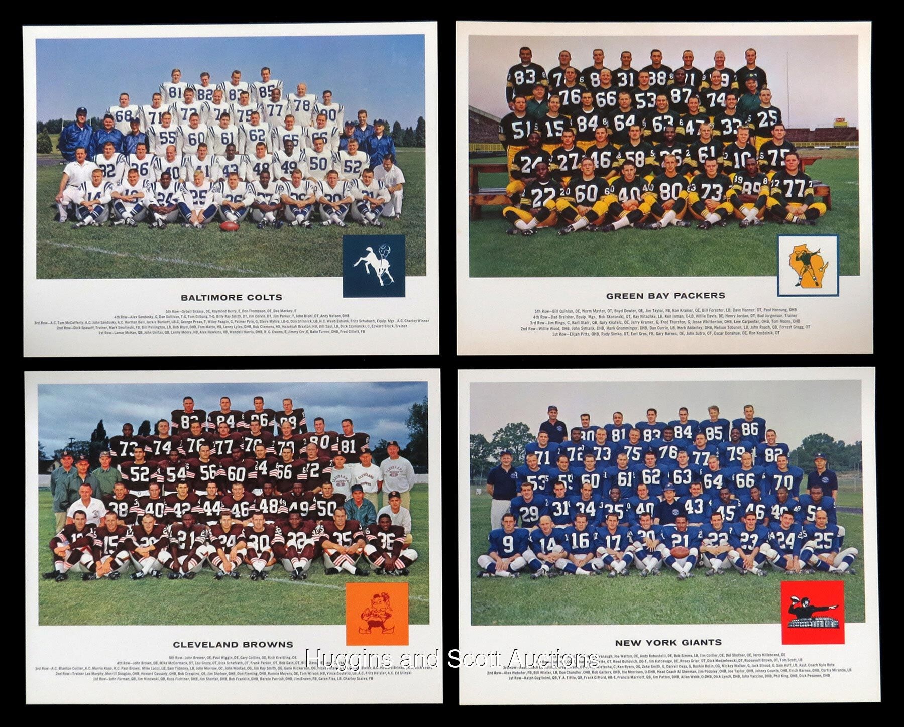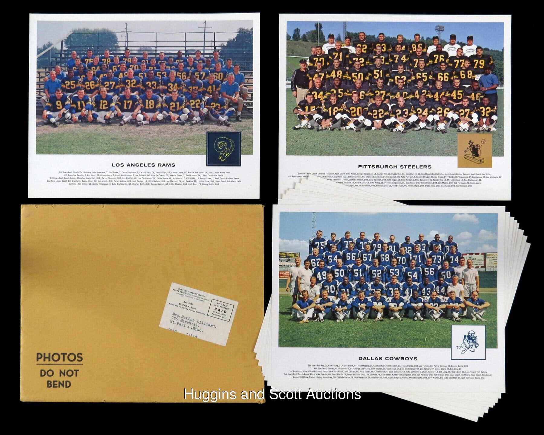 A classic gridiron production featuring Hall of Famers galore. The NM 8x10 photos include: Eagles, Vikings, Cardinals, Packers (champions), Redskins, Forty Niners, Colts (Unitas), Lions, Bears, Cowboys, Giants, Steelers, Rams and Browns (J. Brown). Accompanied by the original mailing envelope.