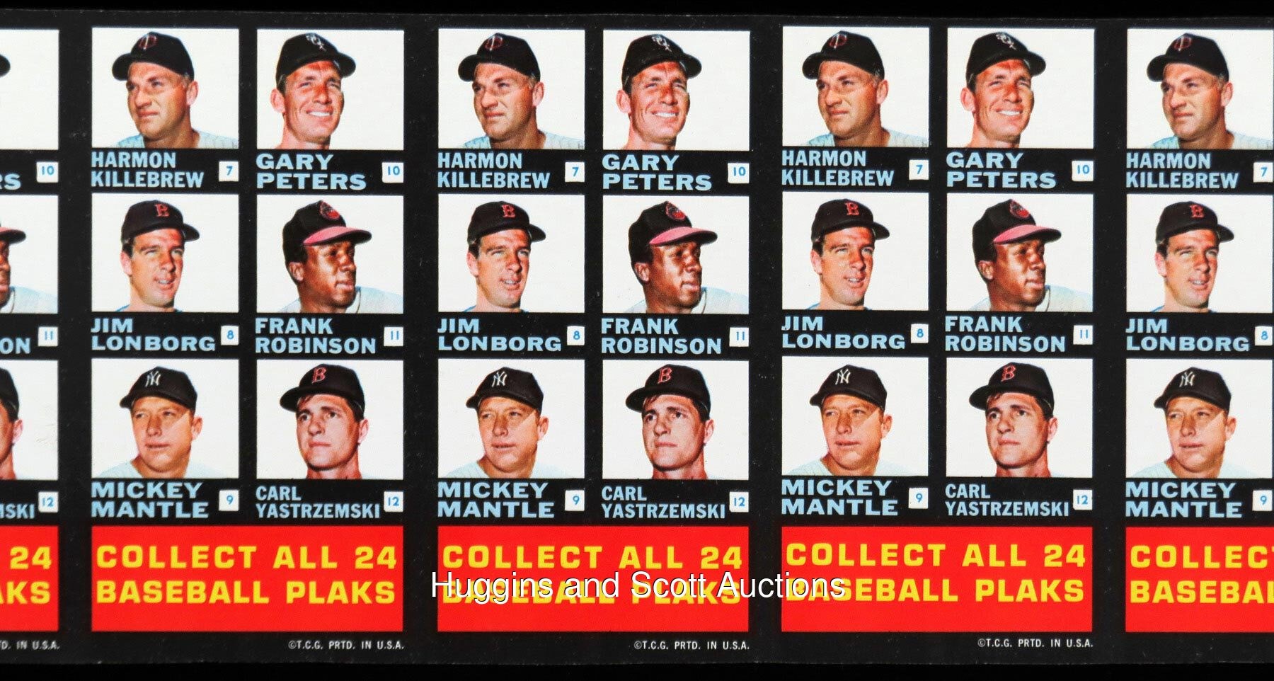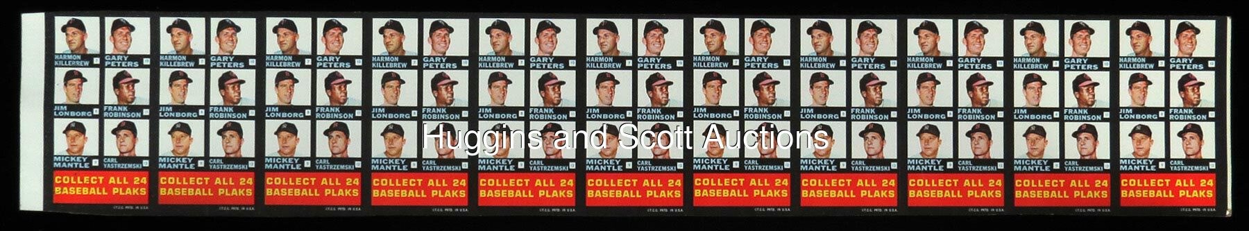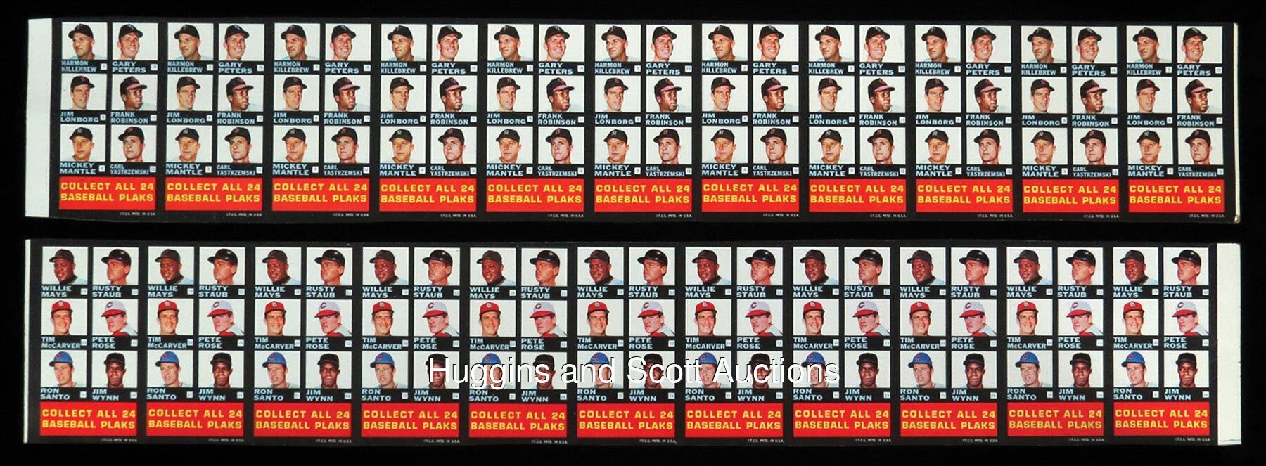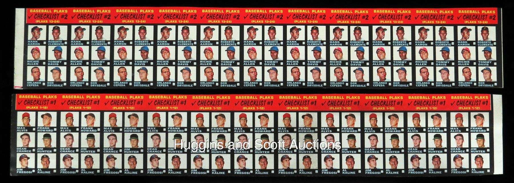 Round Two! One of the toughest of all 1960s Topps Baseball test issues is represented with the offered 1968 Topps Plaks 11-checklist uncut sheet pair! These double-sided checklists were packaged with three plastic busts and two pieces of bubble gum per pack and distributed on an extremely limited regional basis. Twelve players from each league are pictured per card and a total of (12) Hall of Famers (and Pete Rose) are featured. Includes: American League Checklist #1-12 sheet: (3/11 cards display limited creasing or wrinkling, one card has a surface dimple) with Front: (slight soiling on one card) including Alvis, F. Howard, Chance, Hunter, Fregosi, Kaline; Back: Killebrew, Peters, Lonborg, F. Robinson, Mantle, Yastrzemski; National League Checklist #13-24 sheet: (5/11 cards display limited creasing or wrinkling) with Front: Aaron, Clemente, R. Allen, T. Davis, Cepeda, Drysdale; Back: Mays, Staub, McCarver, Rose, Santo and Wynn. The first offering of such uncut sheets sold for $13,222 in our May 2020 auction!