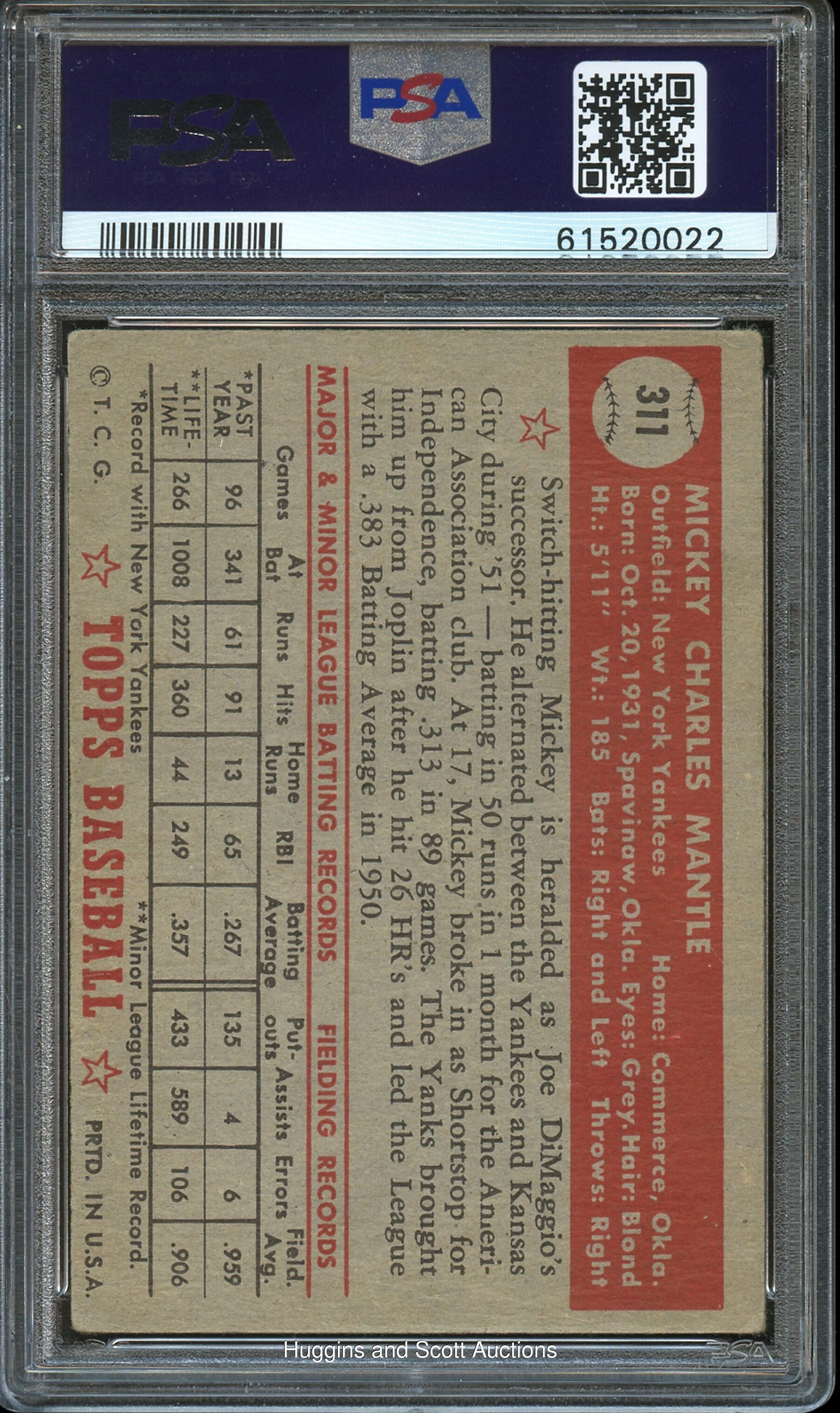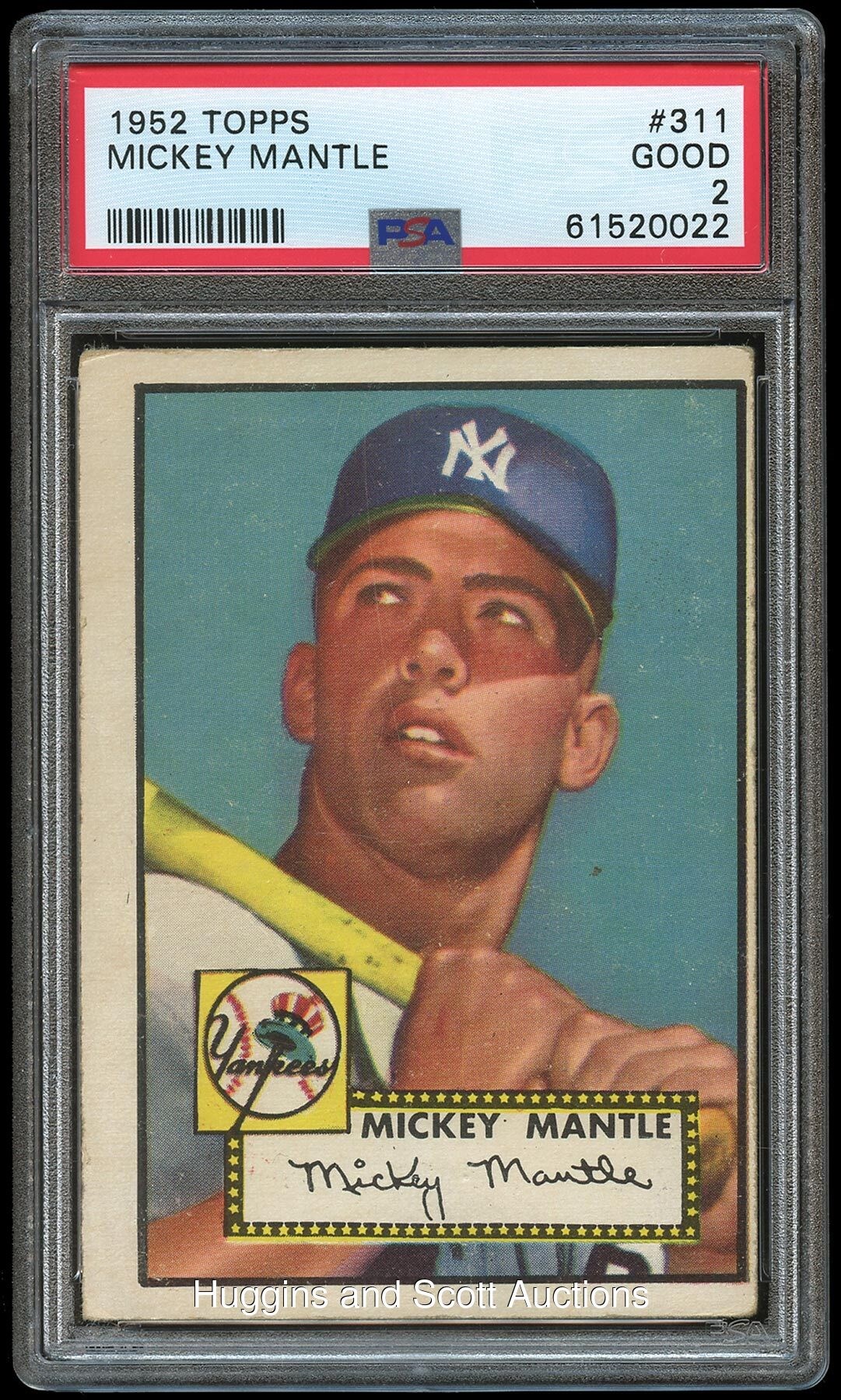 An All-American Classic! Graded Good 2 by PSA. A transcendent sports card by which all others are judged is available with this elite 1952 Topps Baseball #311 Mickey Mantle rookie high number. Of the countless trading cards that Topps has produced over the decades, this "giant size" high number is far and away the most important example of the post-war hobby. By the time Topps had released the high series in October 1952, the "Switch-hitting Mickey" was already recognized as “the face” of “the golden age of baseball.” As such, frenzied fans scooped up Mantle cards and naturally handled and displayed their treasures. Fortunately, for the bidding public, the offered example has escaped acute wear. The “Commerce Comet’s” instantly recognizable batting pose showcases perfect registration with deep colors and an ample coating of original surface gloss. Despite moderately errant centering, the overall presentation is not seriously affected. Moreover, the perimeter displays only moderate corner wear and relatively clean edges. An incidental print dot to the lower right of Mantle’s jawline and a half-inch wrinkle on the lower middle edge of the back which does not break the front is barely evident. Otherwise, the "laces face left" reverse is problem-free with strong text.