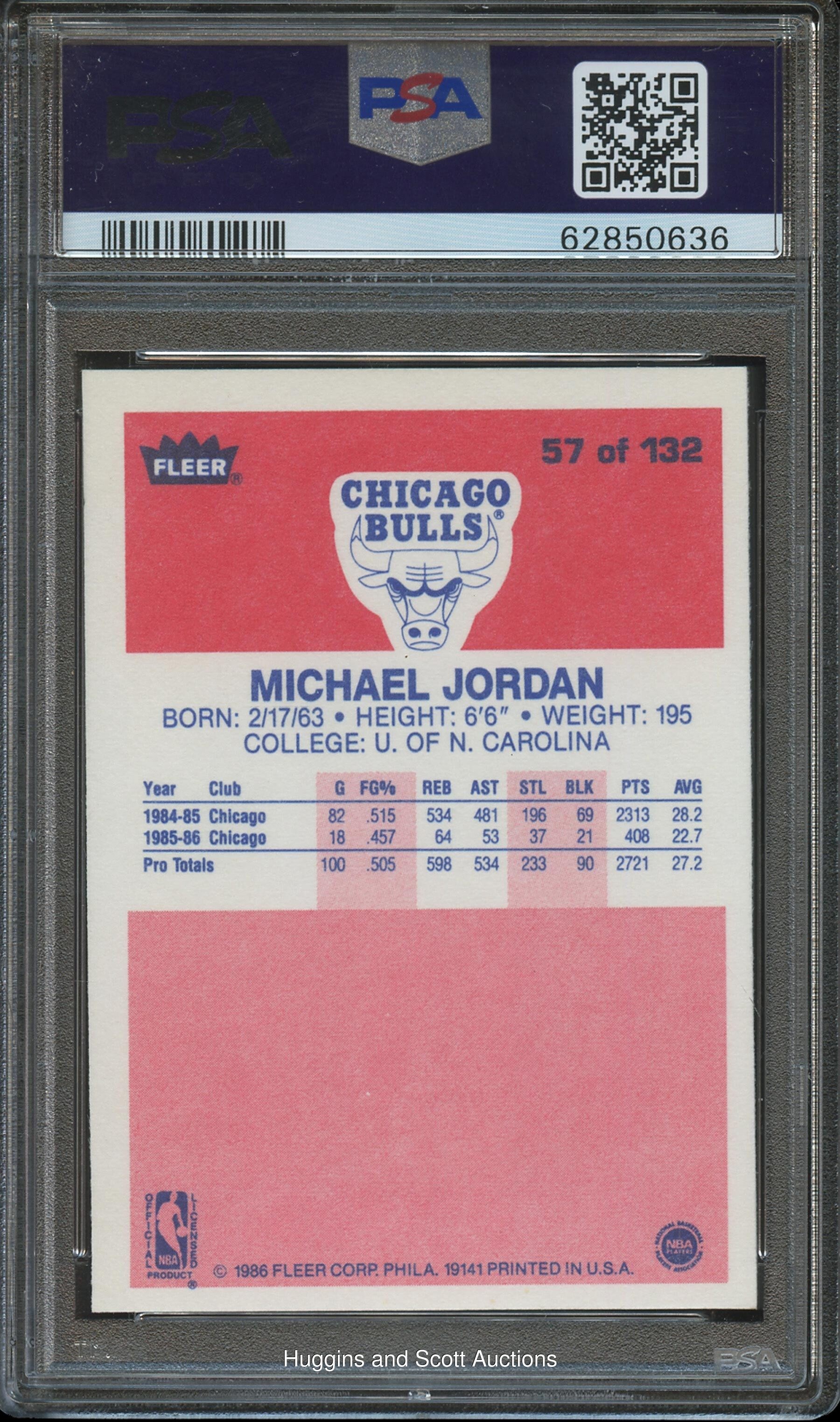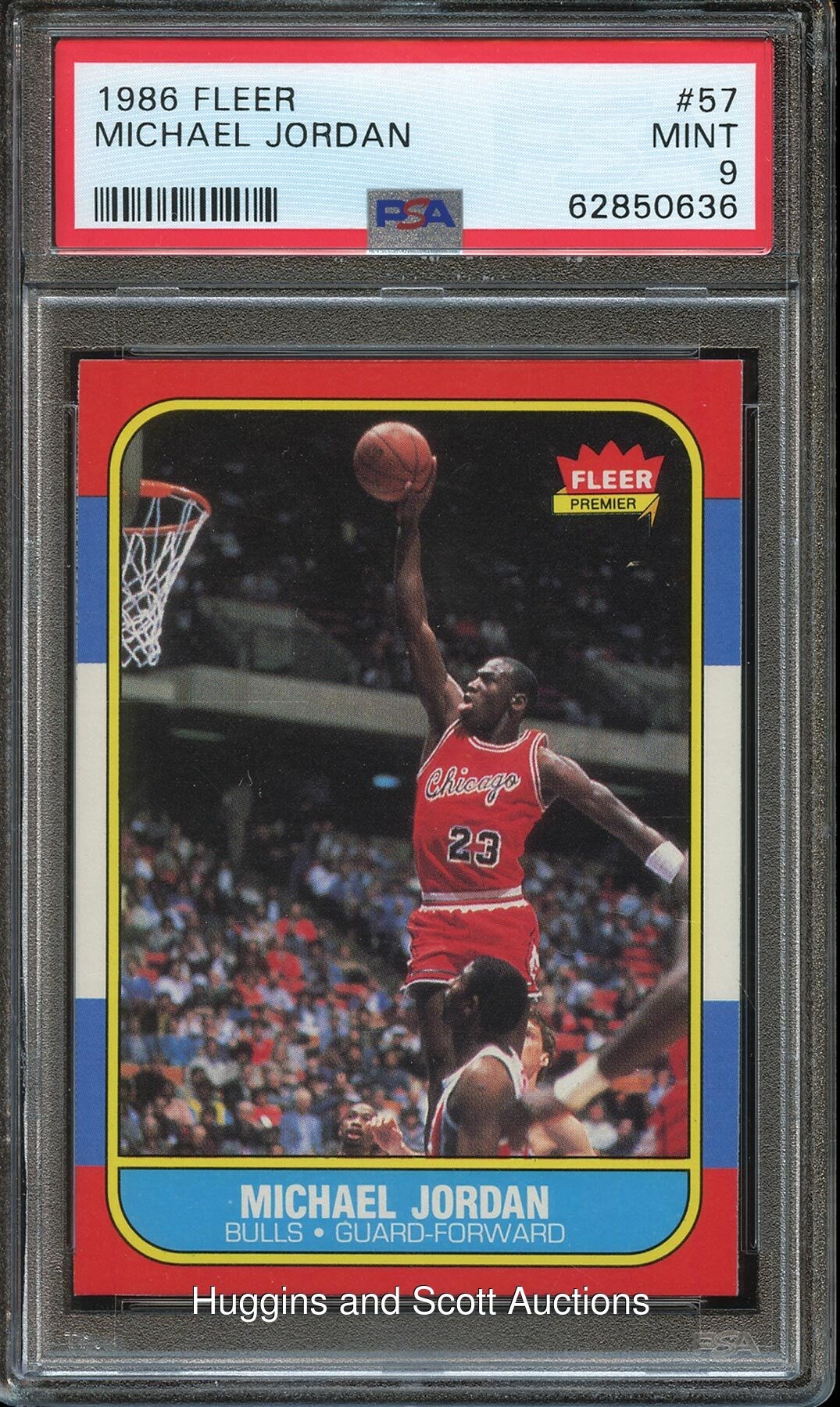Graded Mint 9 by PSA. Strictly mint 1986-87 Fleer Basketball #57 Michael Jordan rookie card! This majestic centerpiece showcases the NBA icon as he soars to the rim past multiple hapless New Jersey Nets onlookers. A centered beauty which showcases four sharp corners, unchipped edges and dynamic surface colors.