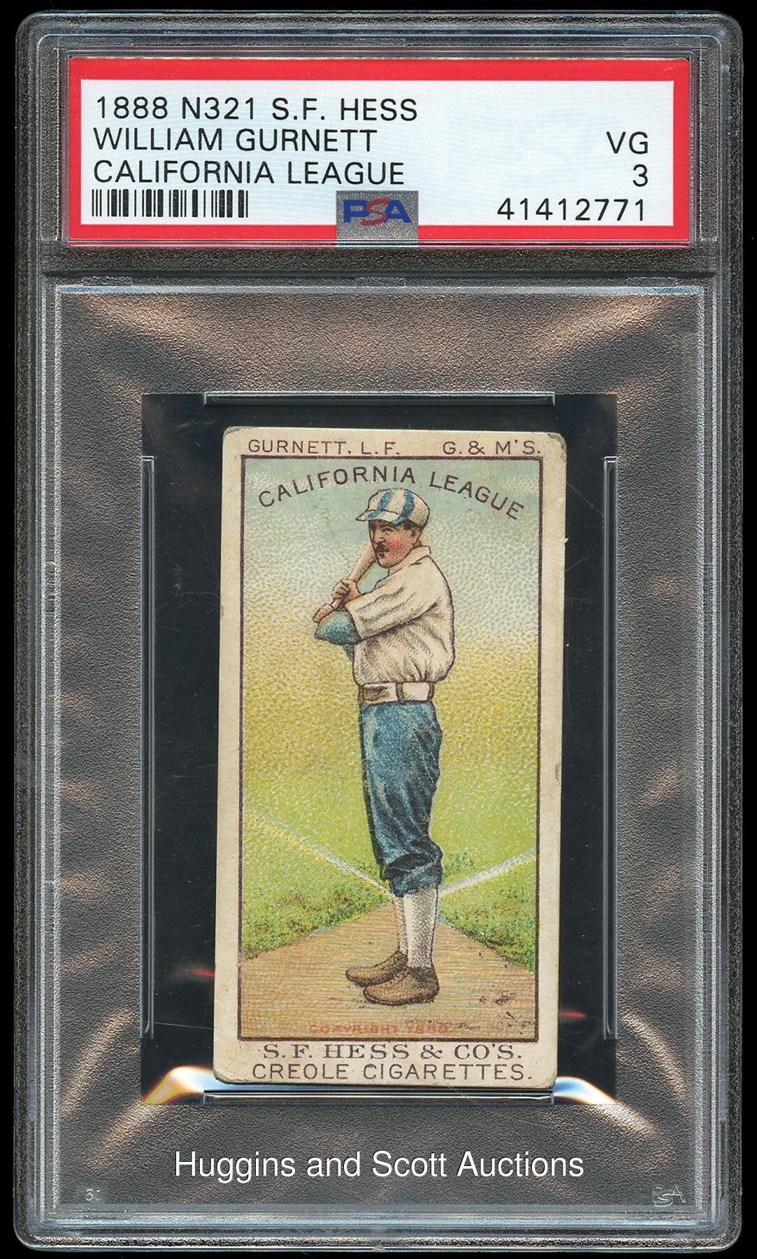 Little is known regarding William Gurnett of the 1888 Oakland Greenhood & Morans, but his cardboard existence is verified with the offered N321 S.F. Hess California League sample. As our national pastime raged in popularity during the late nineteenth century, numerous minor league organizations sprouted from coast to coast. Graded VG 3 by PSA. This lovely artifact portraying the West Coast ballplayer is properly centered with evenly worn corners and lush surface colors. The blank reverse displays mild soiling but is otherwise problem-free. Survives as 1 of 2 graded of the player in any condition!