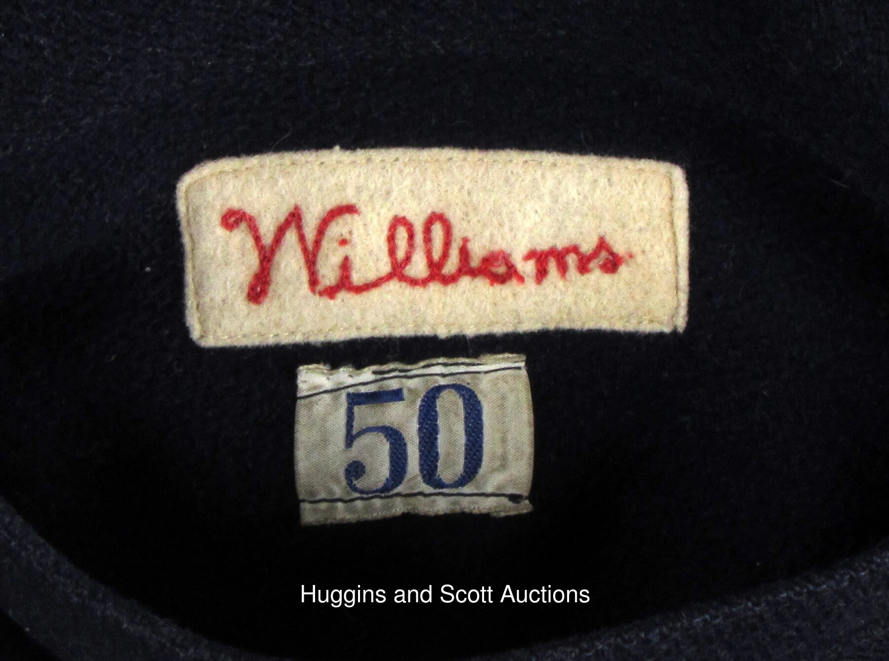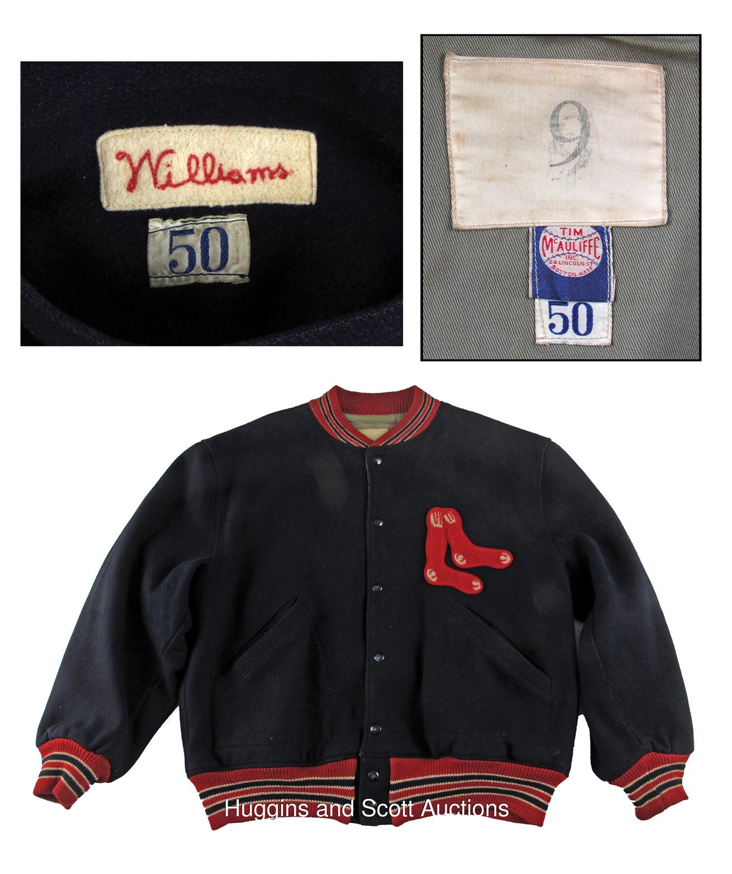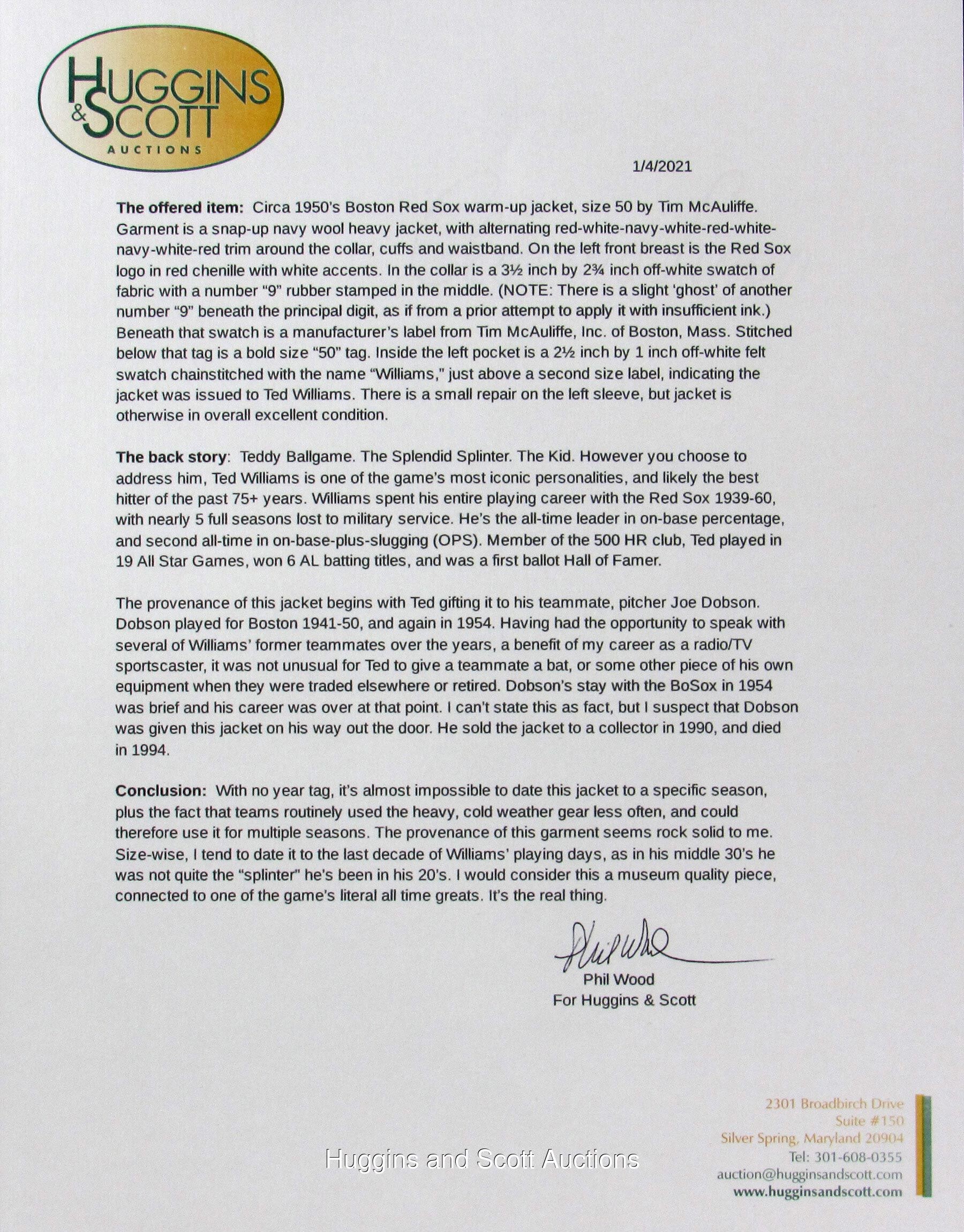 Teddy Ballgame"s jerseys regularly reach the auction block and have sold for as much as $175,000. But his BoSox warm-up jackets? Exponentially rarer. To our knowledge, only three other examples have ever surfaced publicly—all of which were inferior to this beauty. Here"s why: Those predecessors may likewise have featured Williams" number "9", yet none carried his legendary name as this one does. How much more iron-clad can you get than that? Yes, inside the left pocket is the pièce de résistance: a 2-1/2" x 1" felt swatch that"s actually chain-stitched "Williams." In the collar, meanwhile, you have a 3-1/2" x 2-3/4" swatch that"s double-stamped with his immortal "9". What"s more, the manufacturer (McAuliffe) and size (50) are spot on for Williams" 1950s era. Finally, the origin story is perfectly credible, as detailed in an accompanying 2005 LOA from the first buyer, whose Florida business was located 2 hours from Dobson"s home, and who writes, "I purchased this jacket from former Boston Red Sox pitcher Joe Dobson around 1990." Armed with all this evidence, expert authenticator Phil Wood has the confidence to conclude, "The provenance of this garment seems rock solid to me...I would consider this a museum quality piece, connected to one of the game"s literal all time greats. It"s the real thing." Earlier in his LOA, Wood addresses the Dobson angle: "Having had the opportunity to speak with several of Williams" former teammates over the years, a benefit of my career as a radio/TV sportscaster, it was not unusual for Ted to give a teammate a bat, or some other piece of his own equipment when they were traded elsewhere or retired. Dobson"s stay with the BoSox in 1954 was brief and his career was over at that point. I can"t state this as fact, but I suspect that Dobson was given this jacket on his way out the door. He sold the jacket to a collector in 1990, and died in 1994." Need more proof? There"s also the fact that Williams and Dobson had a long Fenway history together. In 1941, after two lackluster years in Cleveland, the 24-year-old righthander arrived in Boston and turned his career around thanks in part to the Kid"s help. As SABR biographer Bill Nowlin recounts, "Equally important [to Dobson"s success] may have been Ted Williams, who had hurt his foot and wanted to take some extra batting practice to help him come back. He asked Joe to throw to him and in the one-on-one pitching repeatedly to a .400 hitter, Joe may have become better able to harness his pitches and develop his control. Author Peter Golenbock added: "They would pretend it was a real game, and Dobson would throw his best. By the time he returned to the Boston lineup as an everyday performer, Williams’ batting skills were honed and sharp."" Little surprise, then, that after more than a decade as teammates and friends, Ted would impart such a special gift upon Joe"s departure. Excellent condition with a small repair on the left sleeve. LOAs from the Florida buyer and from Phil Wood.