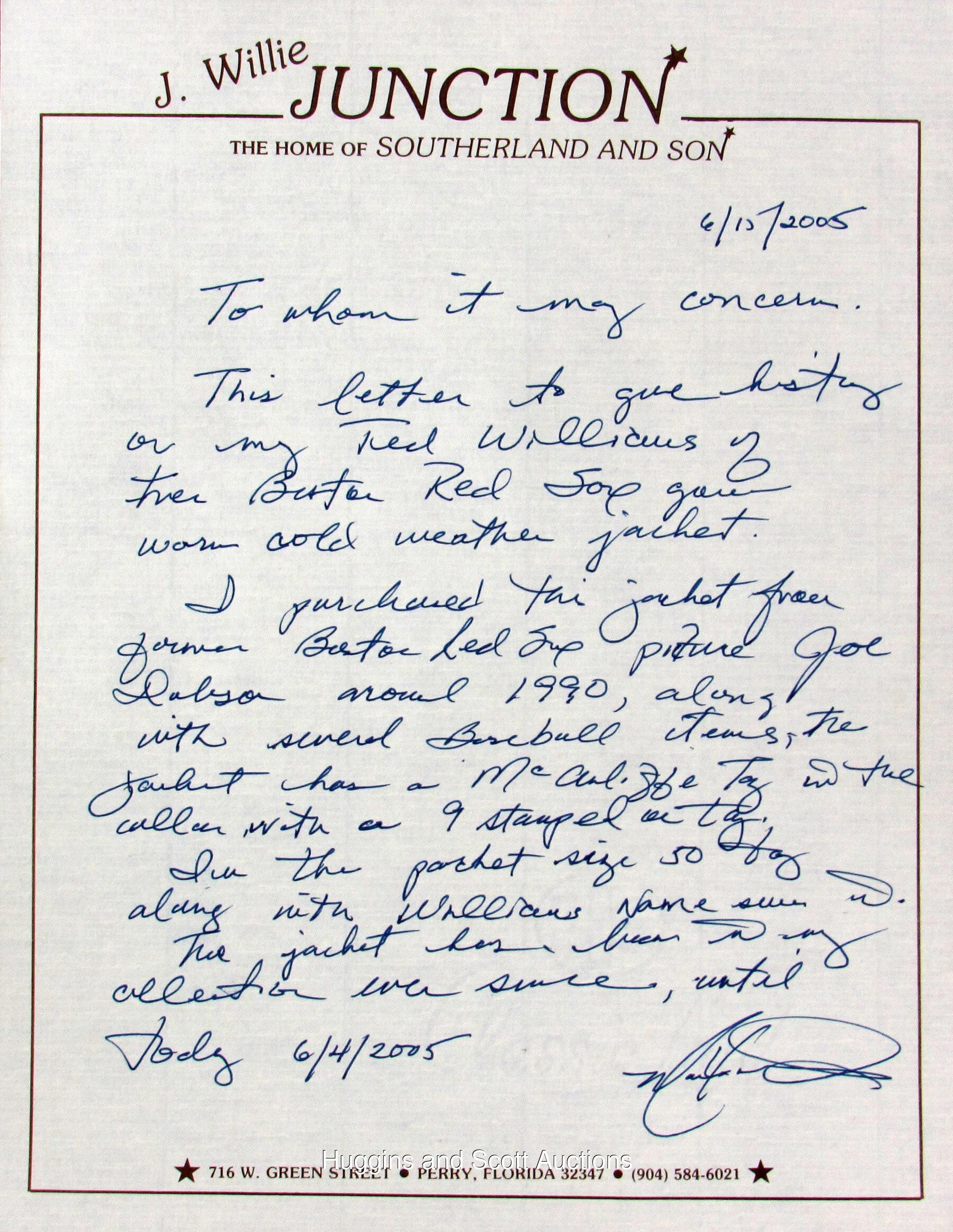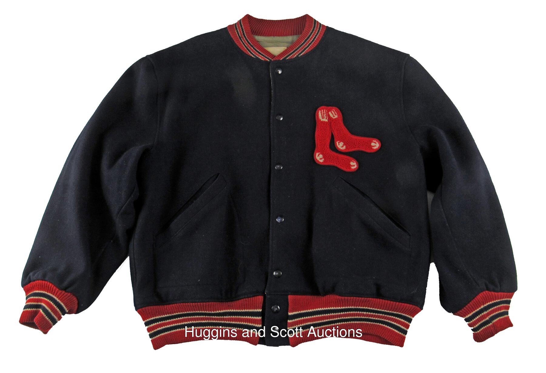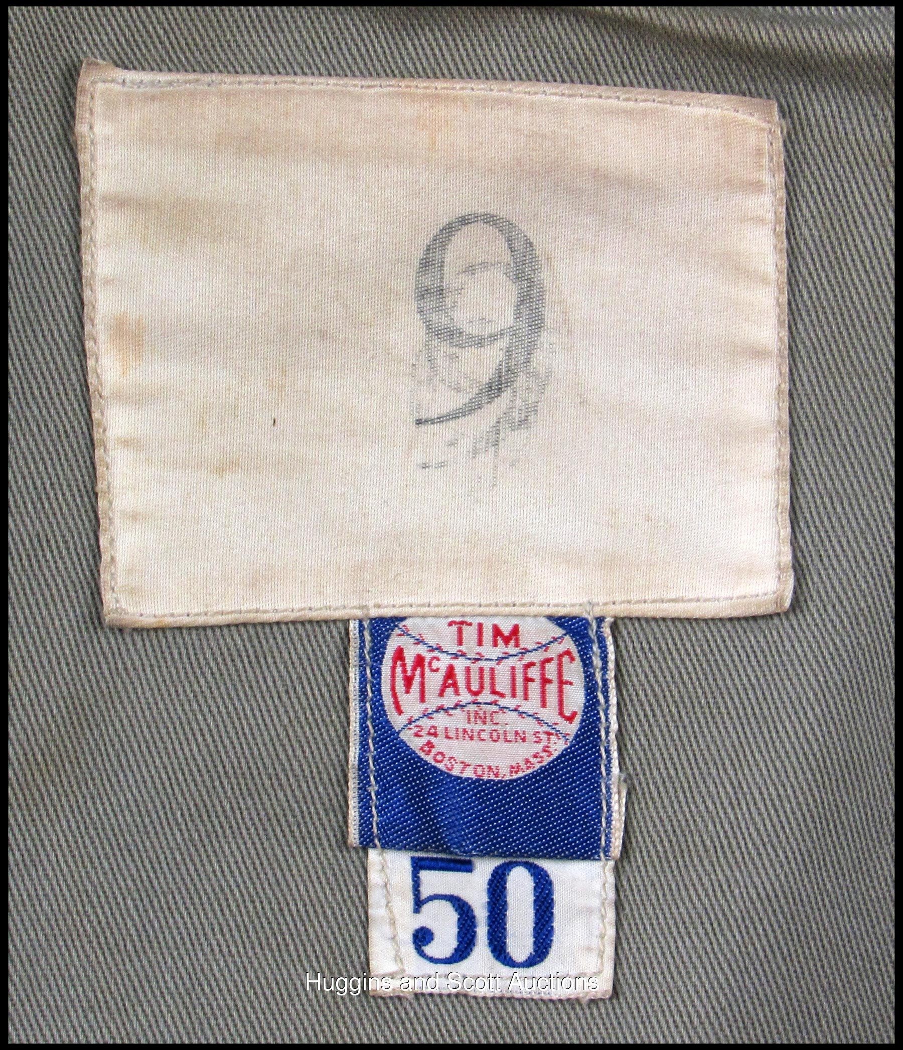 Teddy Ballgame"s jerseys regularly reach the auction block and have sold for as much as $175,000. But his BoSox warm-up jackets? Exponentially rarer. To our knowledge, only three other examples have ever surfaced publicly—all of which were inferior to this beauty. Here"s why: Those predecessors may likewise have featured Williams" number "9", yet none carried his legendary name as this one does. How much more iron-clad can you get than that? Yes, inside the left pocket is the pièce de résistance: a 2-1/2" x 1" felt swatch that"s actually chain-stitched "Williams." In the collar, meanwhile, you have a 3-1/2" x 2-3/4" swatch that"s double-stamped with his immortal "9". What"s more, the manufacturer (McAuliffe) and size (50) are spot on for Williams" 1950s era. Finally, the origin story is perfectly credible, as detailed in an accompanying 2005 LOA from the first buyer, whose Florida business was located 2 hours from Dobson"s home, and who writes, "I purchased this jacket from former Boston Red Sox pitcher Joe Dobson around 1990." Armed with all this evidence, expert authenticator Phil Wood has the confidence to conclude, "The provenance of this garment seems rock solid to me...I would consider this a museum quality piece, connected to one of the game"s literal all time greats. It"s the real thing." Earlier in his LOA, Wood addresses the Dobson angle: "Having had the opportunity to speak with several of Williams" former teammates over the years, a benefit of my career as a radio/TV sportscaster, it was not unusual for Ted to give a teammate a bat, or some other piece of his own equipment when they were traded elsewhere or retired. Dobson"s stay with the BoSox in 1954 was brief and his career was over at that point. I can"t state this as fact, but I suspect that Dobson was given this jacket on his way out the door. He sold the jacket to a collector in 1990, and died in 1994." Need more proof? There"s also the fact that Williams and Dobson had a long Fenway history together. In 1941, after two lackluster years in Cleveland, the 24-year-old righthander arrived in Boston and turned his career around thanks in part to the Kid"s help. As SABR biographer Bill Nowlin recounts, "Equally important [to Dobson"s success] may have been Ted Williams, who had hurt his foot and wanted to take some extra batting practice to help him come back. He asked Joe to throw to him and in the one-on-one pitching repeatedly to a .400 hitter, Joe may have become better able to harness his pitches and develop his control. Author Peter Golenbock added: "They would pretend it was a real game, and Dobson would throw his best. By the time he returned to the Boston lineup as an everyday performer, Williams’ batting skills were honed and sharp."" Little surprise, then, that after more than a decade as teammates and friends, Ted would impart such a special gift upon Joe"s departure. Excellent condition with a small repair on the left sleeve. LOAs from the Florida buyer and from Phil Wood.