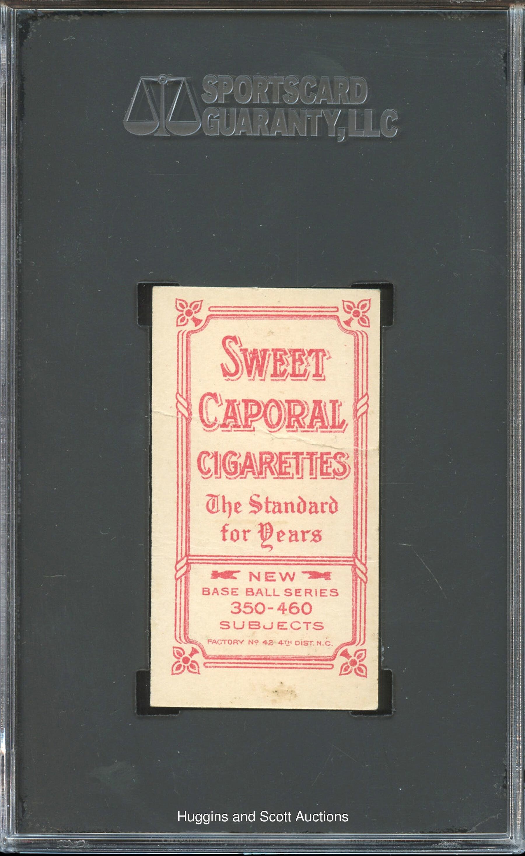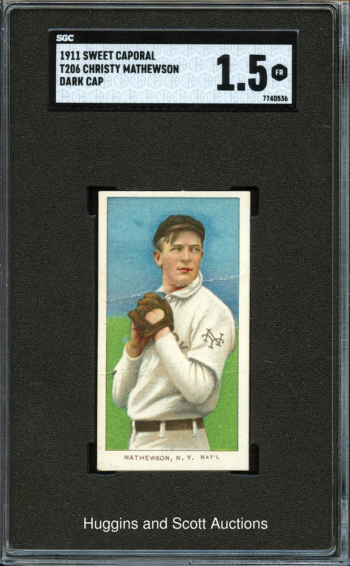 Graded 1.5 Fair by SGC with Sweet Caporal 350-460 Subjects advertising back. Handsome 1909-11 T206 White Borders Christy Mathewson (Dark Cap) pose. Despite a pair of horizontal creases tracing through Matty"s neckline and elbows, the subject still exhibits outstanding eye appeal.