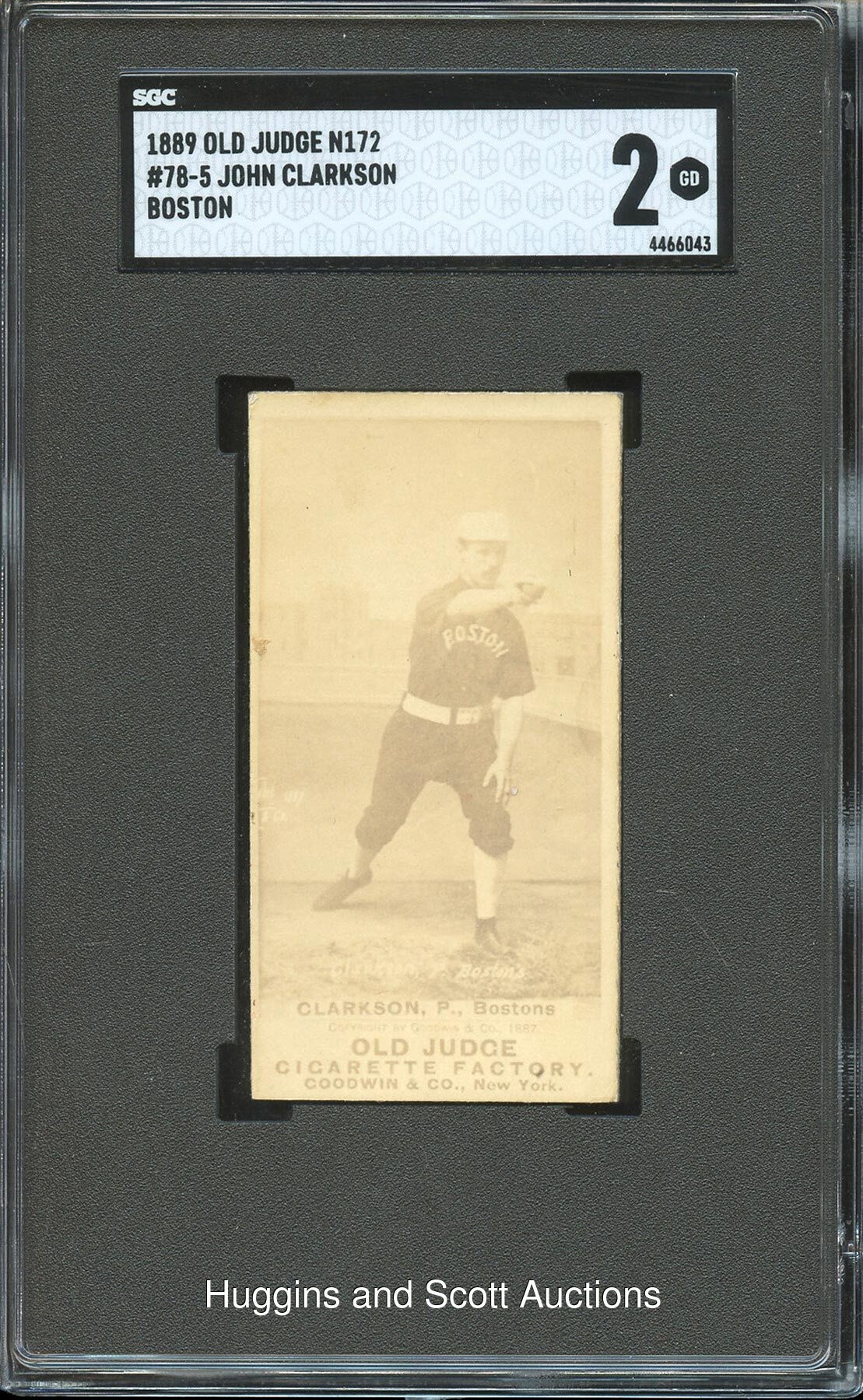 Nineteenth Century Hall of Famer! Graded 2 Good by SGC and confirmed as pose #78-5 (only graded by SGC). Legendary right-hander John Clarkson follows through on the offered 1889 N172 Old Judge (Boston) variation. This Beaneater ace is bolstered by crystal clear sepia imagery with relatively strong corners and edges. Despite reverse soiling and a back crease which does not protrude the surface, this Cooperstown inductee otherwise presents much nicer than the assigned grade. The first example of this pose variant to have been offered in several years.