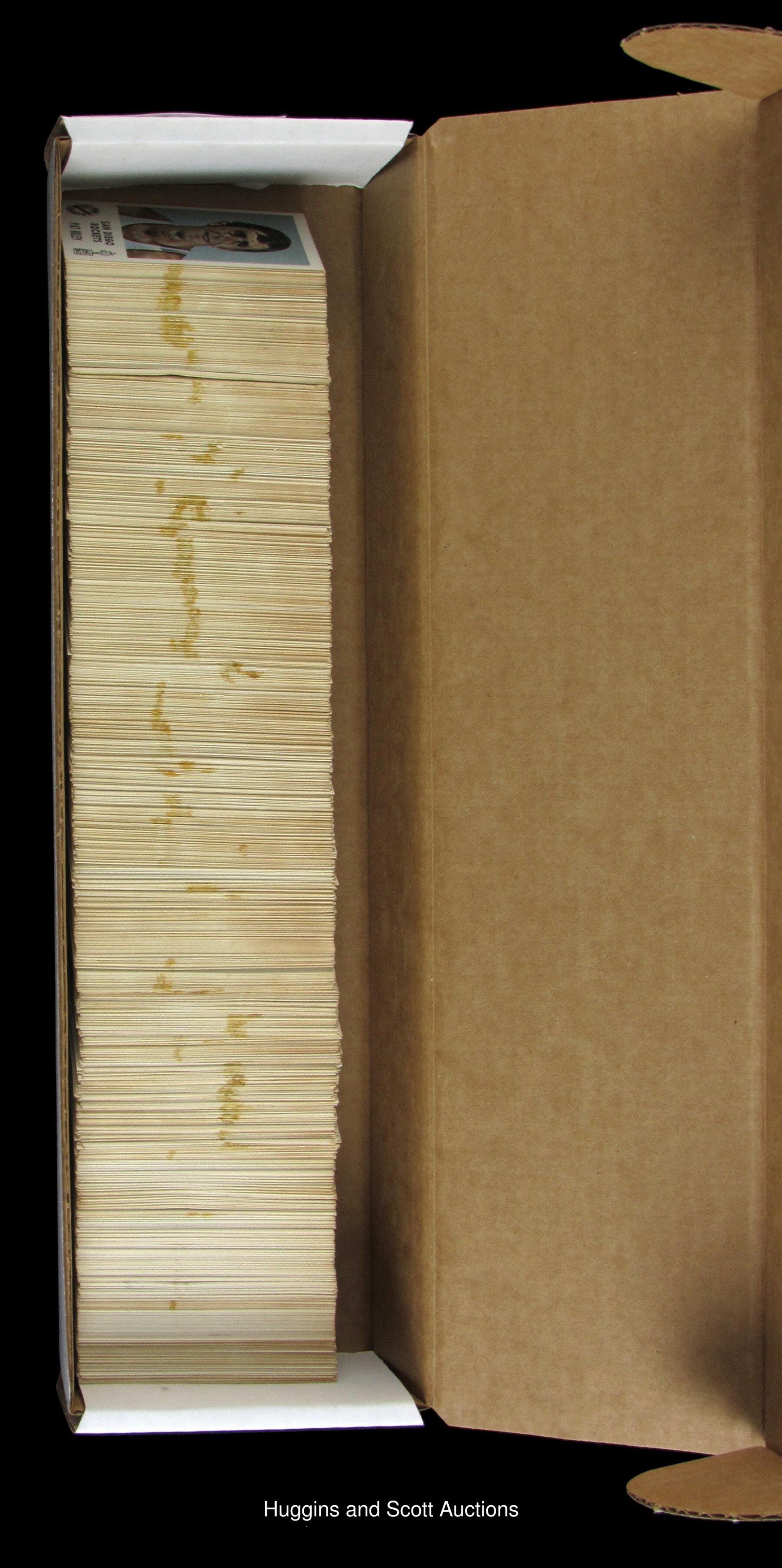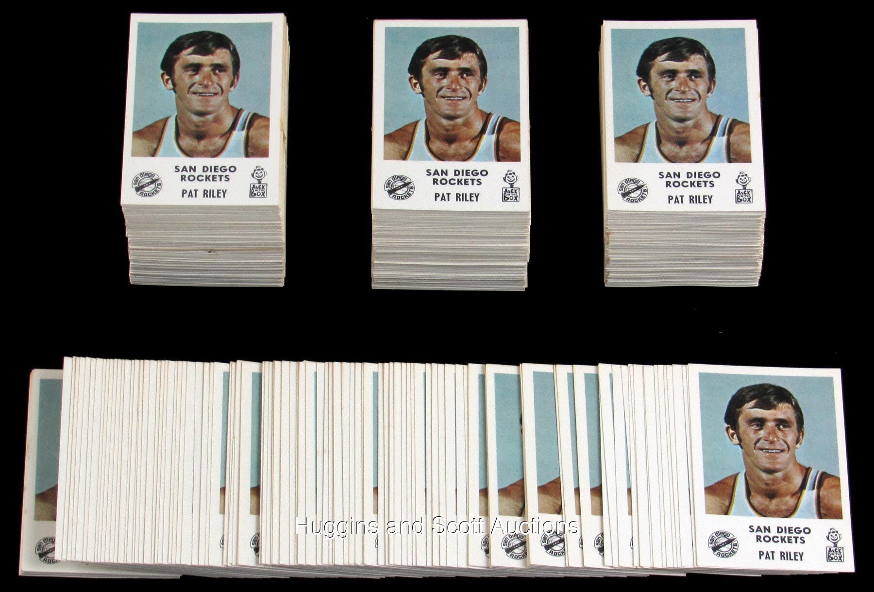 Hit the jackpot with the offered 1968-69 Jack In The Box San Diego Rockets Pat Riley rookie hoard of (1,350+) cards! Despite the majority of cards displaying rubber band impressions (when viewed as a stack from the side) and storage related edge soiling, the majority of the fronts are vibrant and clean with moderate instances of trace edge residue.