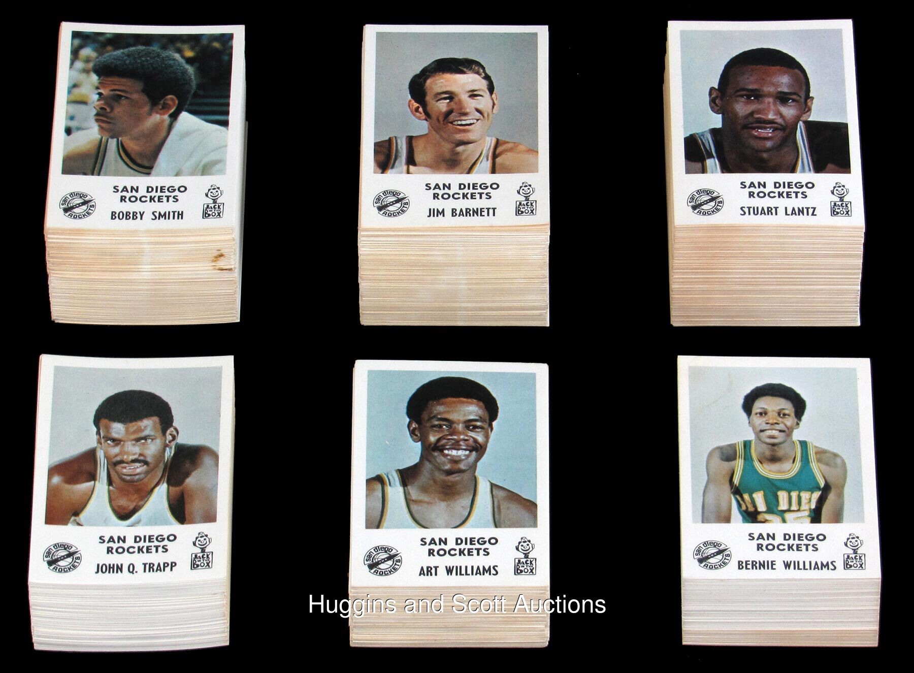 One would have had to dispatch countless burgers in order to score the offered 1968-69 Jack In The Box San Diego Rockets hoard of (21,000+) cards. We’ll save you the calories and provide the cards in this sharp gallery of factory overstock. Varying degrees of rubber band edge residue and soiling may impact the edges, but the fronts/backs are largely clean. Player estimates include: (3,400+) Barnett, (1,100+) Block, (1,000+) Kimball, (2,200+) Kojis, (2,300+) Lantz, (3,200+) B. Smith, (3,000+) Trapp, (2,400+) A. Williams and (2,400+) B. Williams.