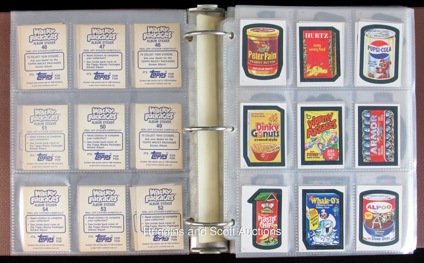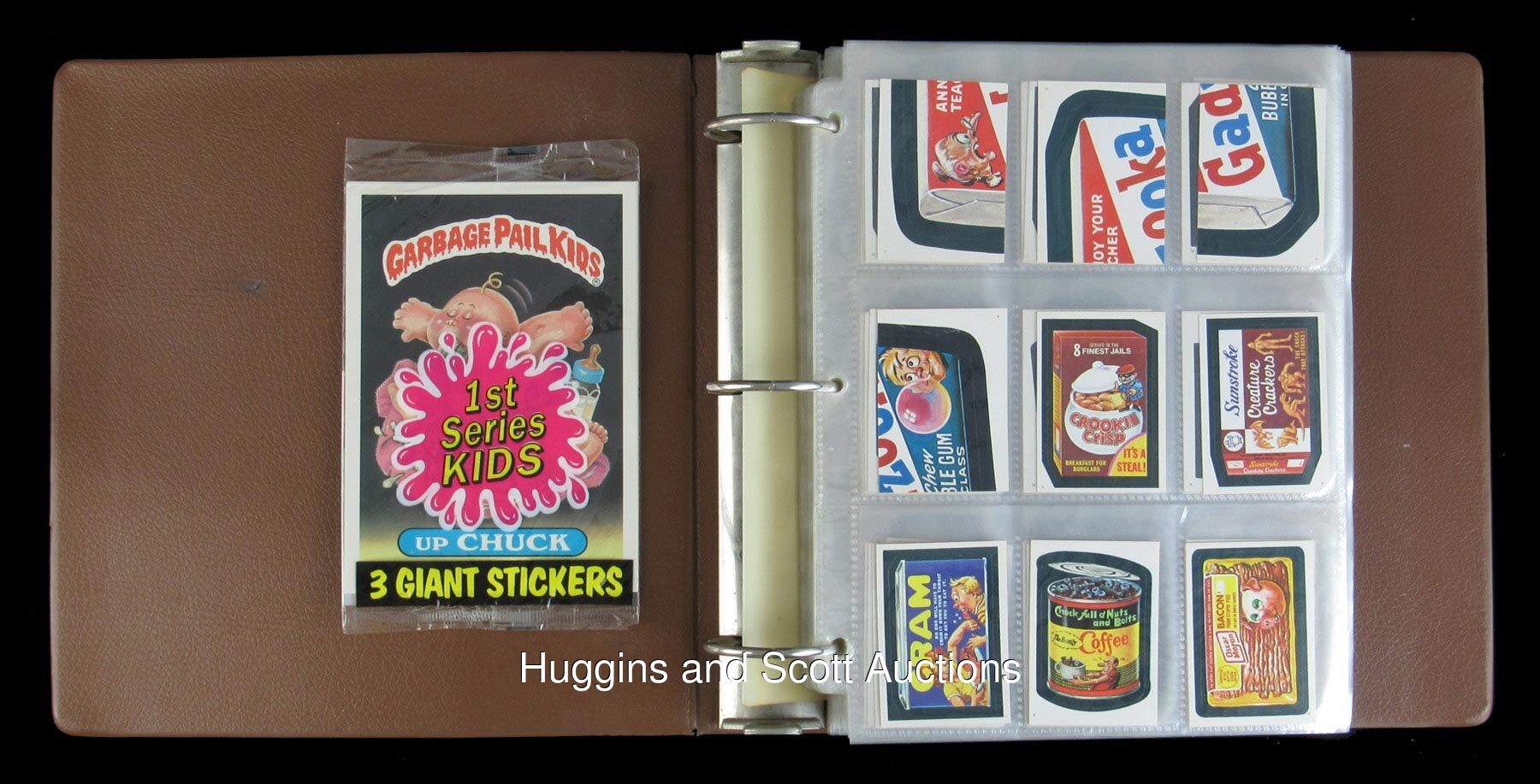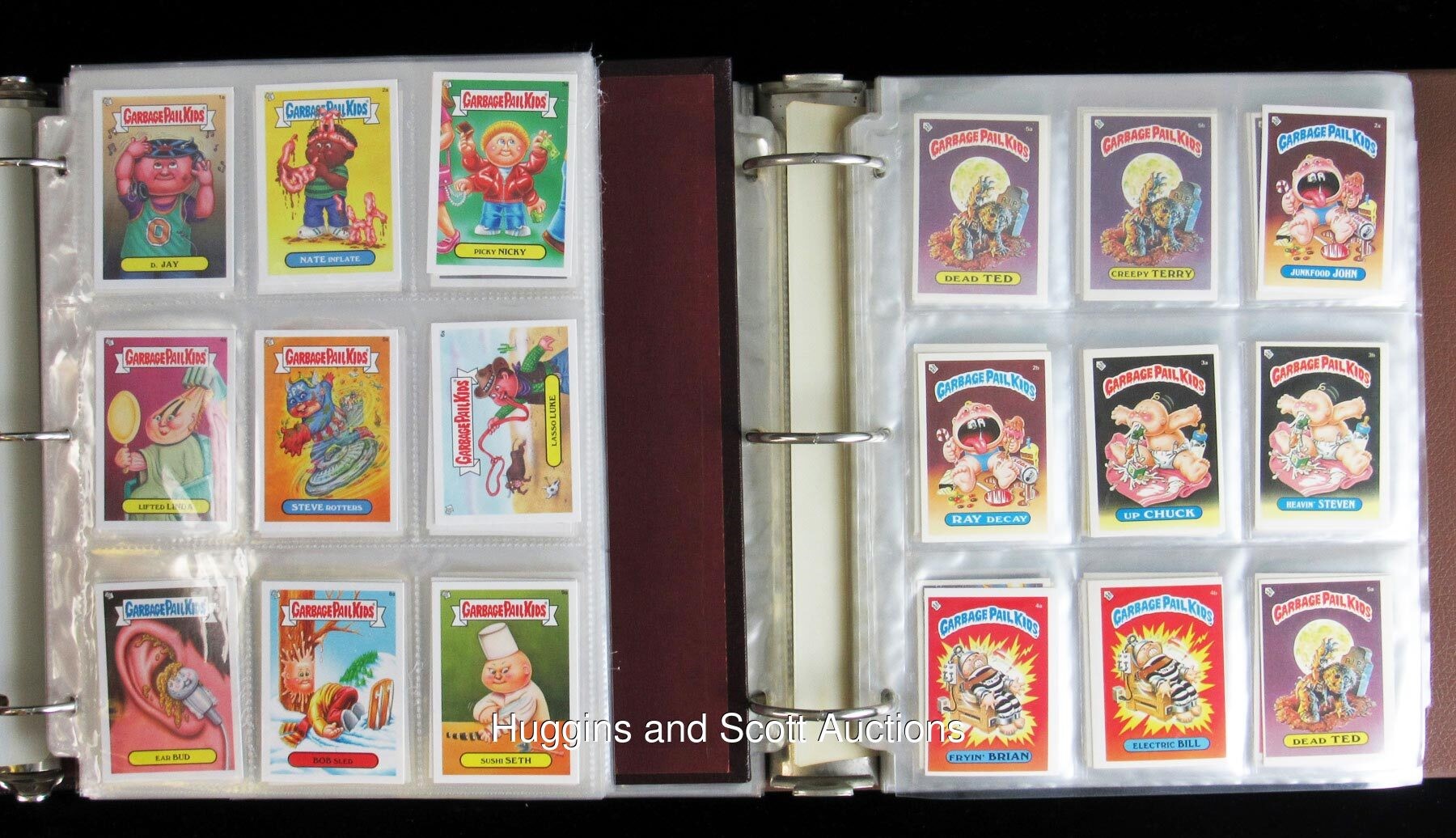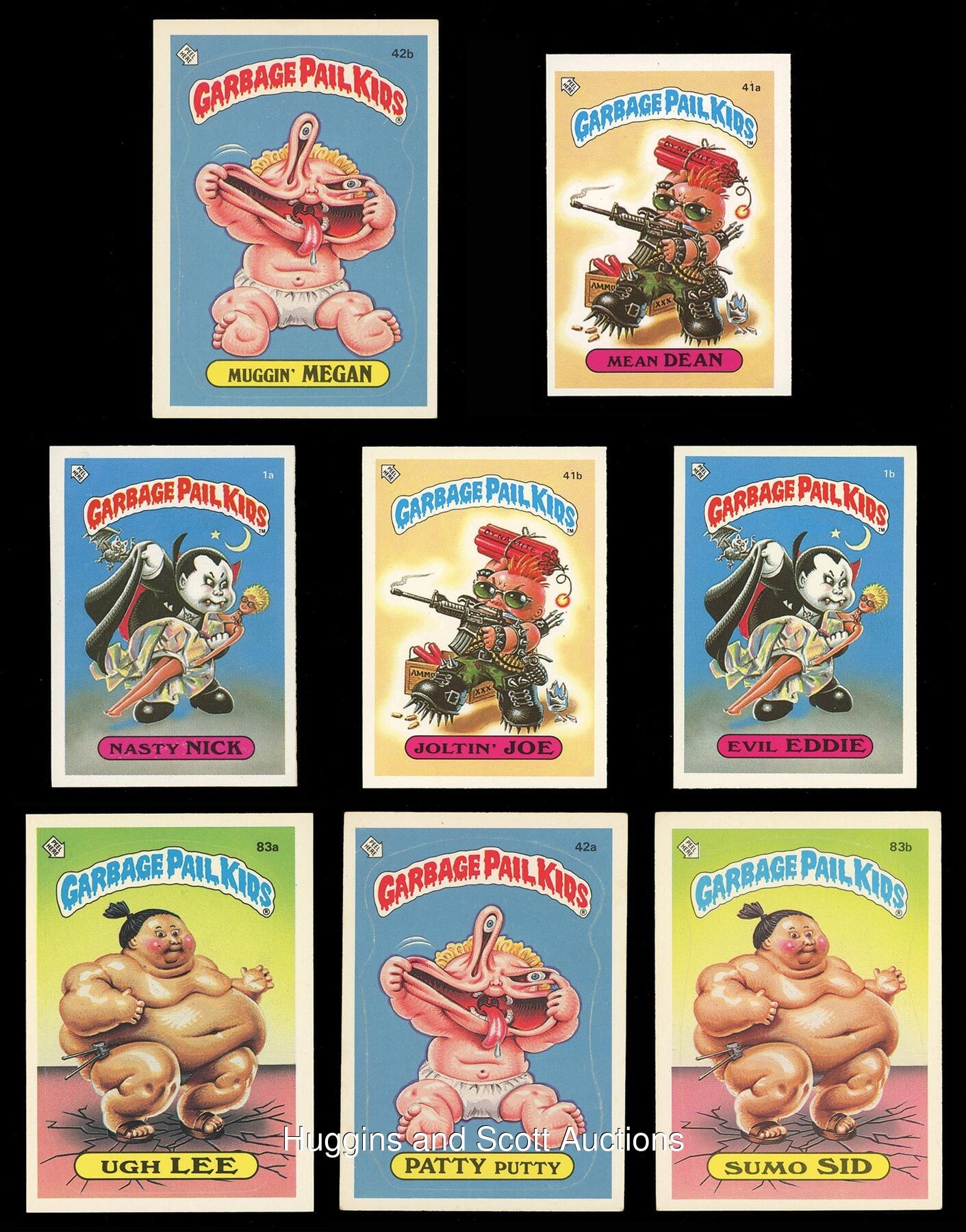 When it comes to grossout humor in the non-sport card realm, Topps Garbage Pail Kids and Wacky Packages reign supreme. Here to tickle your funny bone, is a big collection of 1982-2016 GPK and WP sets in prime condition. Boasting early GPK issues and a set of minis from across the Atlantic, this hefty hoard ranges as (95% NM to MT, 5% lesser). Featured are: 1985 UK Garbage Pail Kids Original Series 1 minis A/B complete set of (82), plus (1) wrapper and (4) duplicates; 1985 Topps Garbage Pail Kids Original Series 2 A/B complete set of (84); 1986 Topps Garbage Pail Kids Original Series 3 A/B complete set of (82); 1986 Topps Garbage Pail Kids Giant Stickers unopened pack (1); 2013 Topps Garbage Pail Kids A/B complete set of (388); 2016 Topps Garbage Pail Kids: As American as Apple Pie A/B near set (83/84), the absent sticker is #5A; 2016 Topps Garbage Pail Kids: America"s Pastimes A/B complete set of (18); 2016 Topps Garbage Pail Kids: American Icon A/B complete set of (18); 2016 Topps Garbage Pail Kids: American Inventor A/B complete set of (18); 2016 Topps Garbage Pail Kids: U.S. Historical Event A/B complete set of (18); 2016 Topps Garbage Pail Kids: Americana Swept Under the Rug A/B complete set of (18); 2016 Topps Garbage Pail Kids: U.S. Summer Olym-Picks A/B complete set of (18); 2016 Topps Garbage Pail Kids: Presidential Candidate A/B complete set of (10); 2016 Topps Garbage Pail Kids: Bathroom Buddies A/B complete set of (6); 2016 Topps Garbage Pail Kids: Americana Devolved A/B complete set of (18); 2016 Topps Garbage Pail Kids: Classic Patriot A/B complete set of (18); 1982 Topps Wacky Packages Album Sticker complete set of (120); 1992 O-Pee-Chee Wacky Packages complete set of (48) and (5) duplicates; 2004 Topps Wacky Packages complete set of (55); plus bonus sticker B1; a complete promo sticker set of (3); and a complete Clingy set of (9); 2014 Topps Wacky Packages retail display box (1) in (VG) condition.