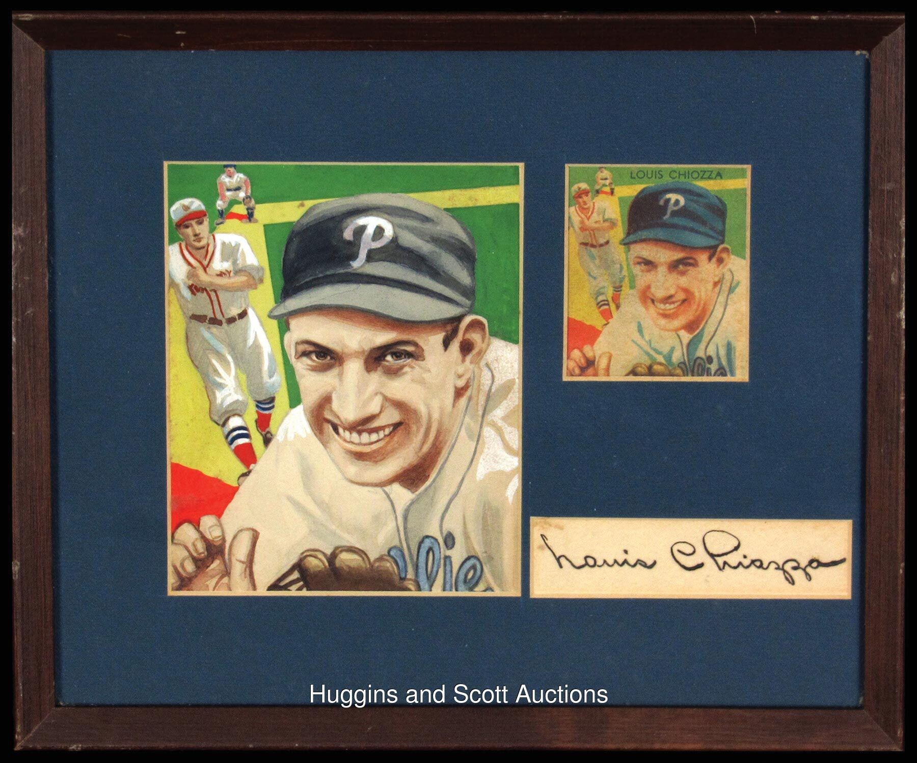 Chiozza has two claims to fame—he was the lead-off batter in major-league baseball"s historic first night game, and he hit a triple past an aging Babe Ruth that signaled (to the Babe, above all) that it was time for Ruth to hang up his spikes for good. This original portrait from the Diamond Stars set measures 4-1/4" x 5-1/4" and is so beautifully rendered, it makes the card itself a pale comparison! Also featured is Chiozza"s jet-black, "8"-strength cut signature. All three pieces bear some peripheral age wear/foxing within their weathered 9" x 10-1/2" frame. Auction LOA from JSA. Frames included with lots: while we make every effort to protect the frames included in these lots during pre-auction storage and post-auction shipping, we are not responsible for any damage to the frames themselves, and no refunds will be given due to frame damage.