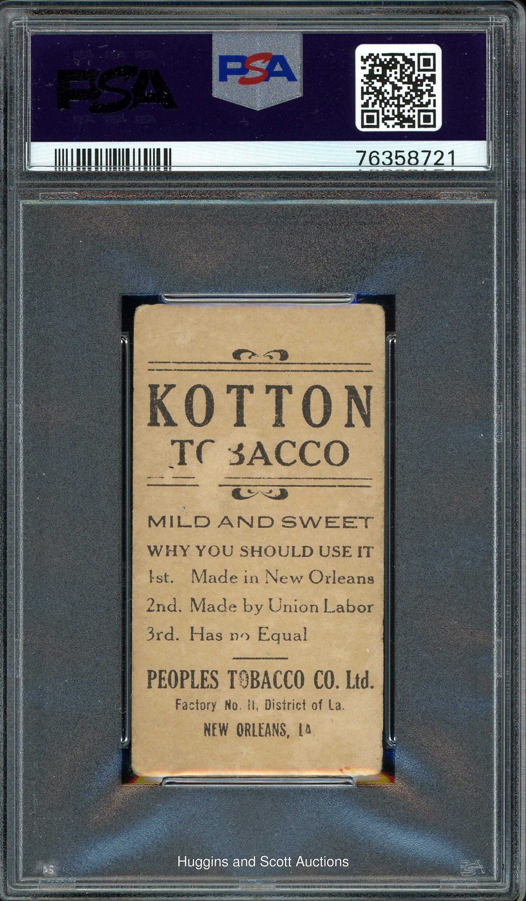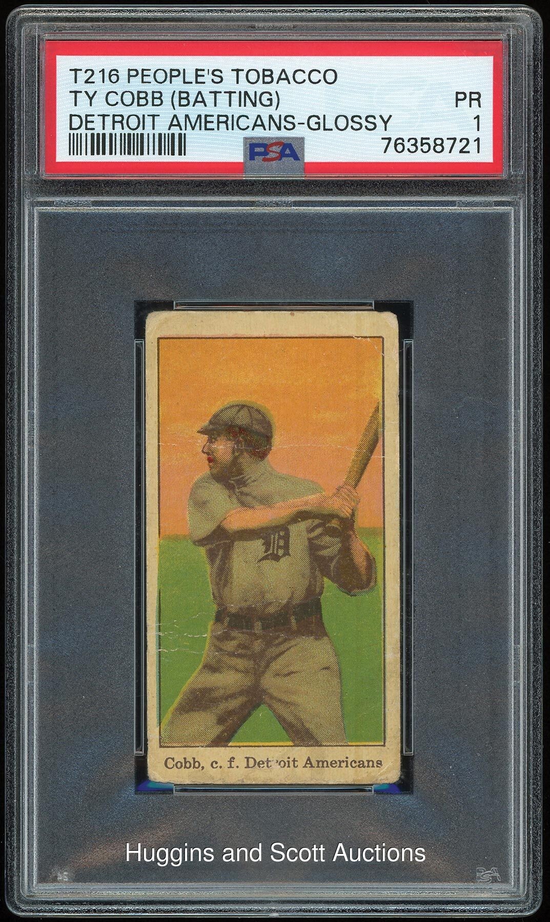 Graded Poor 1 by PSA. Remarkable 1911-14 T216 Kotton Ty Cobb (Batting) pose. This glossy treasure was released under the People's Tobacco brand umbrella of New Orleans and is among the very last survivors from that designation. The E90-1 American Caramel parallel portrays the fearsome Tiger striding into an ill-fated pitch. Despite a series of horizontal creases and a patch of reverse paper loss, the overall presentation of this ultimate Type card is still quite pleasing. Make your own "Louisiana Purchase" with this Class of 1936 Hall of Famer!