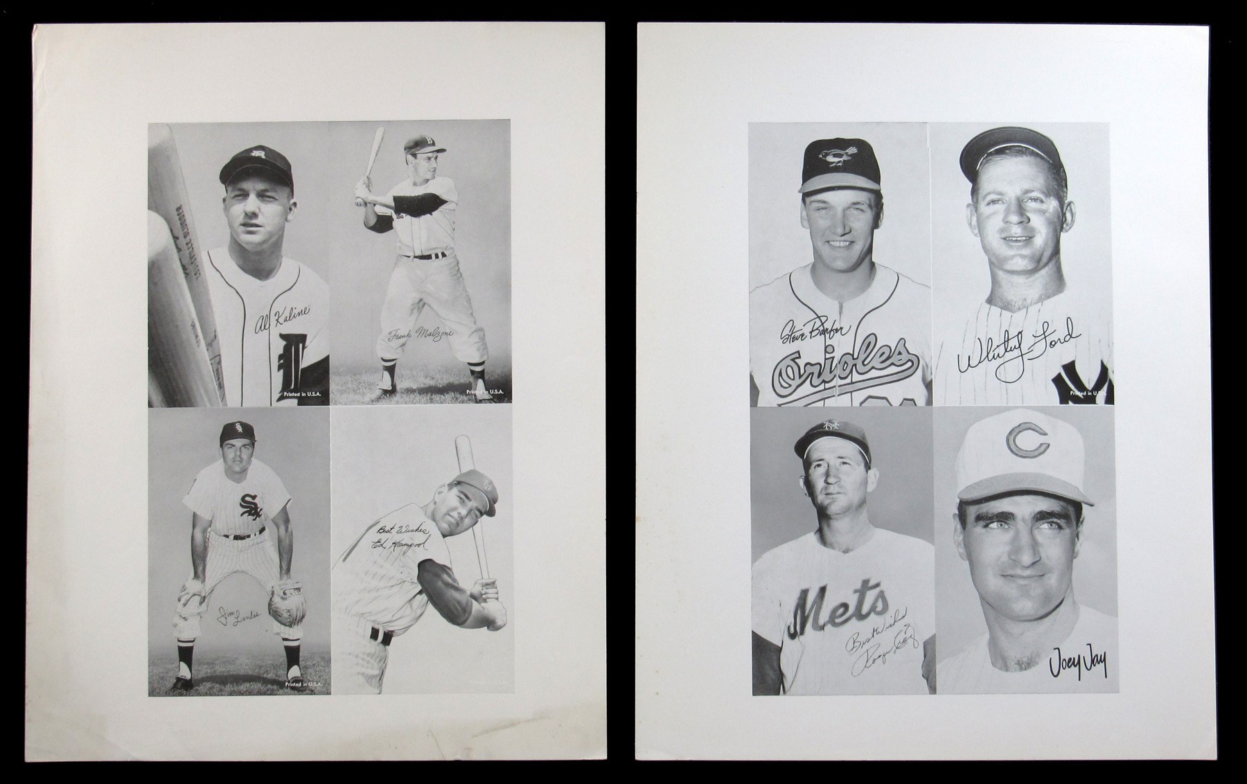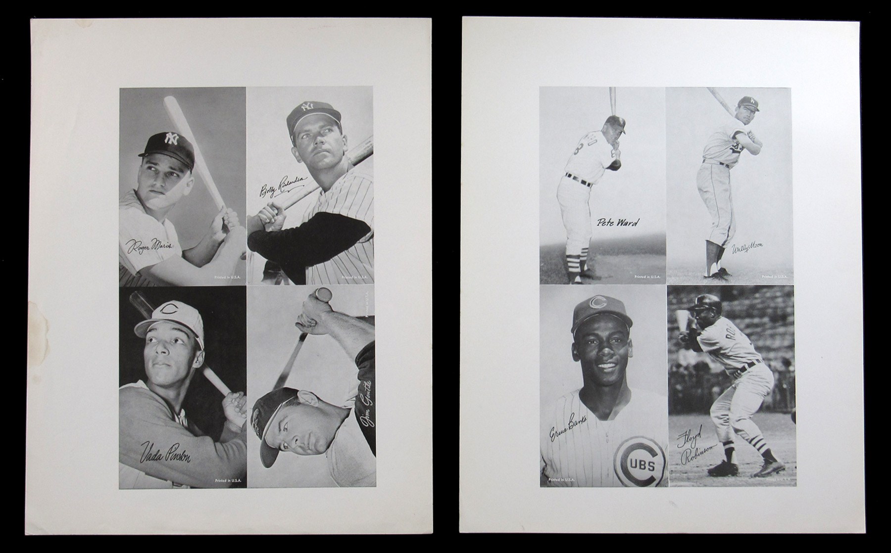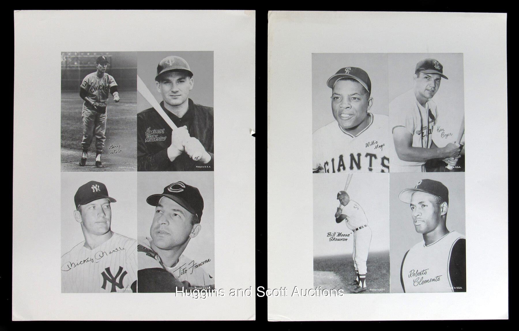 One-Year Mantle? From the tail end of the manufacturer's production run arrives these six circa 1966 Baseball Exhibits paper proof uncut sheets. Each 11x14 page pictures four ball players with several Hall of Famers and tough shortprints making an appearance. Despite evidence of perimeter wear and limited staining, the (24) total subjects survive in flawless condition. Highlights include: Banks (Portrait), Clemente (Portrait), Ford (Portrait), Kaline (Portrait, with Two Bats), Killebrew (with Bat), Kranepool SP, Mantle (Portrait), Maris, Mays (Portrait), Peters SP, Richardson SP, Skowron SP and Ward SP.