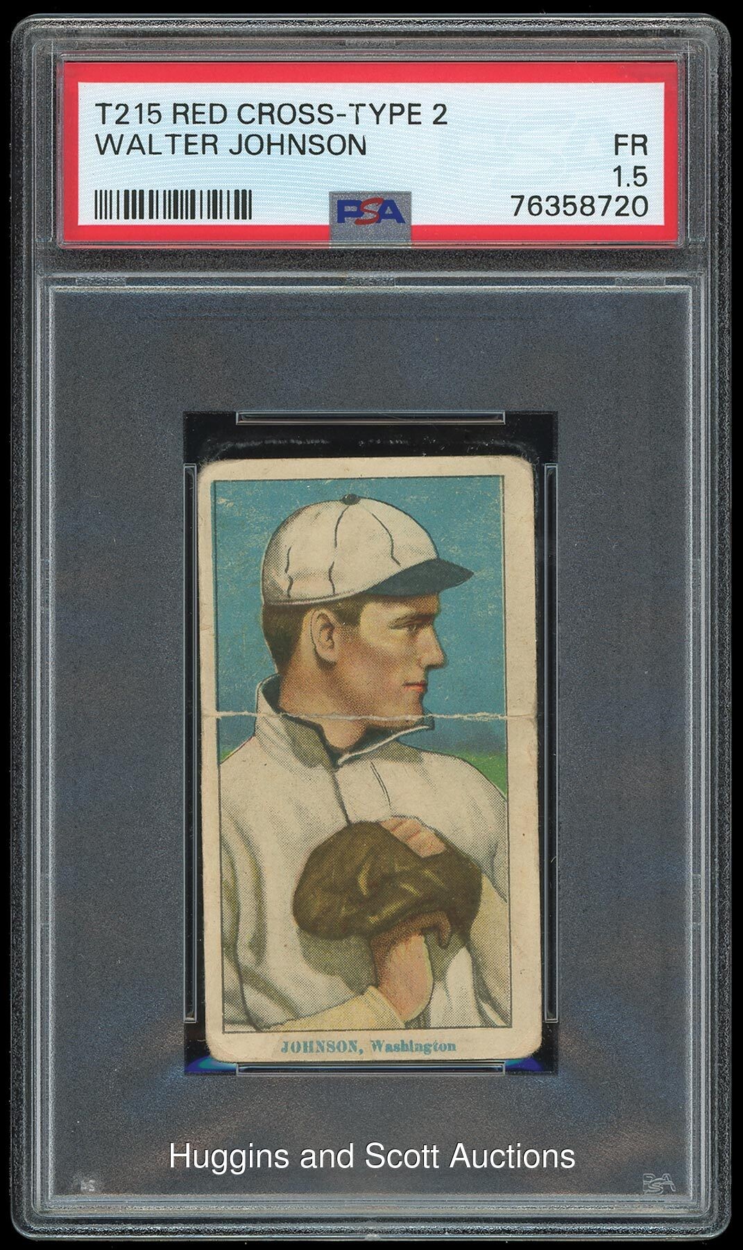 Only 2 Graded! Graded Fair 1.5 by PSA. In an industry where the term “rare” is often bandied about, the offered 1912-13 T215-2 Red Cross Walter Johnson is proof positive that the near impossible still occurs. Believed to have been issued only in the Louisiana region, this "Big Train" was recently uncovered by our California-based consignor. While this 1909-11 T206 White Borders parallel displays horizontal creasing and perimeter wear associated with its overall judgment, the Class of 1936 Hall of Fame subject is still immediately recognizable and displays bold surface colors. Of utmost importance, the elusive advertising back is completely absent of paper loss/residue or writing.