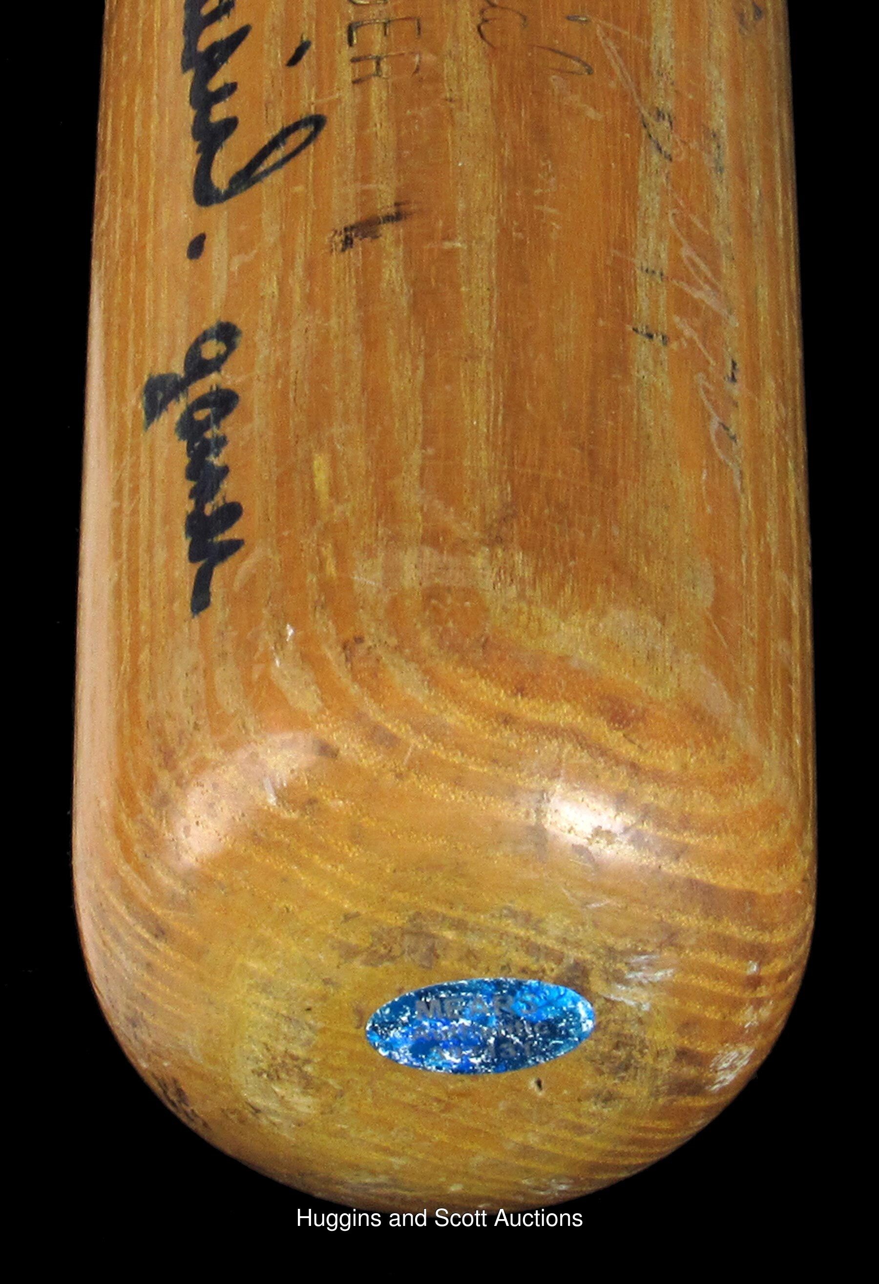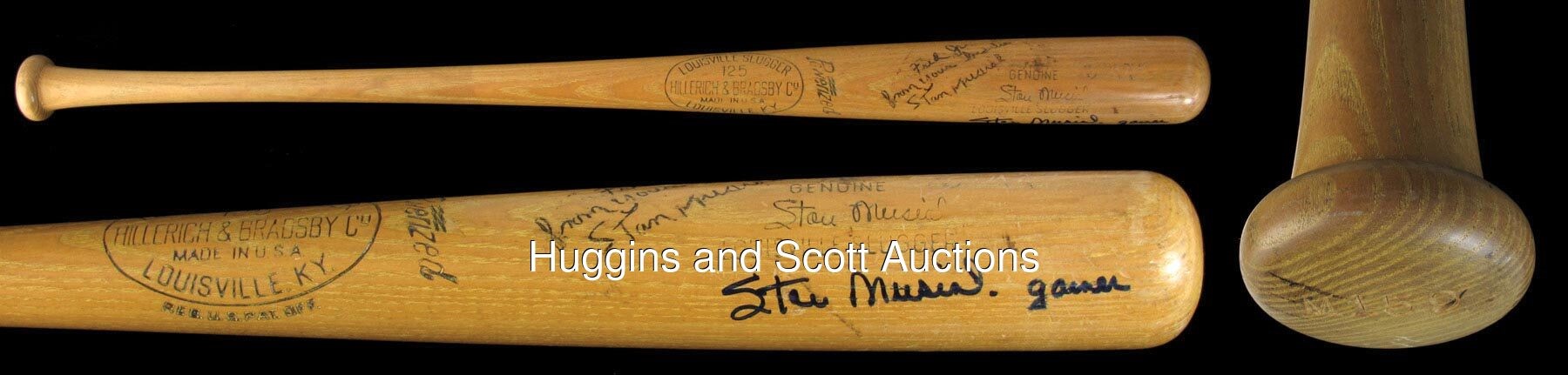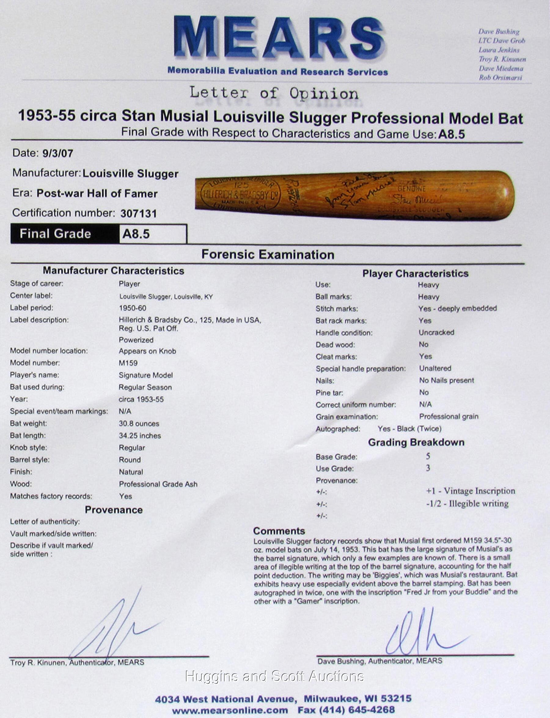 Make solid contact with Stan Musial, when you get your hands on this twice-signed, game-used bat. A Louisville Slugger dating from 1953-1955, this genuine Musial signature model has a lot going for it. A Musial facsimile autograph located on the barrel, identifies this bat as a rare "large signature" type, of which only a few examples are known, making it a prime target for advanced collectors. Heavy signs of authentic use include contact marks, baseball stitch impressions, bat rack streaks, cleat impressions, and tape residue on the handle. Musial has signed twice on the barrel, with one signature ("7.5") personalized with "Fred Jr. from your buddie"; and the other signature ("9.5") accompanied by the inscription "gamer". Also noted on the barrel, is ghosting of the inscription "Biggies", which was the name of Musial's restaurant in St. Louis. The model number M159 is impressed into the knob, and a Mears certification sticker is located on the end of the barrel. The accompanying full photo LOA from Mears assigns an authentic game use grade of (A8.5), and notes that the bat is consistent with the factory records. Auction LOA from JSA for the autographs.