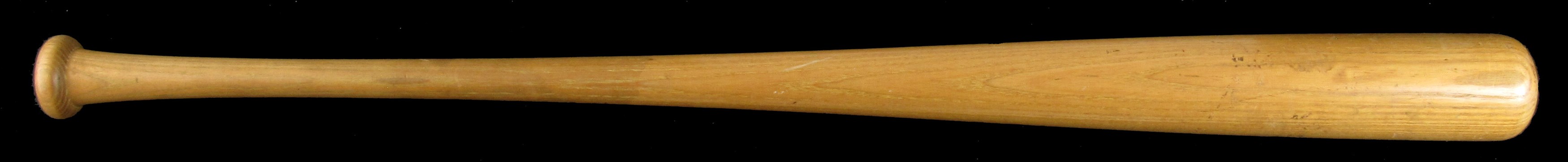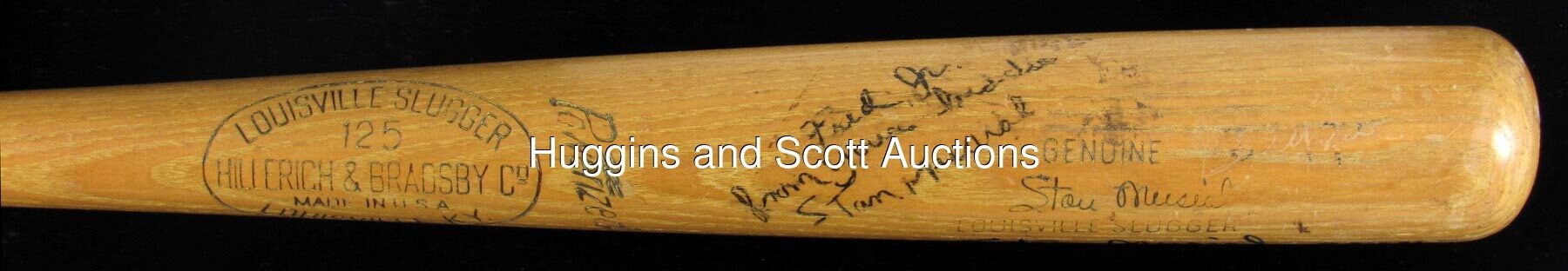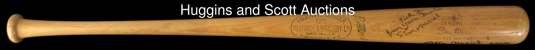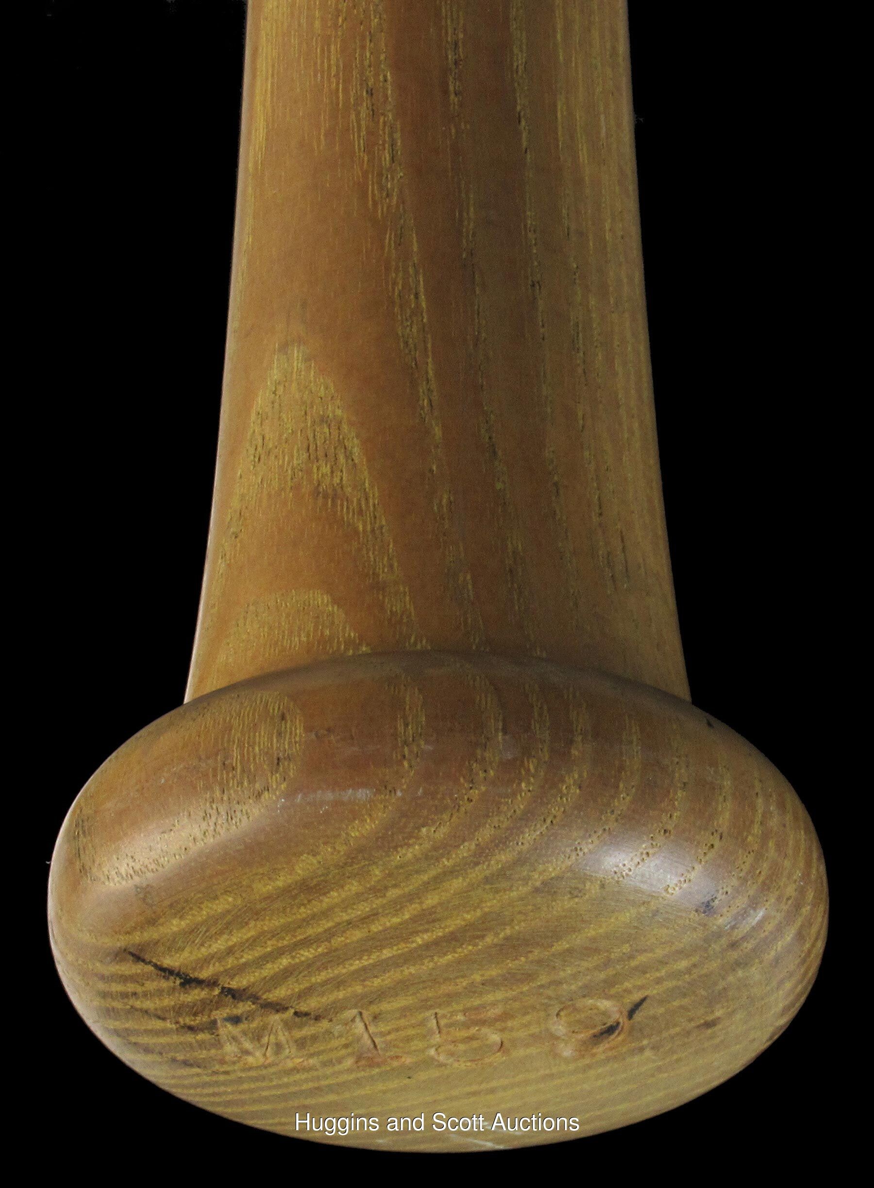 Make solid contact with Stan Musial, when you get your hands on this twice-signed, game-used bat. A Louisville Slugger dating from 1953-1955, this genuine Musial signature model has a lot going for it. A Musial facsimile autograph located on the barrel, identifies this bat as a rare "large signature" type, of which only a few examples are known, making it a prime target for advanced collectors. Heavy signs of authentic use include contact marks, baseball stitch impressions, bat rack streaks, cleat impressions, and tape residue on the handle. Musial has signed twice on the barrel, with one signature ("7.5") personalized with "Fred Jr. from your buddie"; and the other signature ("9.5") accompanied by the inscription "gamer". Also noted on the barrel, is ghosting of the inscription "Biggies", which was the name of Musial's restaurant in St. Louis. The model number M159 is impressed into the knob, and a Mears certification sticker is located on the end of the barrel. The accompanying full photo LOA from Mears assigns an authentic game use grade of (A8.5), and notes that the bat is consistent with the factory records. Auction LOA from JSA for the autographs.