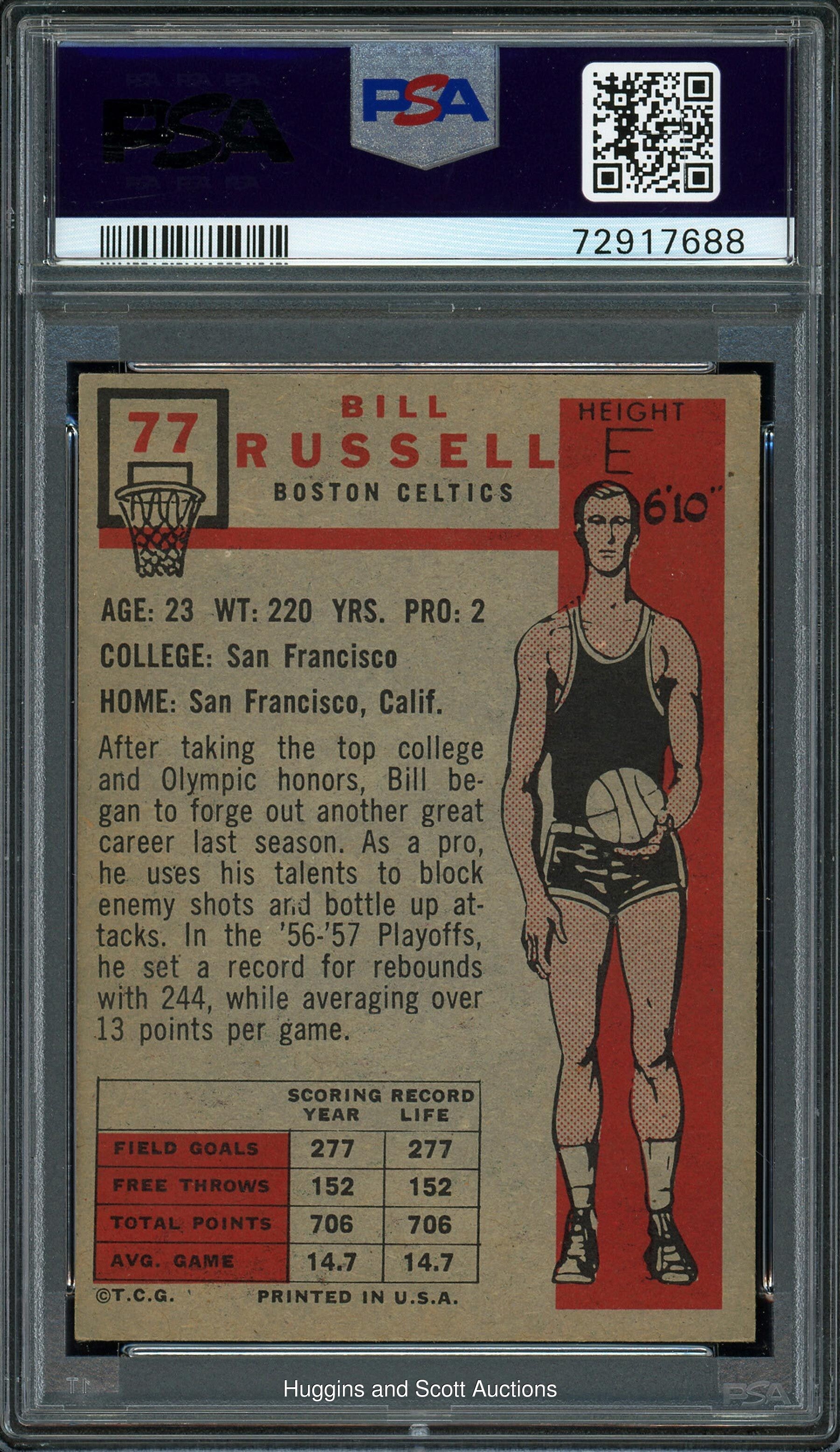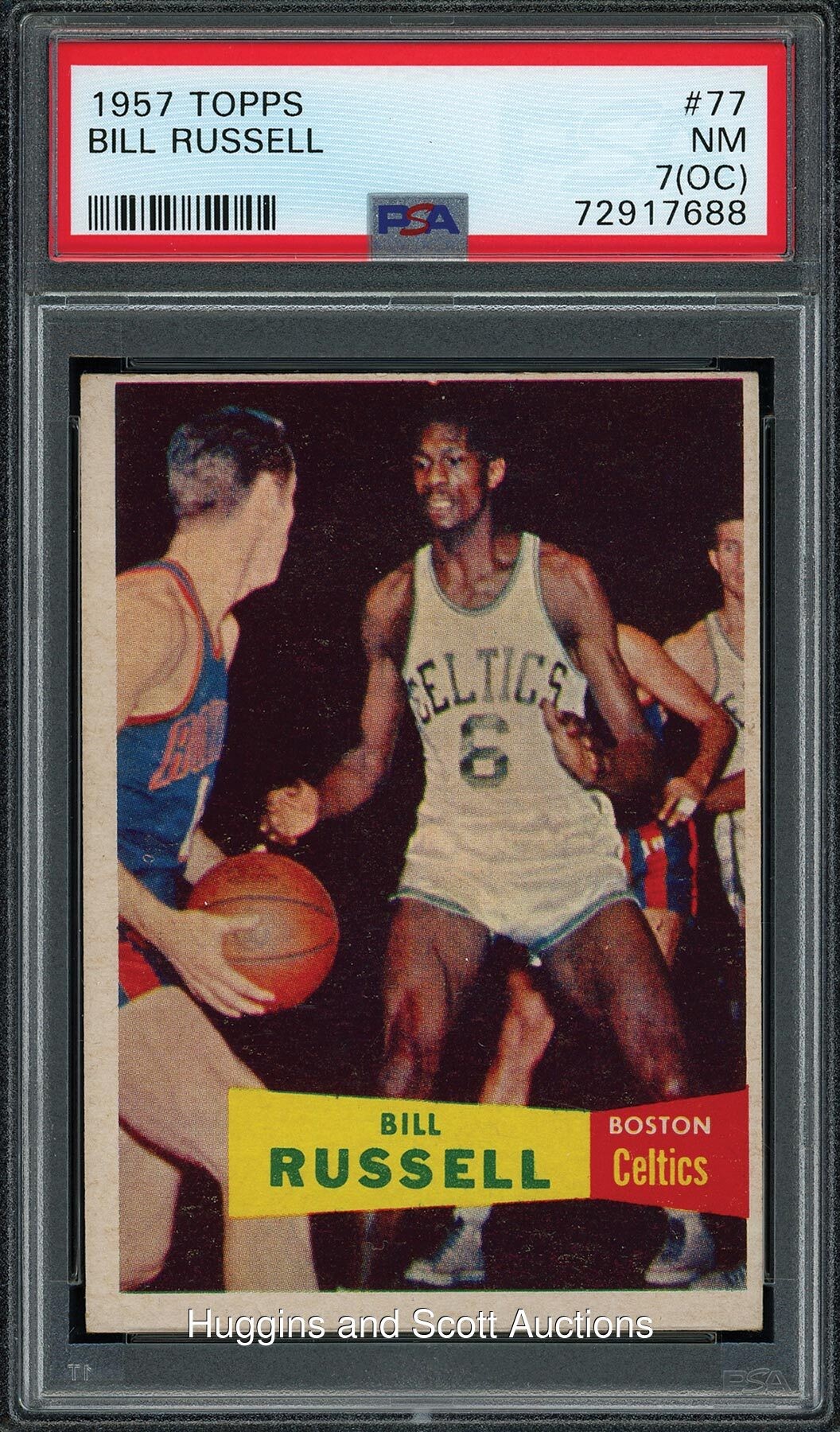 Graded NM 7 by PSA with an (oc) qualifier. "The Secretary of Defense" can rightly be considered "the ring leader" of the Boston Celtics franchise. The offered 1957-58 Topps Basketball #77 Bill Russell rookie card pictures the towering center guarding an ill-fated rival. This debut is crease-free with crisp corner/edge wear. Despite factory errant top-to-bottom centering common to the issue, this "prime time" proposition still presents admirably.