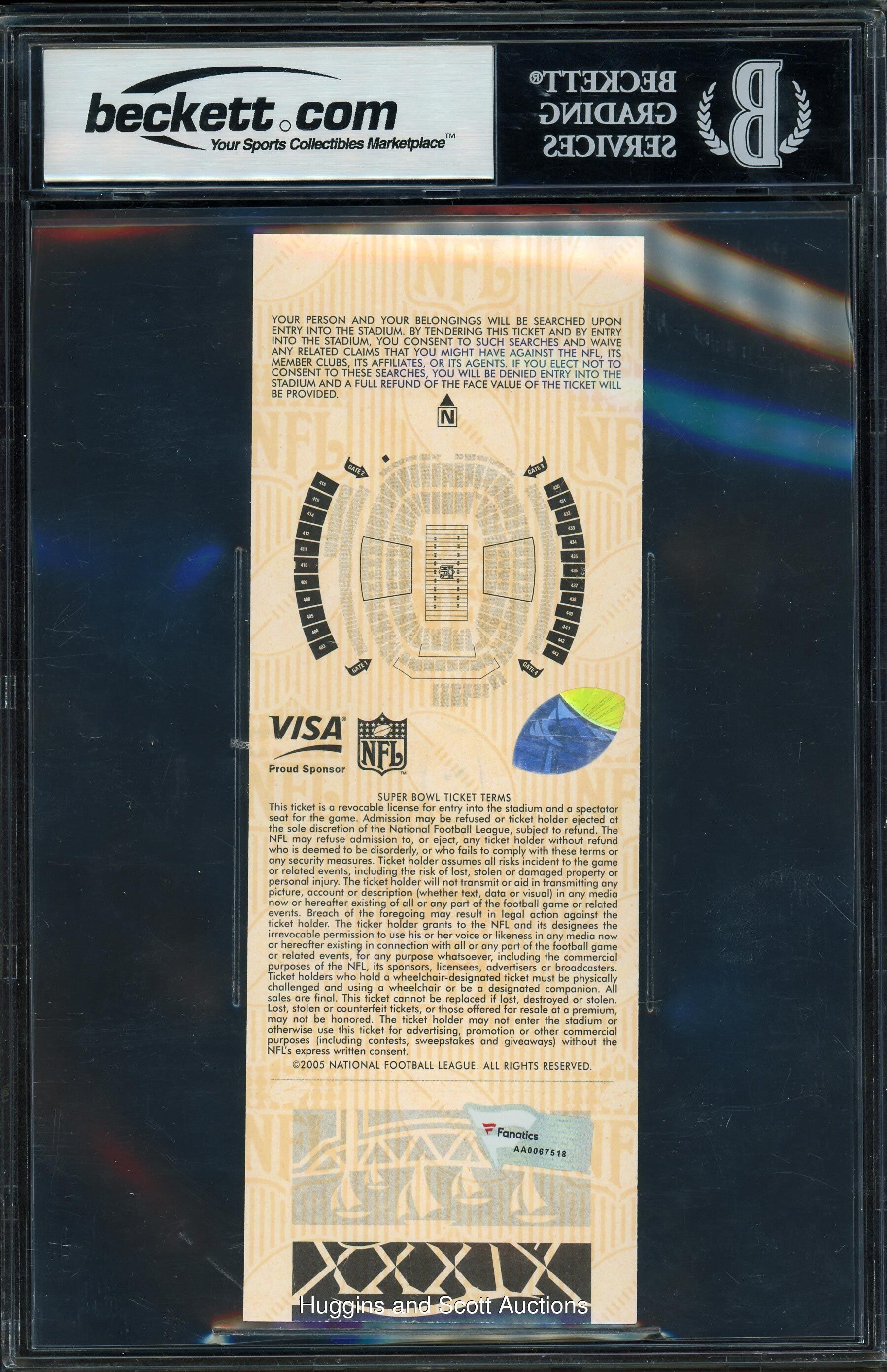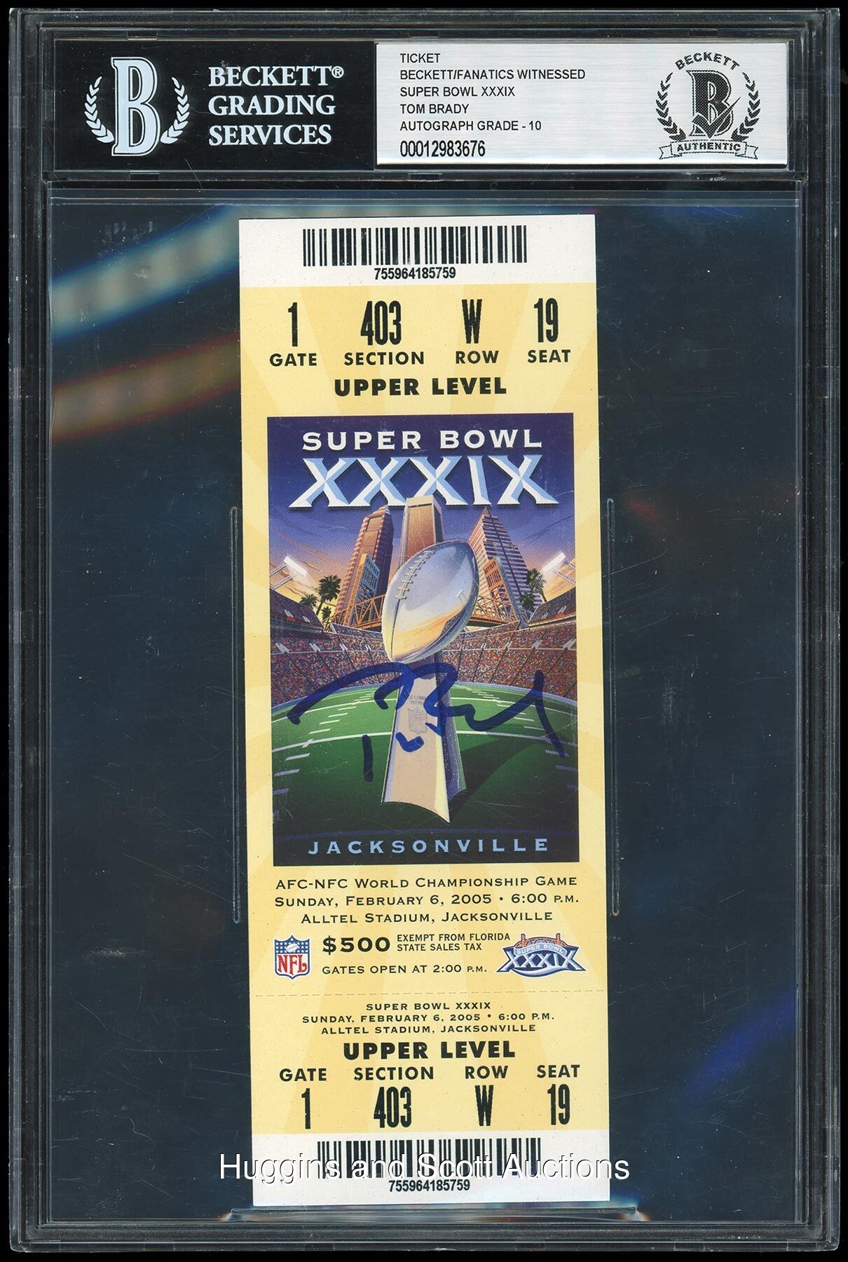 One of the seven Super Bowls won by the NFL's "GOAT" comes into play, with this Tom Brady autographed Super Bowl XXXIX full ticket. Dated 2/6/05, this ticket from Alltel Stadium in Jacksonville presents handsomely, and is encapsulated by BGS with an autograph grade of ("10"). In a thrilling match-up, Brady and his New England teammates held off a determined Philadelphia Eagles squad, for a 24-21 win in this game.