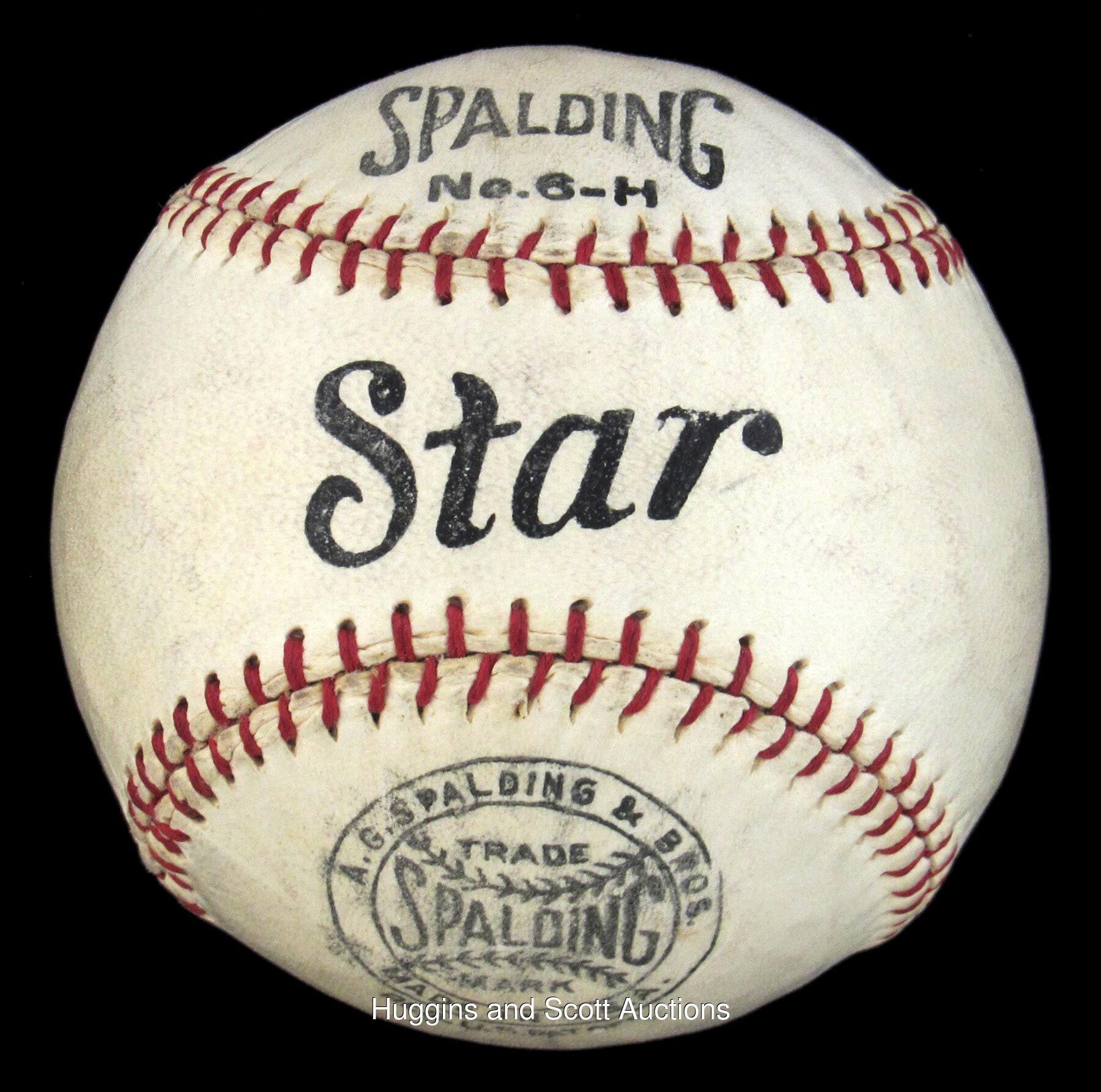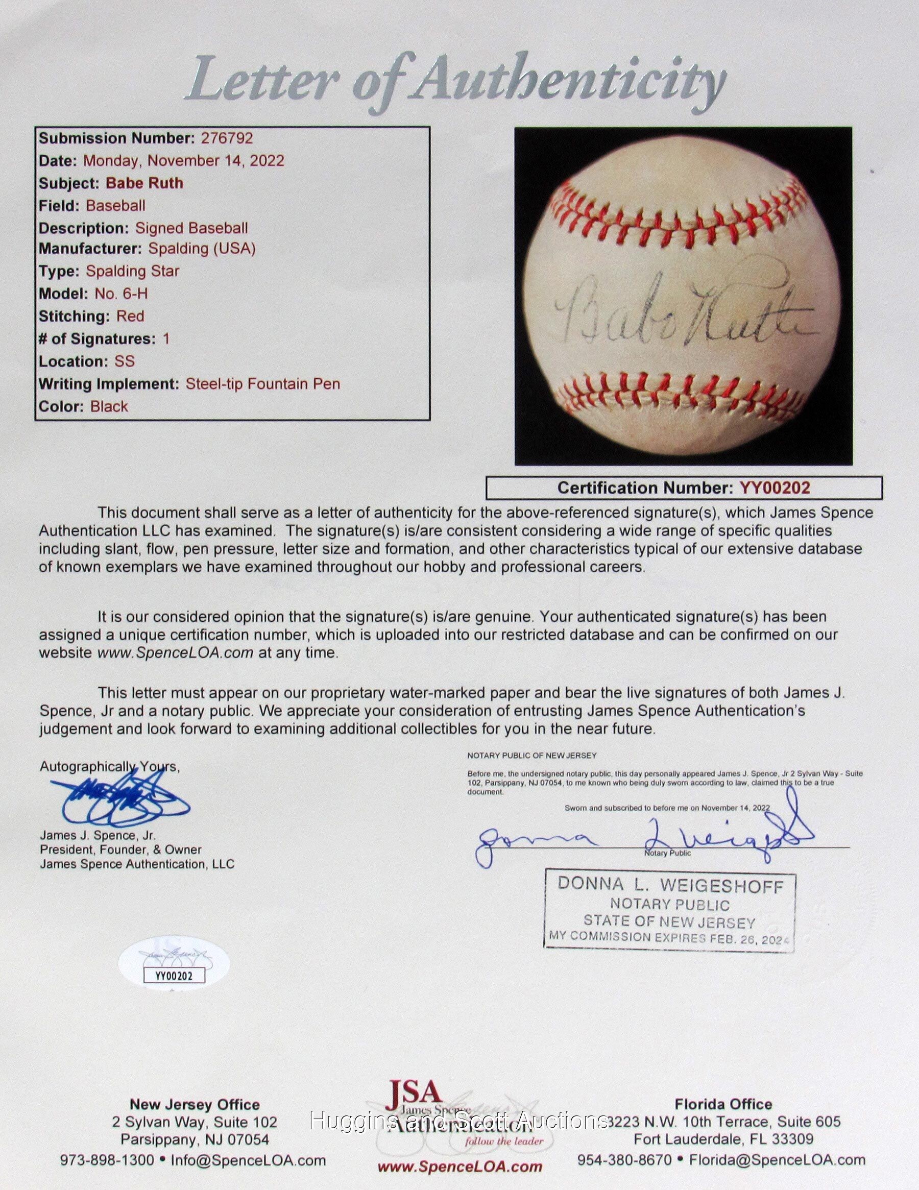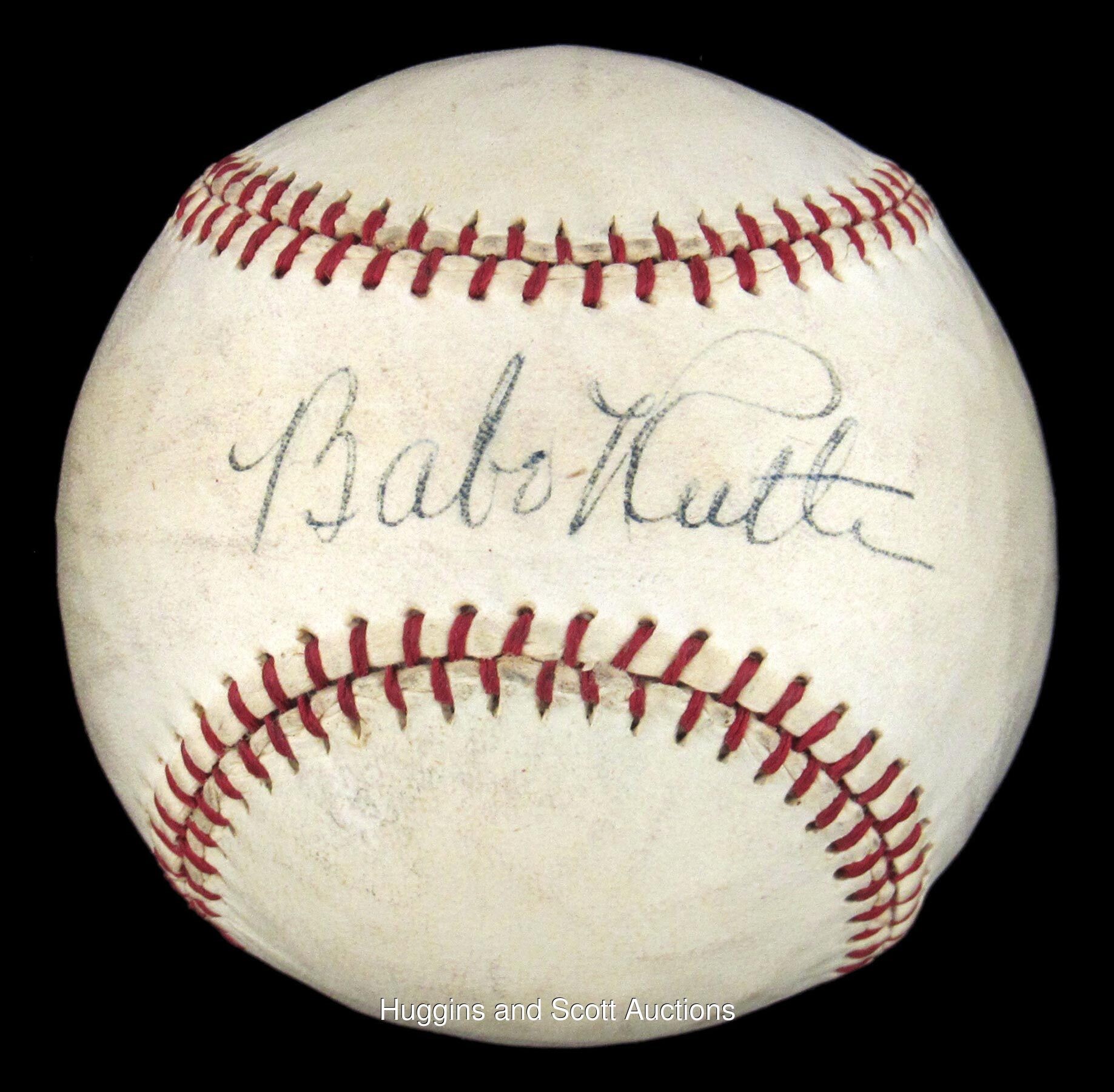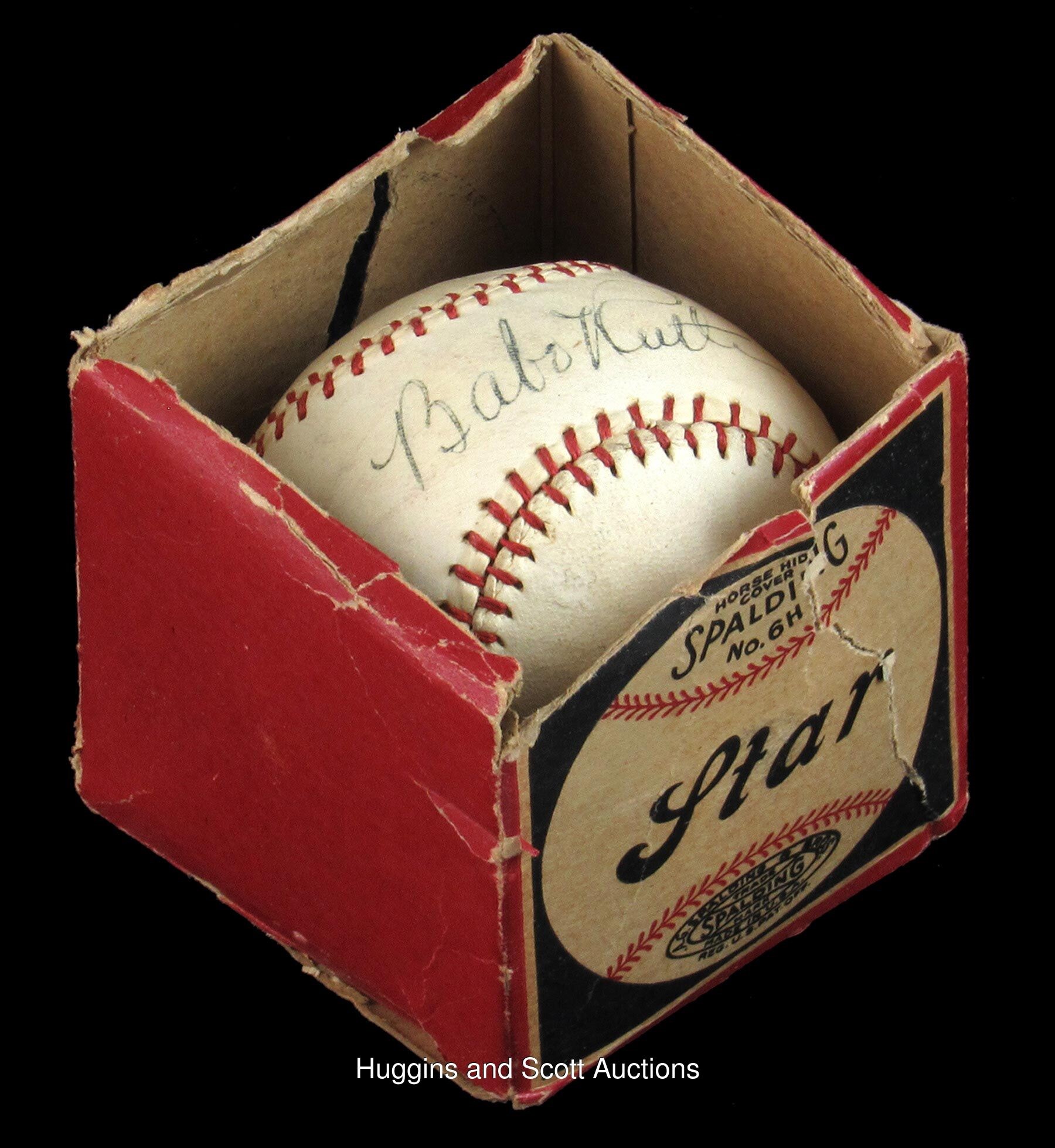 Every Ruth ball tells a story. This one"s story is, first, that it"s an upper mid-grade, borderline high-grade example with a minimally "7"-strength signature. All the hallmarks of Babe"s autograph artistry—from his bulbous "B" to the tall "b" to his looping "R" and crossed "th"—are here in spades. Not to mention that the elegant script is perfectly centered to boot. Next in our story comes the venerable manufacturer Spalding, whose "Star" model can often be traced to the iconic 1927 season, yet is likely later in this instance due to the absence of Ruth"s early-style quotation marks around "Babe." The lightly toned/scuffed ball concludes its story with the seldom-seen, mostly intact retail box, which remains bright and vibrant despite heavy wear throughout. As a point of reference on value, it"s worth noting that we sold a very similar quality Ruth ball way back in 2007 for over $40,000. Full LOA from JSA.