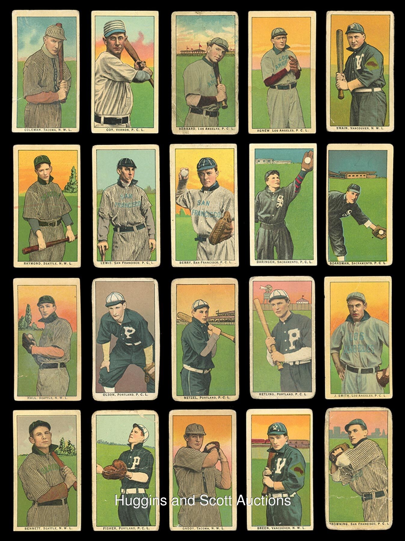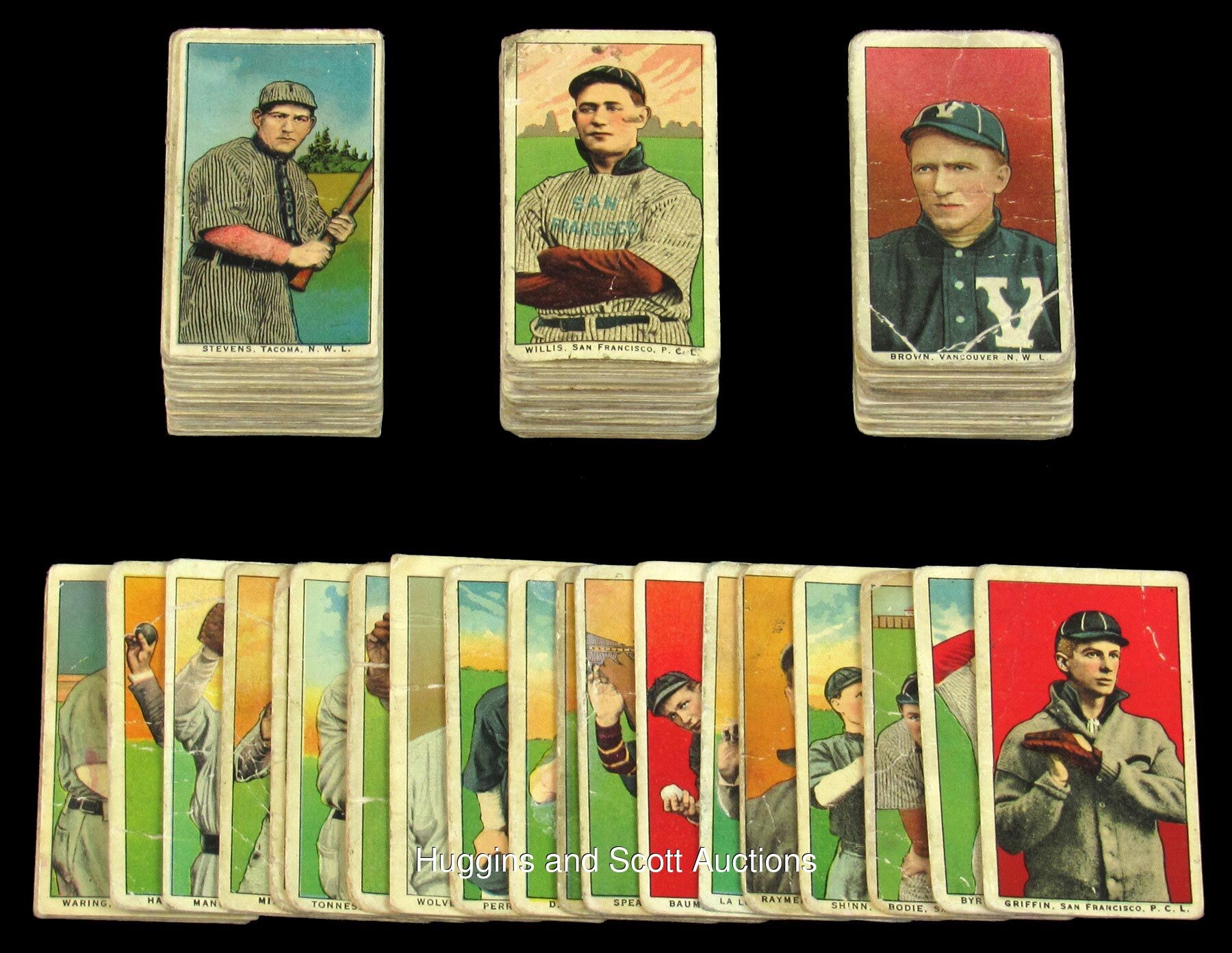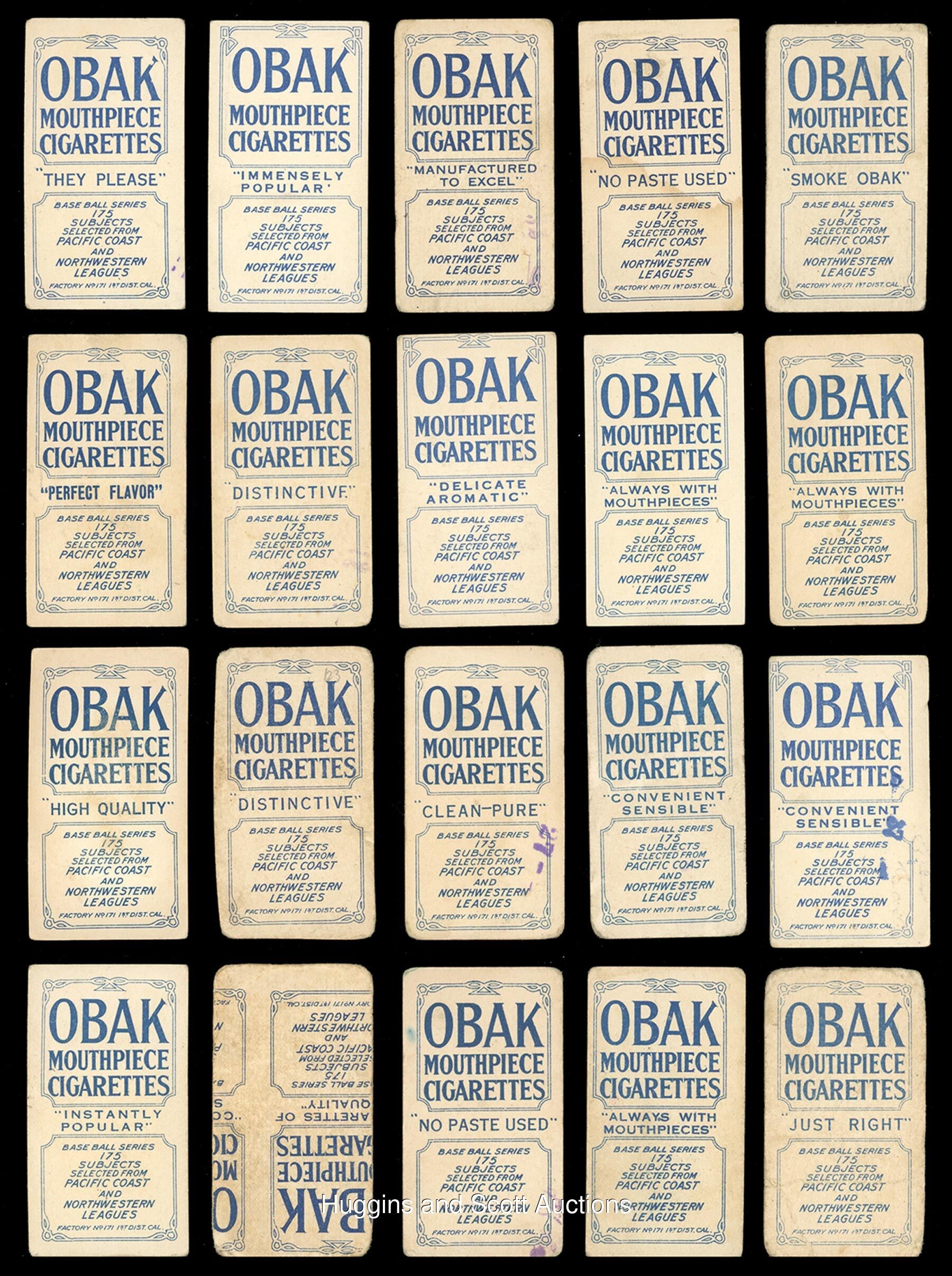 In this writer’s humble opinion, the 1910 T212 Obak edition is the most beautiful baseball tobacco card set ever issued. The characters, colorful team uniforms and PCL landscapes were gloriously crafted by the California branch of the American Tobacco Company. The offered complete set of (175) cards (175 Subjects back) may be short in player star power but is certainly long and expansive in eye appeal. The overall condition breakdown is as follows: 11% (FR or better) and 89% (PR or authentic) with nearly 45% displaying paper loss/residue, pin holes, tape repair, trimming and/or writing. Despite surviving in lower grade, this antique assembly is still quite attractive and nearly impossible to piece together as a full set over a century after release. Better cards include: Browning (PR, tough "Just Right" back) and Fisher (PR, Portland, upside down wrong back).