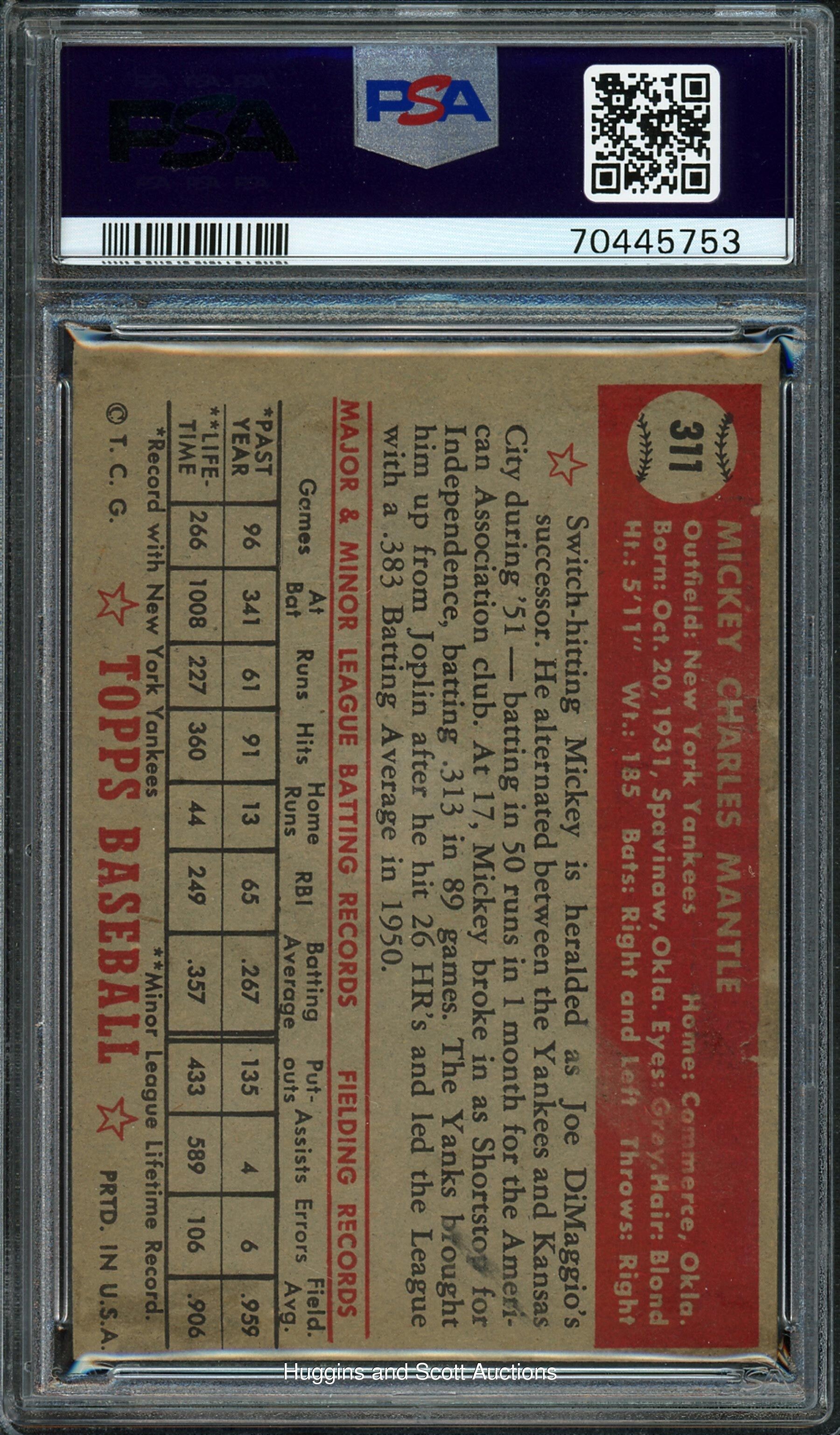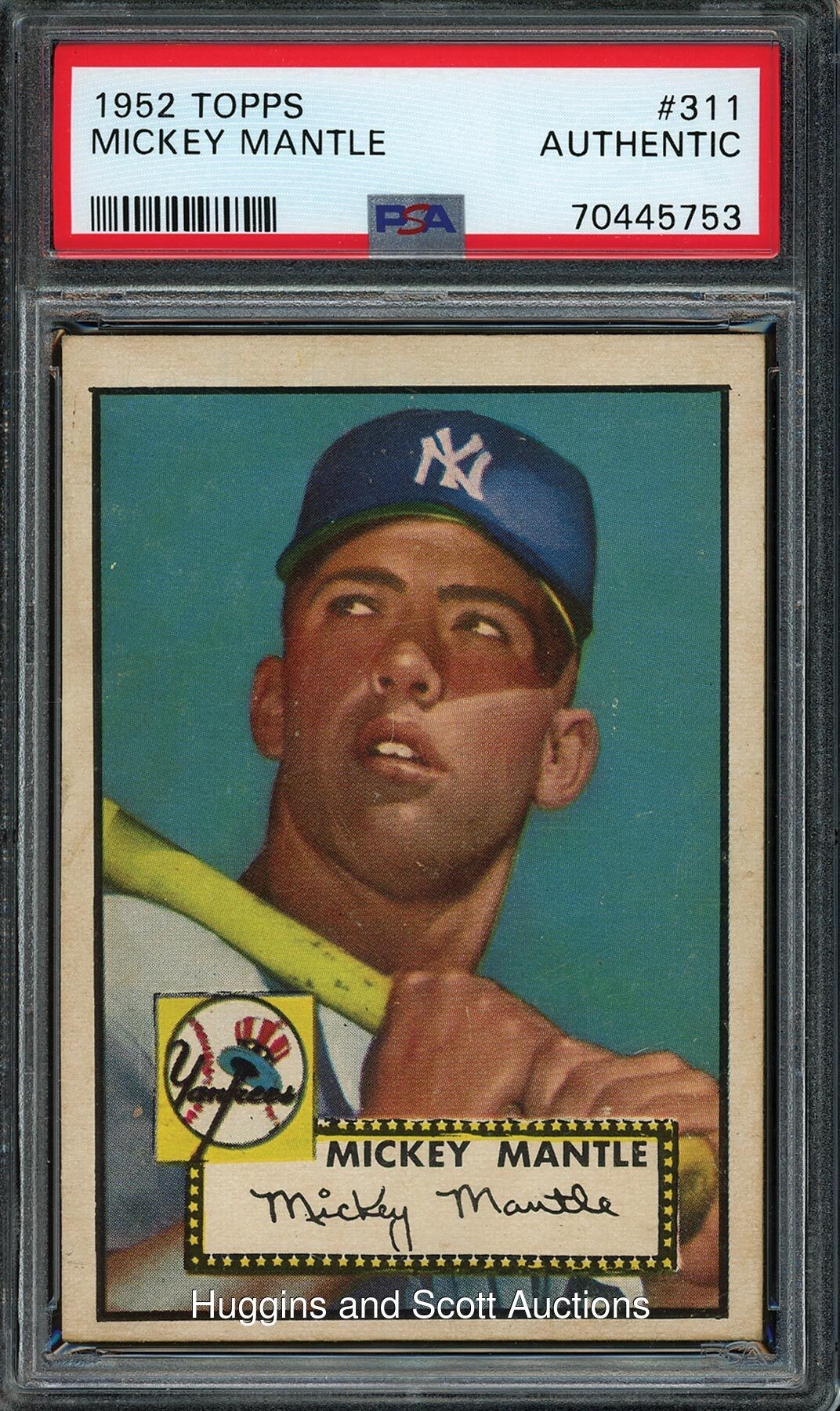 Incredible Eye Appeal! Graded Authentic by PSA. Want a genuine 1952 Topps Baseball #311 Mickey Mantle rookie with the appearance of a mid-grade example? This high number of "Joe DiMaggio"s successor" presents magnificently with barely touched corners, fresh edges and a crease-free surface with perfectly contrasted imagery. The technical grade is arrived at by the occurrence of a thin coating of reverse residue along Mantle"s name section and trace material near the bottom right corner. This modern masterpiece stands alone as the standard bearer of the post-war collecting hobby. A transcendent piece in the industry, this high number of the New York Yankees icon is a linchpin for those pursuing the 1952 Topps Baseball edition. While the boyhood hero to millions is typically discovered with a myriad of condition flaws, this “Commerce Comet” has escaped such handling and is "a must" for serious collectors.