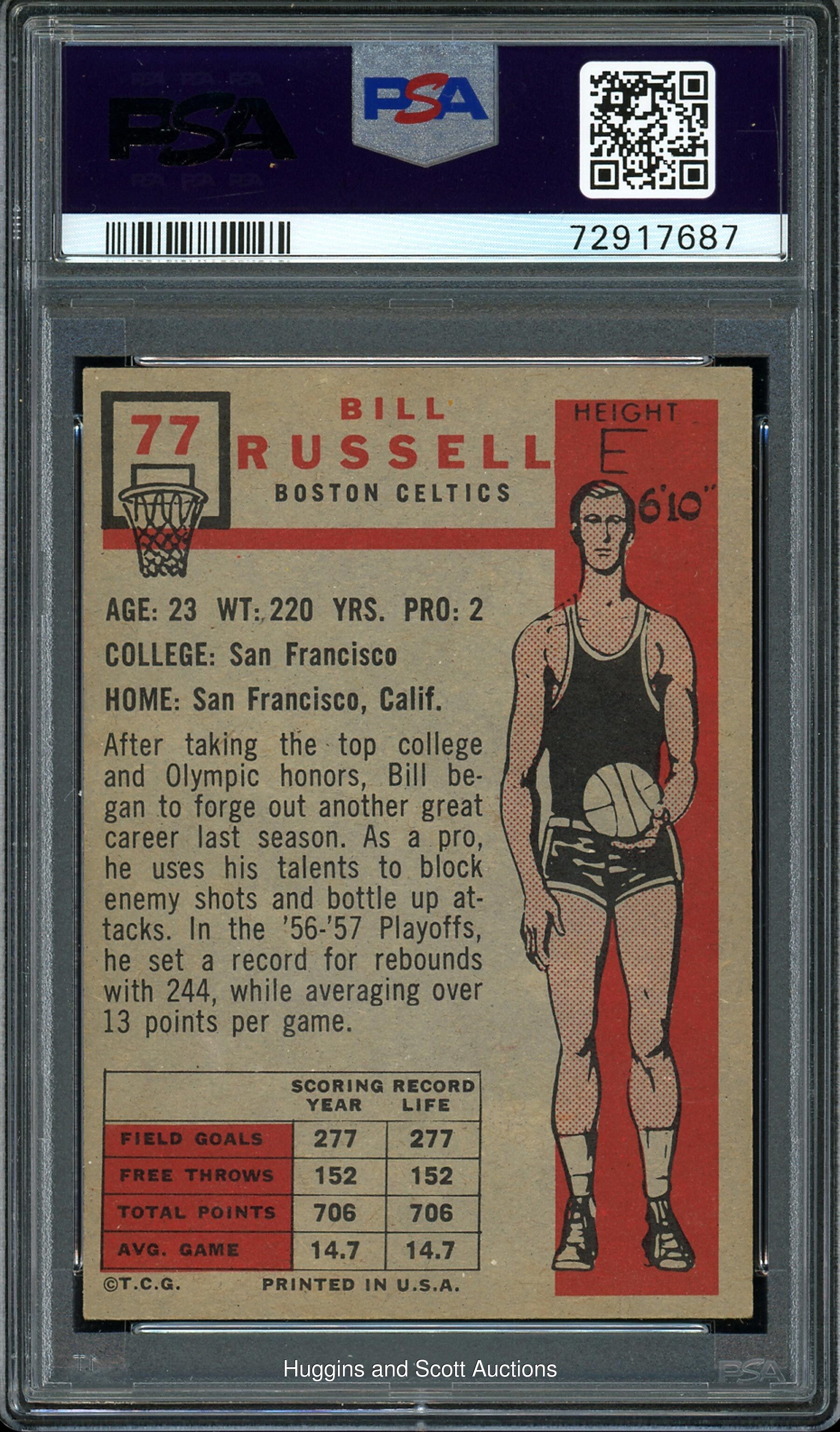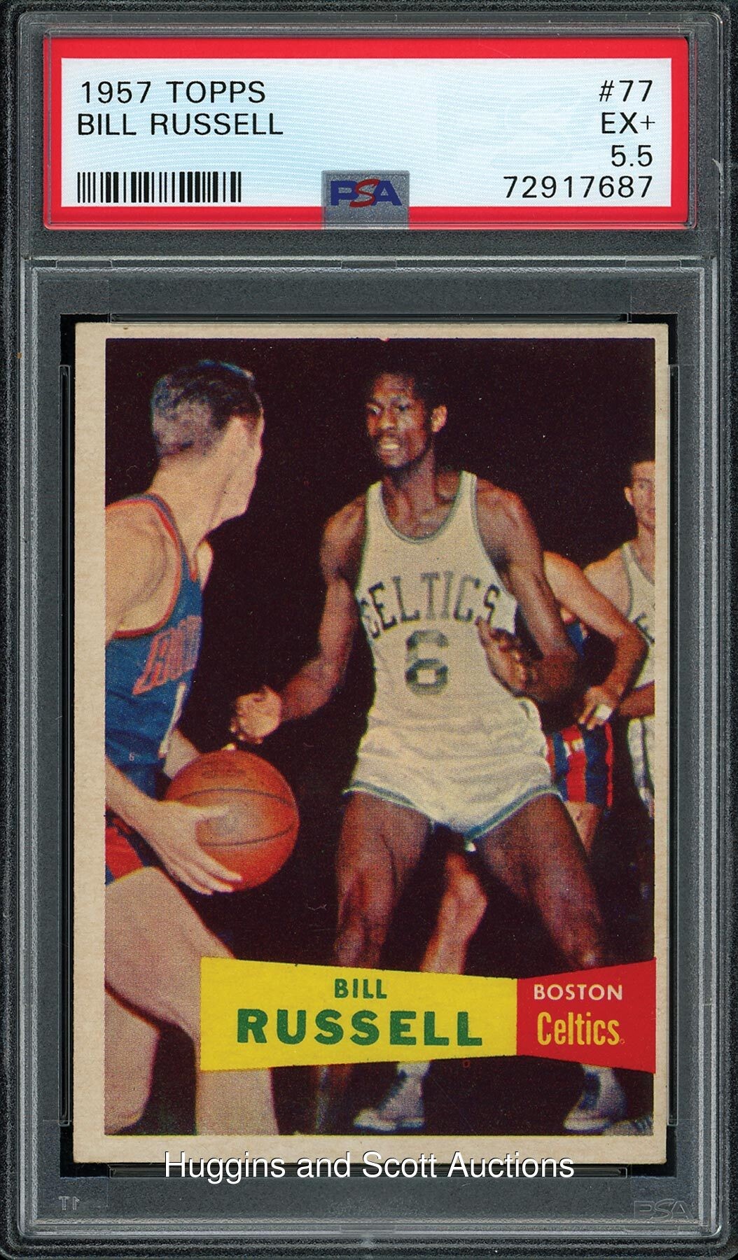 Graded EX+ 5.5 by PSA. The transformational Bill Russell is proudly pictured on his 1957-58 Topps Basketball #77 rookie card. With 11 NBA championships and countless accolades to his Hall of Fame resume, "The Secretary of Defense" stonewalls an opposing ballhandler on this cardboard cornerstone. The shortprint is amplified by bold surface colors and intense in-game imagery that is framed by barely touched corners, off-white edges and a clean "tape measure" reverse.