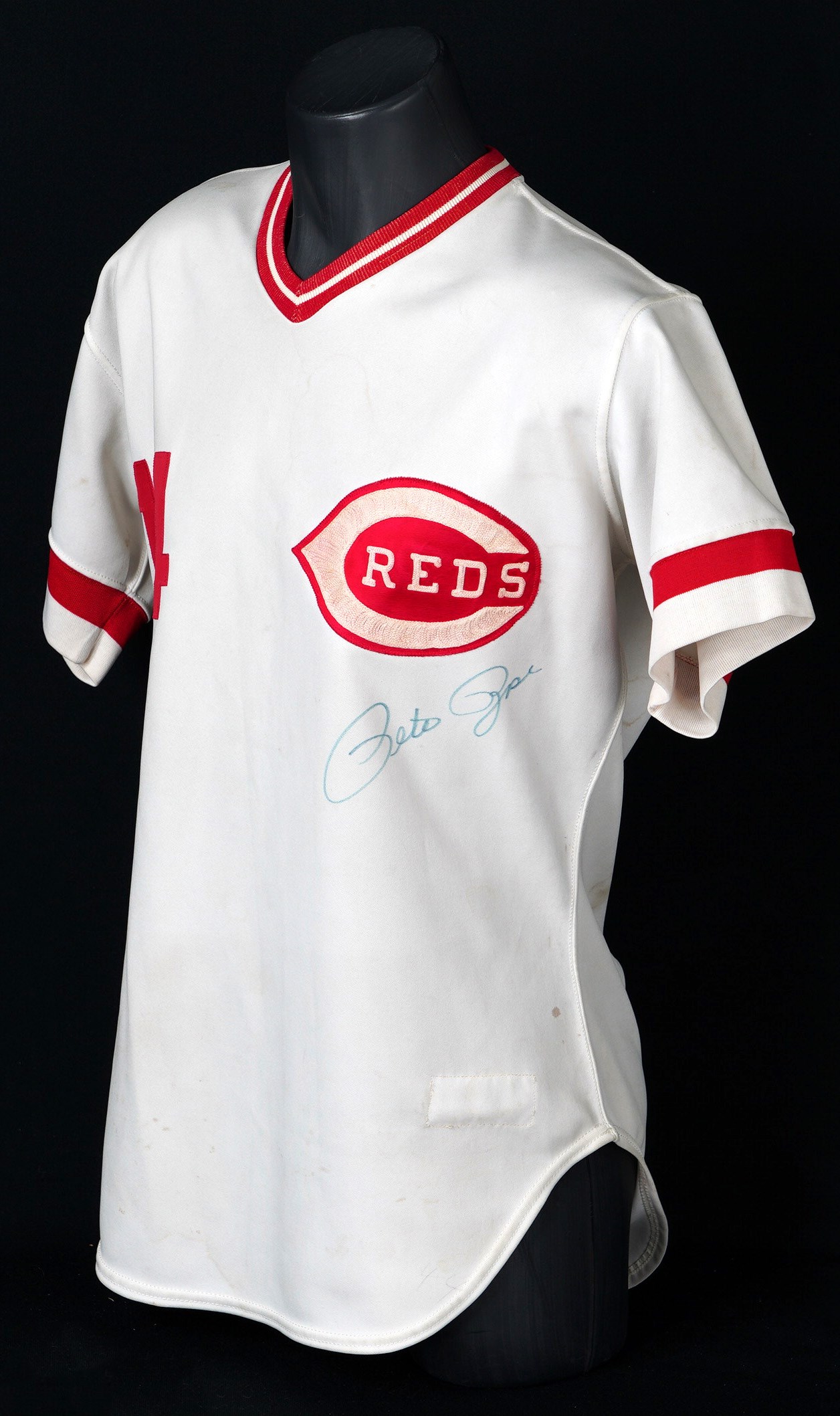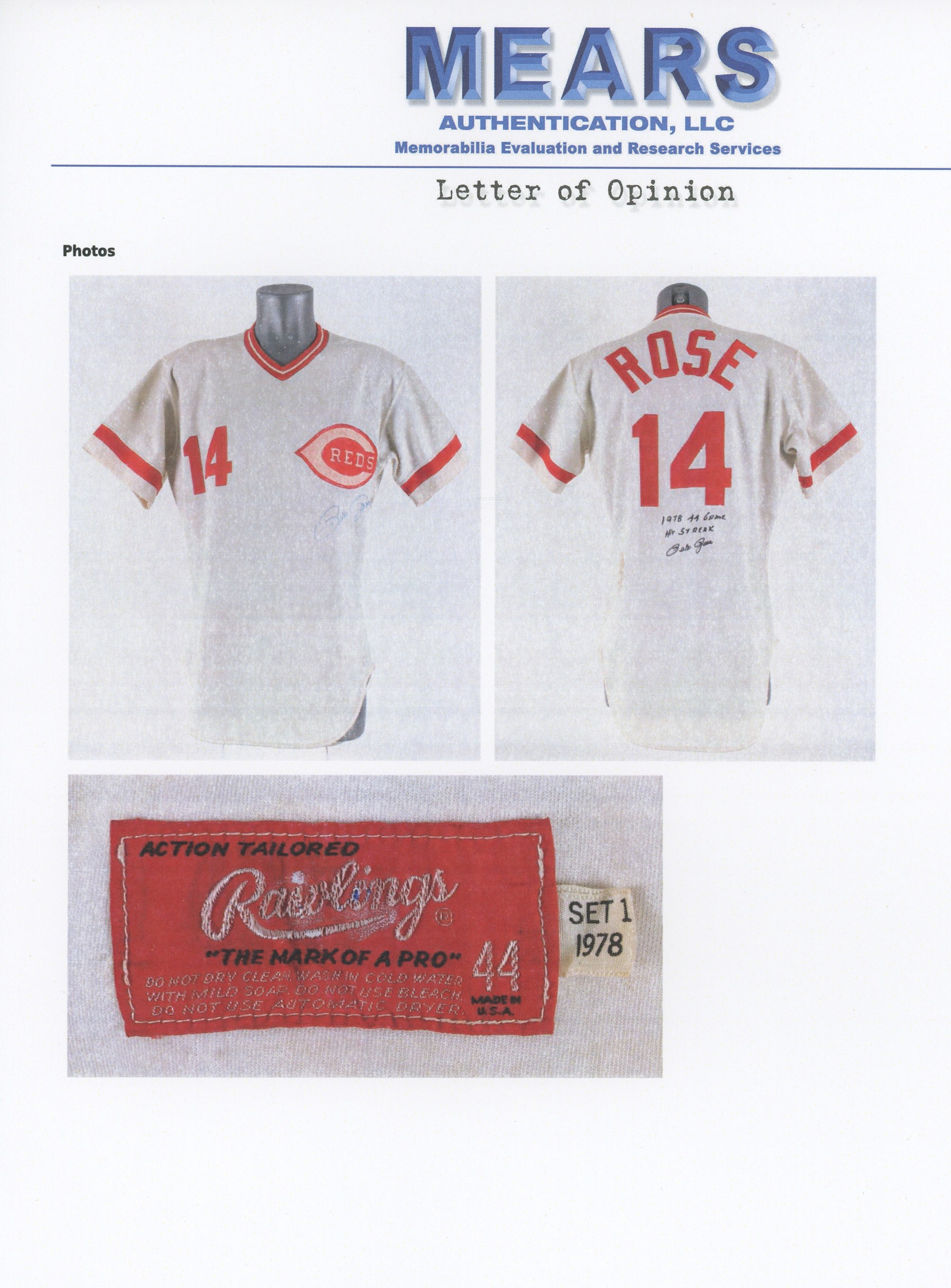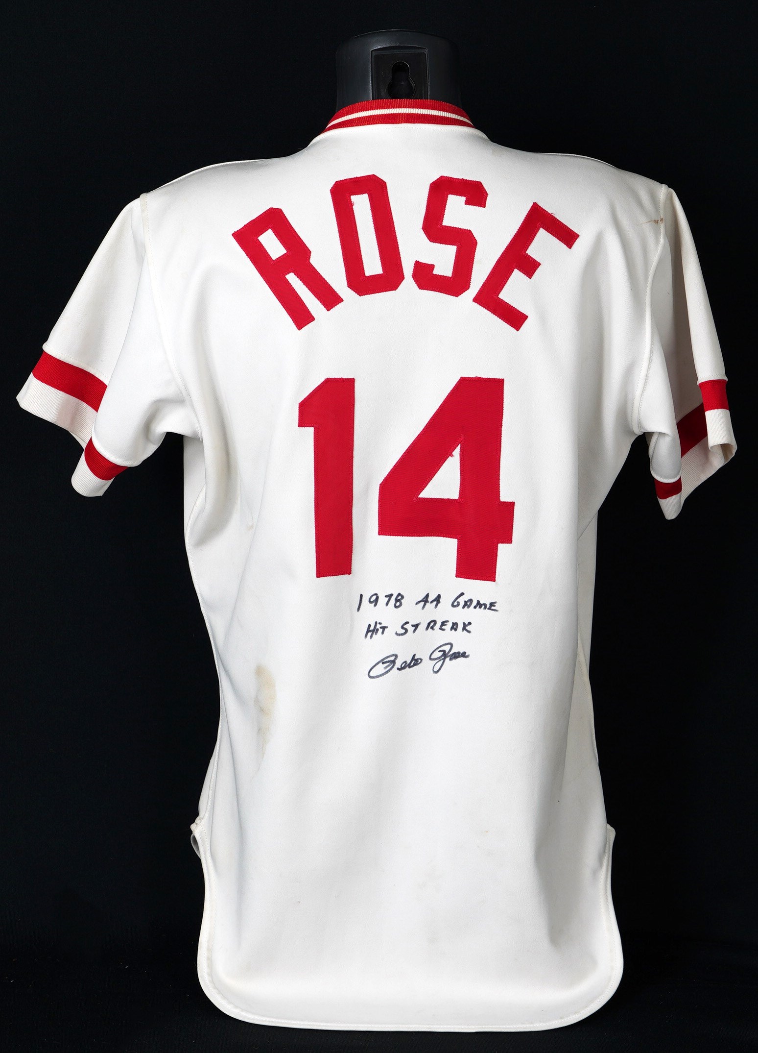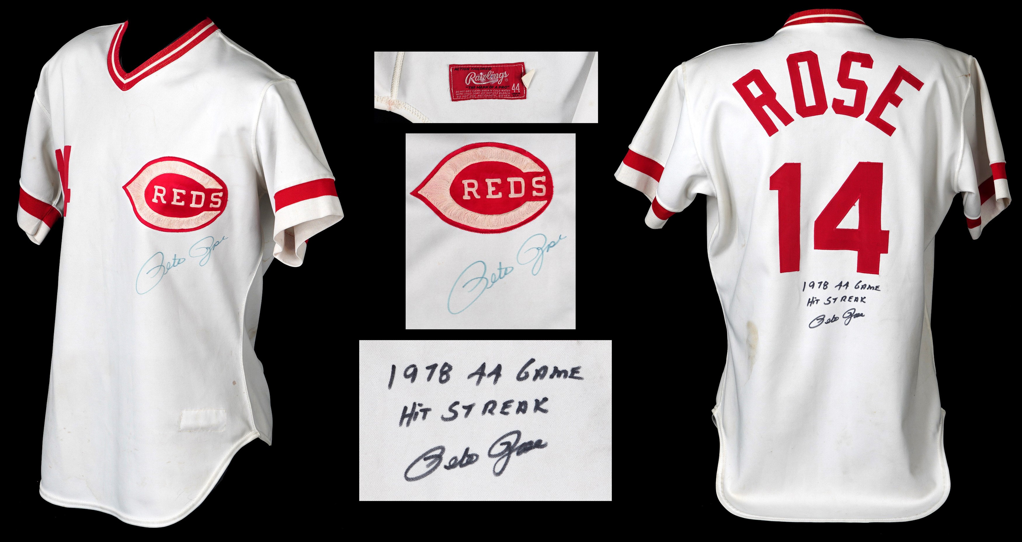 In a career filled with great years, 1978 stands out as a big season for the recently departed Pete Rose. From Rose's final year of his first stint with the Cincinnati Reds comes this 1978 game-used home jersey. During the magical '78 season Rose recorded his 3,000th career hit on May 5th, on his home turf at Riverfront Stadium, to become the 13th member of the "3,000 Hit Club". Five weeks later Rose started a hitting streak that went on for 44 games and tied the NL record. A battler through every single action he ever took on a baseball diamond, Rose relentlessly squeezed every drop of talent and ability out of his body and mind, taking great pride in his countless accomplishments. Owning a jersey "Charlie Hustle" actually wore during his historic '78 campaign, gives real meaning to the expression "pride of ownership"! This vintage gamer shows excellent signs of authentic use/wear, including multiple stains, some of which appear to be blood. Rose has signed this game-used jersey on both the front and back. Located below the Reds logo patch on the left breast, the autograph on the front is slightly faded to the ("8.5") strength. The signature on the back is outstanding, radiating ("9.5") potency. Positioned below his name and number "14" patches, this bold autograph is accompanied by the thrilling inscription "1978 44 Game Hit Streak". A Rawlings factory label inside the front tail, indicates the jersey size "44". Adjacent to the factory label is an identifier tag that reads "Set 1 1978," for the uniform set number and the season date. Our consignor has provided a handwritten letter of provenance from a Cincinnati dealer stating he bought this jerseys and several others in the early 1980s, from Rose's first wife, who was divorced from Rose in 1980. The accompanying LOA from Mears assigns this 1978 Pete Rose Cincinnati Reds home jersey, a grade of "A9.5". There is also a placard from the Cincinnati Reds Hall of Fame, where the jersey was once displayed. Full LOA from MEARS for the jersey game-use. Auction LOA from James Spence/JSA for the two autographs. Opening Bid $5,000.