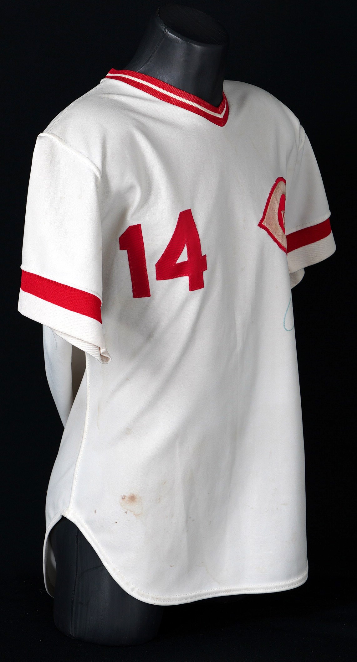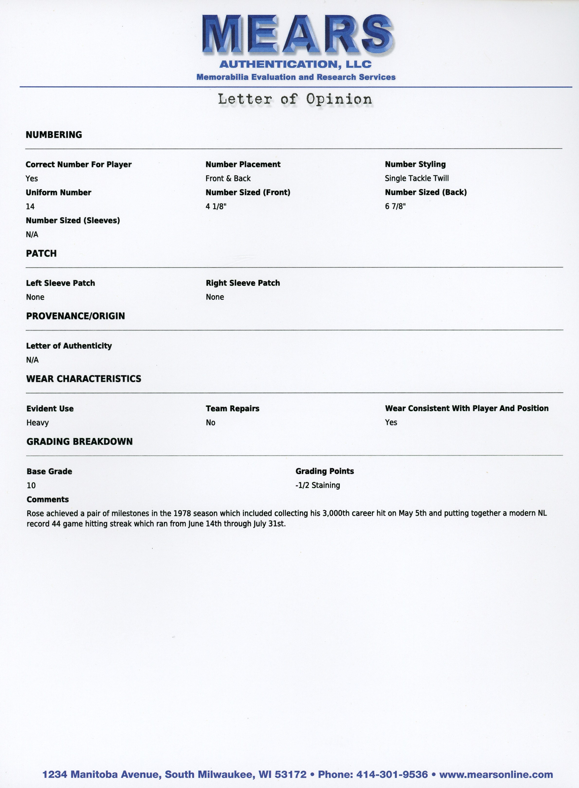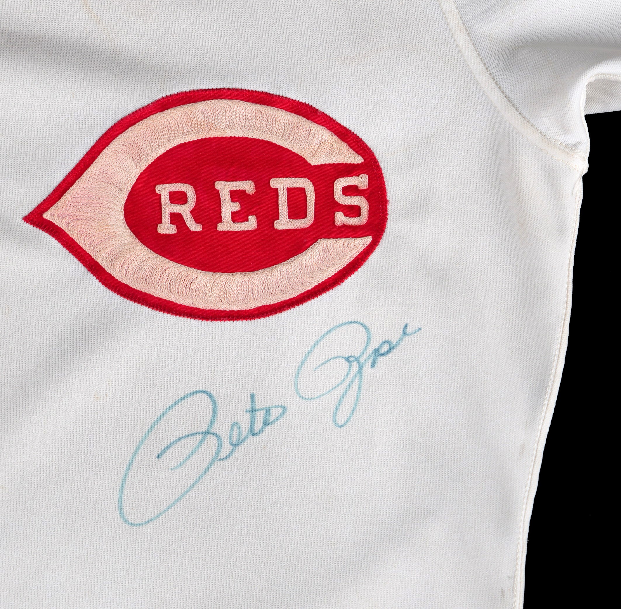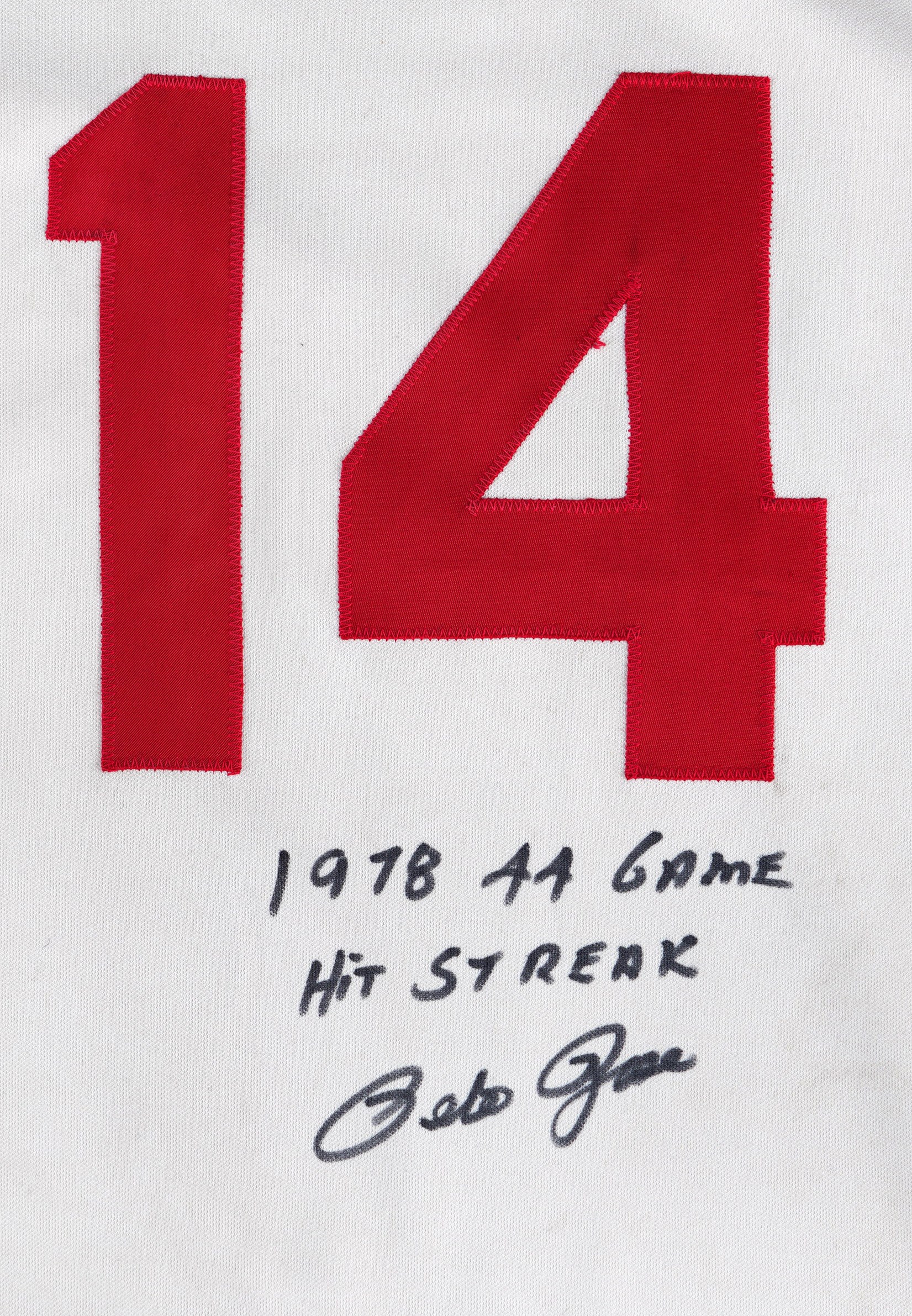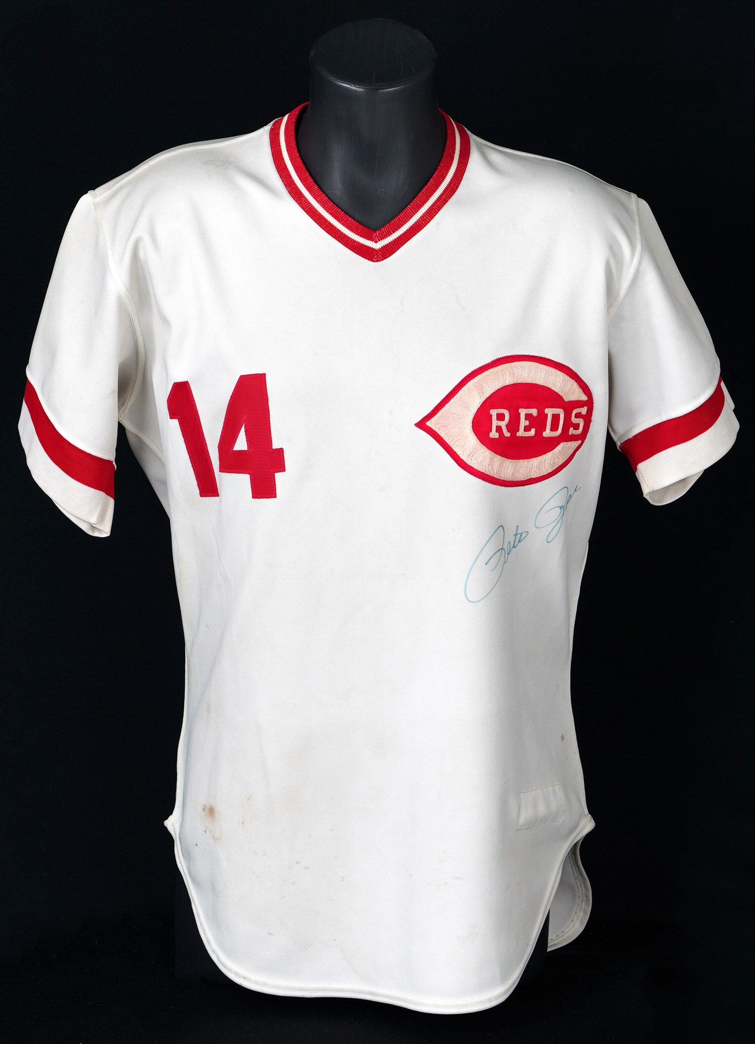 In a career filled with great years, 1978 stands out as a big season for the recently departed Pete Rose. From Rose's final year of his first stint with the Cincinnati Reds comes this 1978 game-used home jersey. During the magical '78 season Rose recorded his 3,000th career hit on May 5th, on his home turf at Riverfront Stadium, to become the 13th member of the "3,000 Hit Club". Five weeks later Rose started a hitting streak that went on for 44 games and tied the NL record. A battler through every single action he ever took on a baseball diamond, Rose relentlessly squeezed every drop of talent and ability out of his body and mind, taking great pride in his countless accomplishments. Owning a jersey "Charlie Hustle" actually wore during his historic '78 campaign, gives real meaning to the expression "pride of ownership"! This vintage gamer shows excellent signs of authentic use/wear, including multiple stains, some of which appear to be blood. Rose has signed this game-used jersey on both the front and back. Located below the Reds logo patch on the left breast, the autograph on the front is slightly faded to the ("8.5") strength. The signature on the back is outstanding, radiating ("9.5") potency. Positioned below his name and number "14" patches, this bold autograph is accompanied by the thrilling inscription "1978 44 Game Hit Streak". A Rawlings factory label inside the front tail, indicates the jersey size "44". Adjacent to the factory label is an identifier tag that reads "Set 1 1978," for the uniform set number and the season date. Our consignor has provided a handwritten letter of provenance from a Cincinnati dealer stating he bought this jerseys and several others in the early 1980s, from Rose's first wife, who was divorced from Rose in 1980. The accompanying LOA from Mears assigns this 1978 Pete Rose Cincinnati Reds home jersey, a grade of "A9.5". There is also a placard from the Cincinnati Reds Hall of Fame, where the jersey was once displayed. Full LOA from MEARS for the jersey game-use. Auction LOA from James Spence/JSA for the two autographs. Opening Bid $5,000.