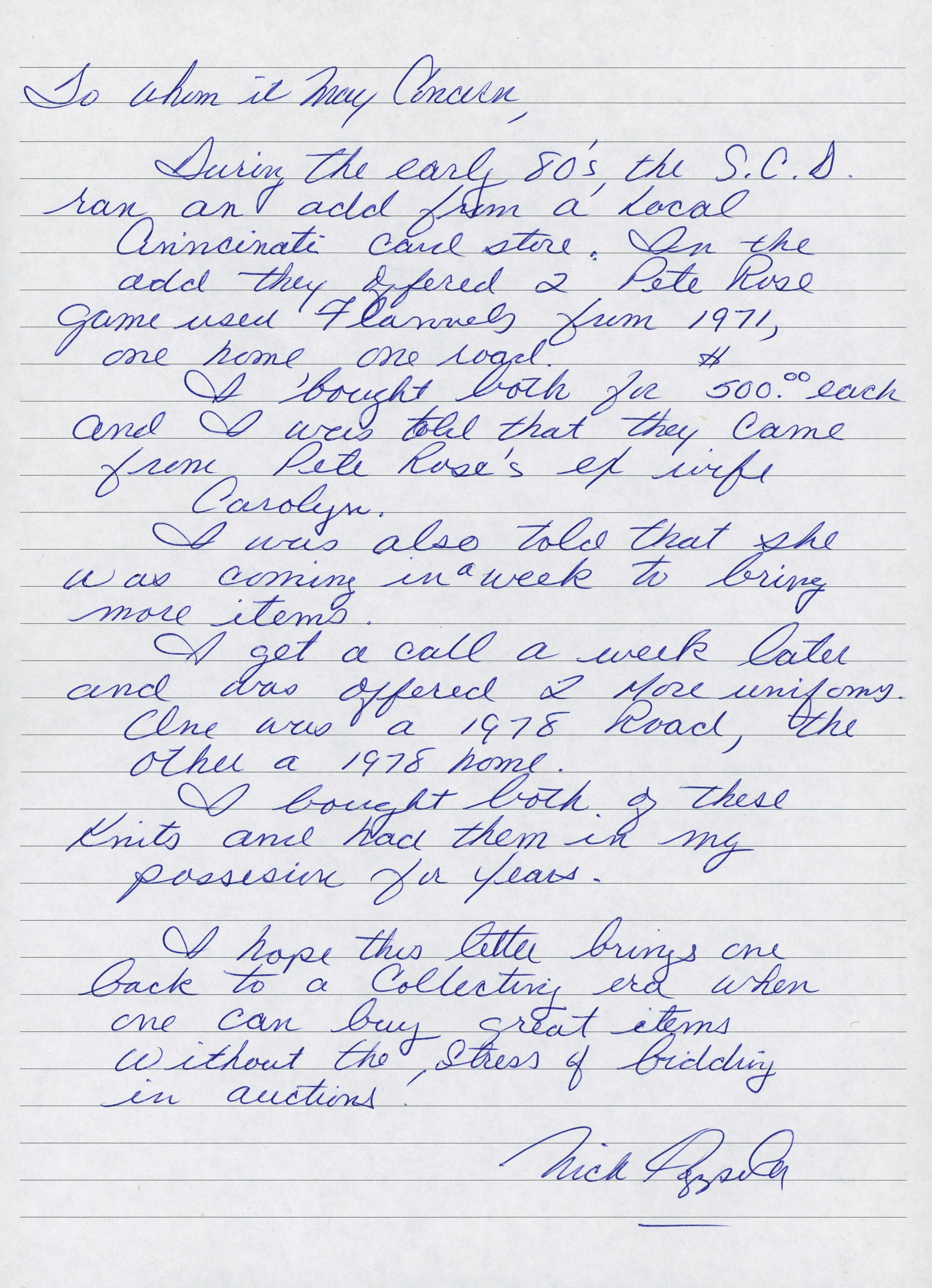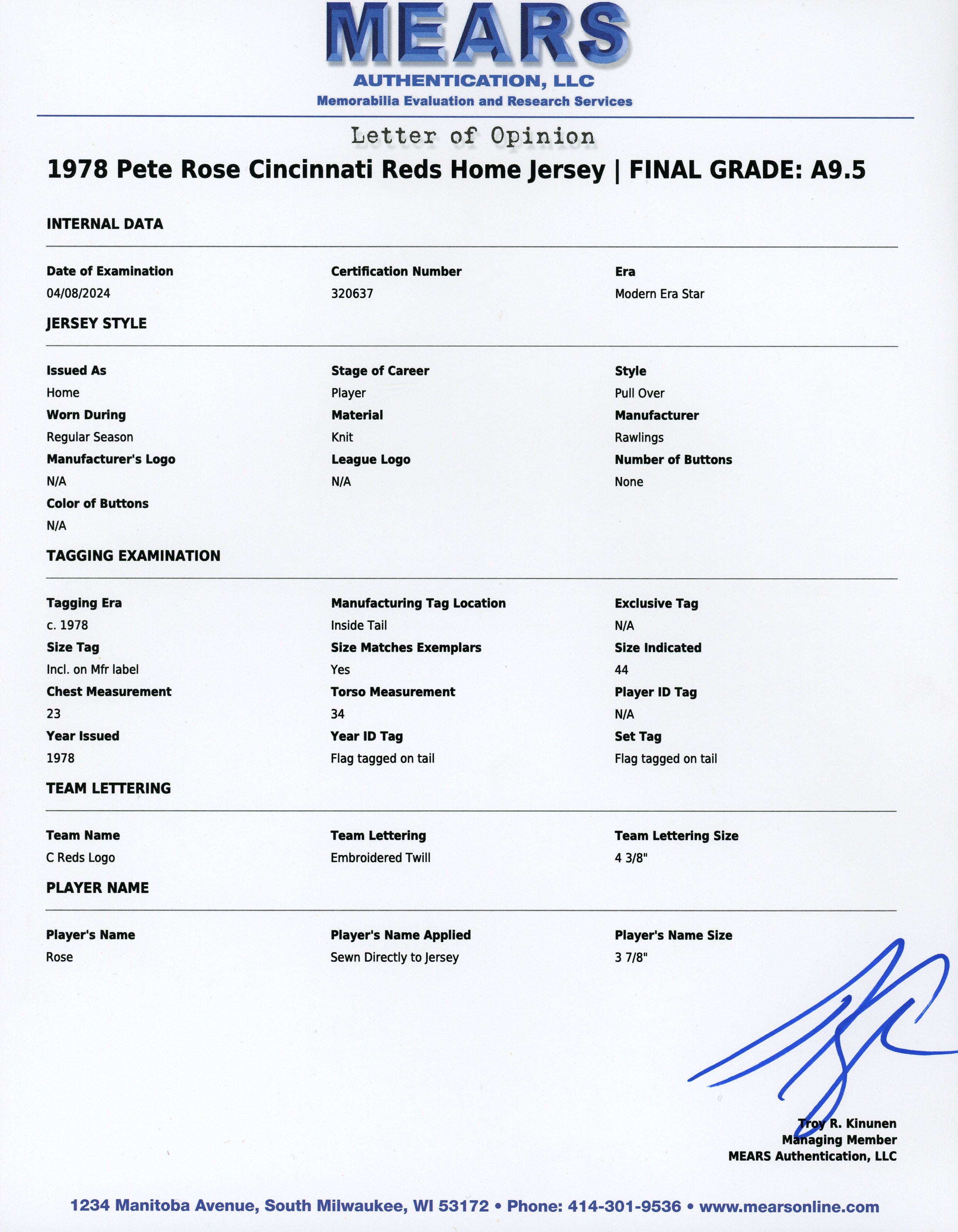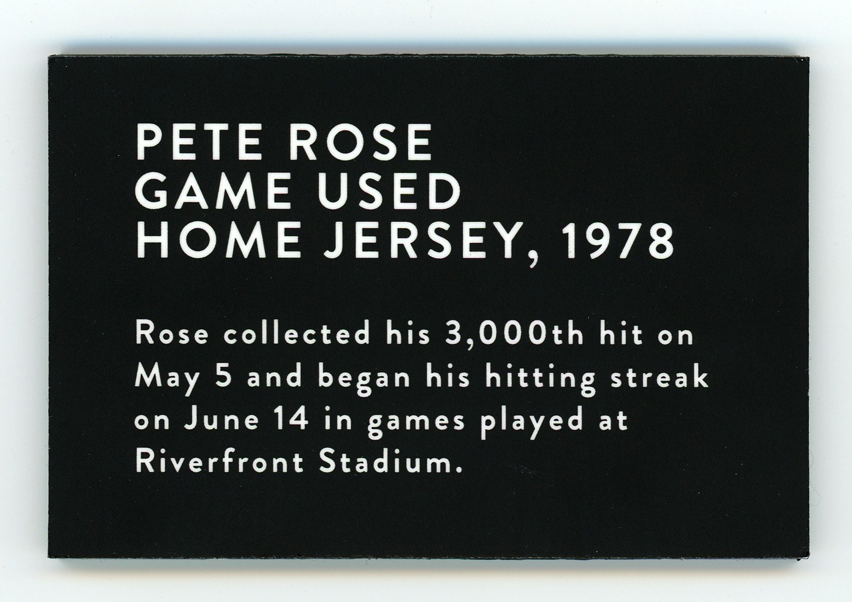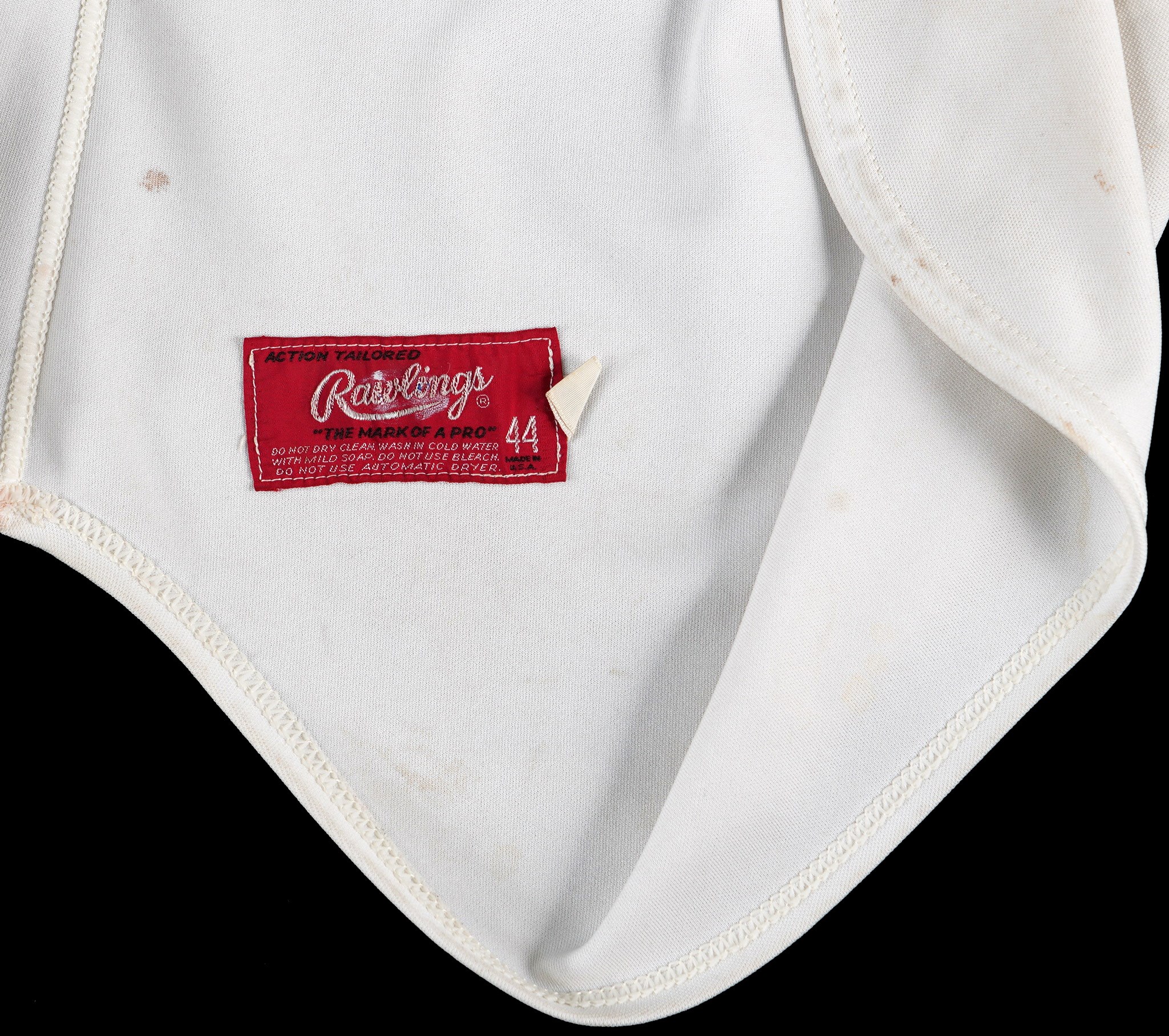 In a career filled with great years, 1978 stands out as a big season for the recently departed Pete Rose. From Rose's final year of his first stint with the Cincinnati Reds comes this 1978 game-used home jersey. During the magical '78 season Rose recorded his 3,000th career hit on May 5th, on his home turf at Riverfront Stadium, to become the 13th member of the "3,000 Hit Club". Five weeks later Rose started a hitting streak that went on for 44 games and tied the NL record. A battler through every single action he ever took on a baseball diamond, Rose relentlessly squeezed every drop of talent and ability out of his body and mind, taking great pride in his countless accomplishments. Owning a jersey "Charlie Hustle" actually wore during his historic '78 campaign, gives real meaning to the expression "pride of ownership"! This vintage gamer shows excellent signs of authentic use/wear, including multiple stains, some of which appear to be blood. Rose has signed this game-used jersey on both the front and back. Located below the Reds logo patch on the left breast, the autograph on the front is slightly faded to the ("8.5") strength. The signature on the back is outstanding, radiating ("9.5") potency. Positioned below his name and number "14" patches, this bold autograph is accompanied by the thrilling inscription "1978 44 Game Hit Streak". A Rawlings factory label inside the front tail, indicates the jersey size "44". Adjacent to the factory label is an identifier tag that reads "Set 1 1978," for the uniform set number and the season date. Our consignor has provided a handwritten letter of provenance from a Cincinnati dealer stating he bought this jerseys and several others in the early 1980s, from Rose's first wife, who was divorced from Rose in 1980. The accompanying LOA from Mears assigns this 1978 Pete Rose Cincinnati Reds home jersey, a grade of "A9.5". There is also a placard from the Cincinnati Reds Hall of Fame, where the jersey was once displayed. Full LOA from MEARS for the jersey game-use. Auction LOA from James Spence/JSA for the two autographs. Opening Bid $5,000.